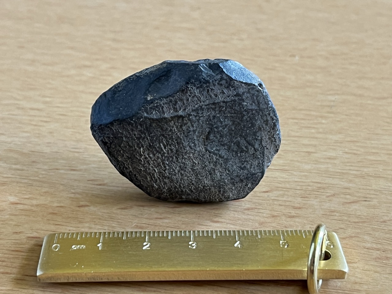 Das Material ist ein sehr hartes Felsgestein, etwas Kortex ist an unberiebenen Flächen an den Seiten noch als seidig glänzend zu erkennen. Die Form ähnelt einer halben Herzmuschel, die Oberseite gleichmäßig gewölbt, die Unterseite beinahe plan, eine leichte Innenwölbung zur mutmaßlichen Schneide hin ist wahrnehmbar. Ein rezenter kleiner Abbruch vorne rechts.