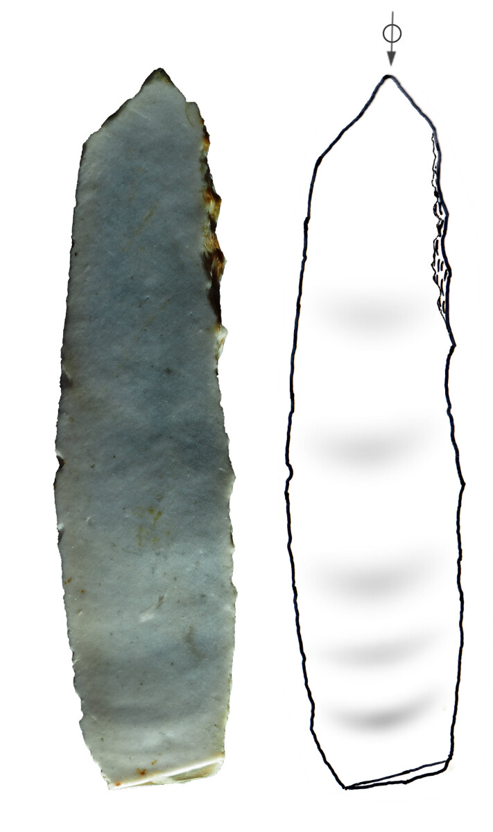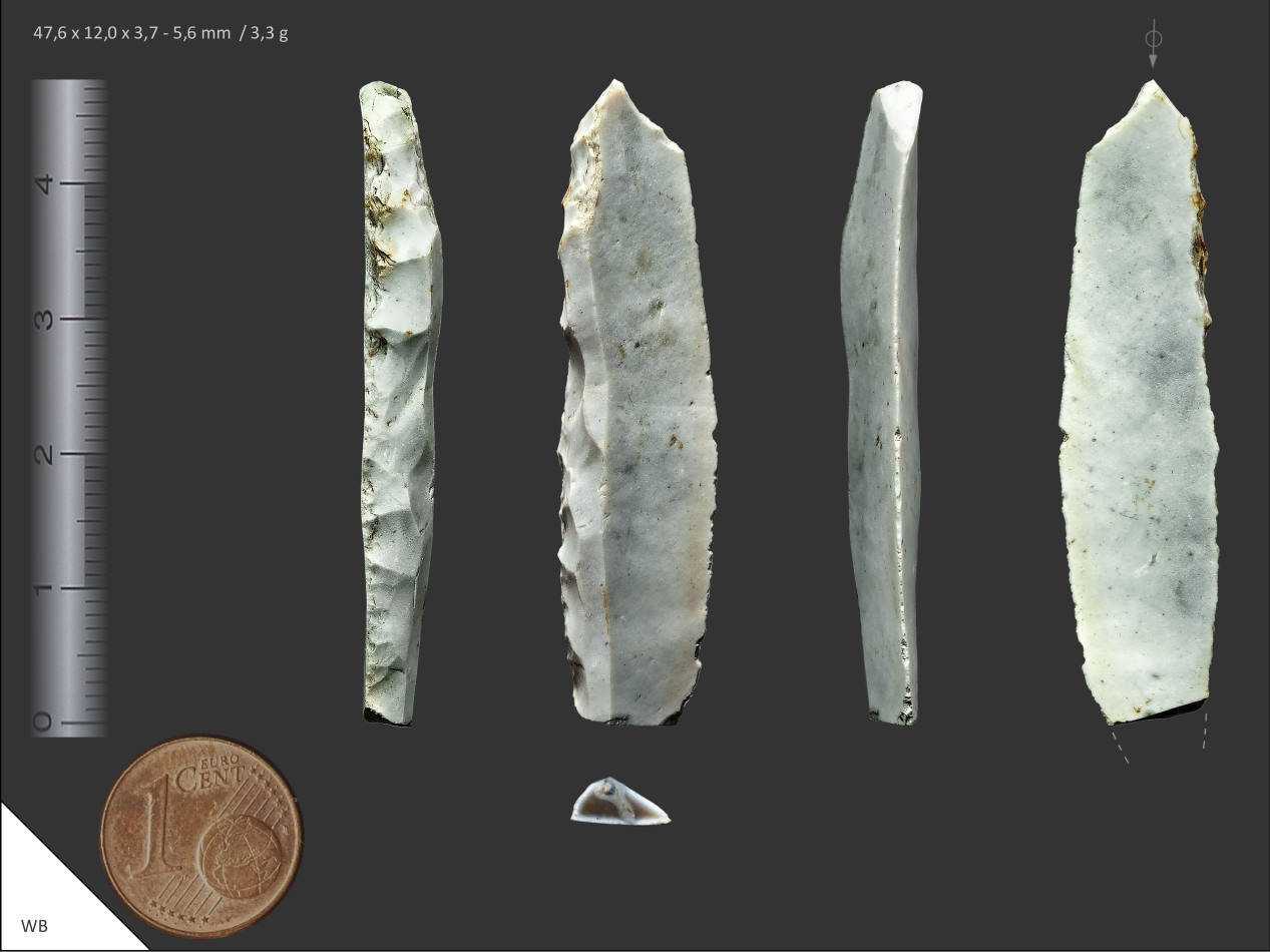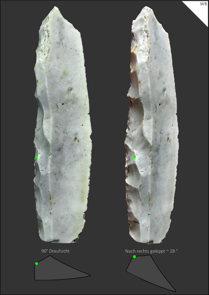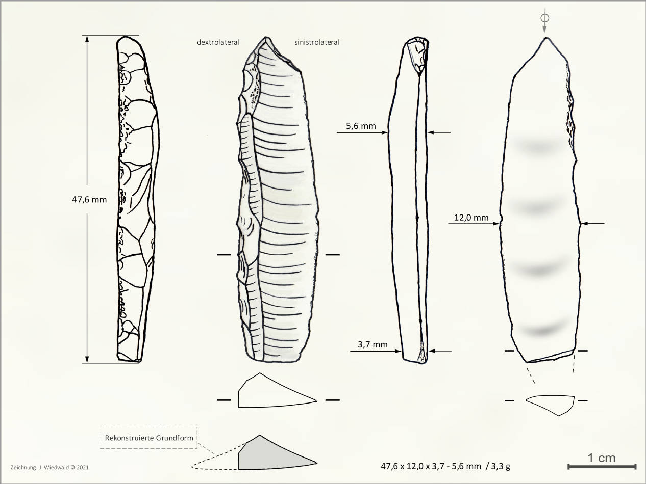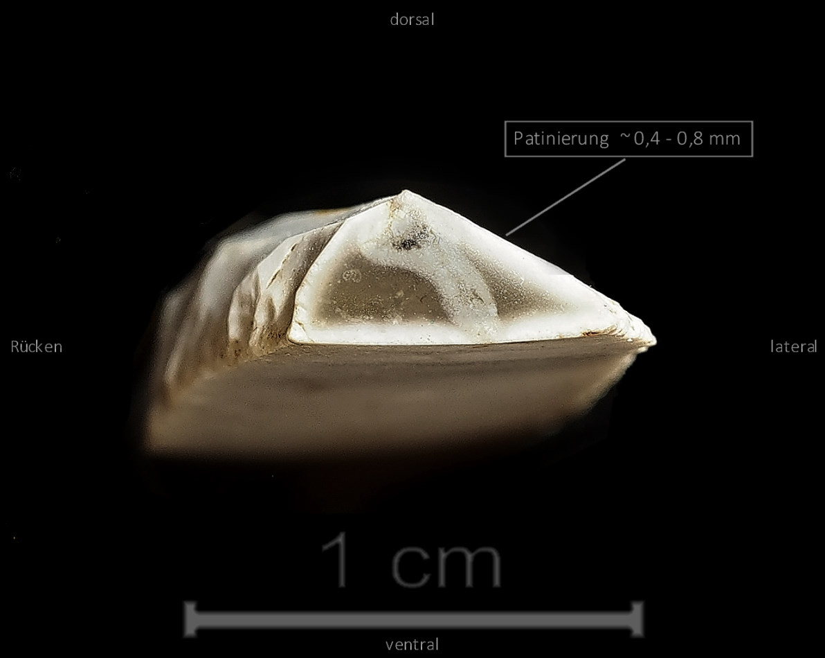 Die Rückenretusche (von ventral nach dorsal) ist über die gesamte Laterale durchgehend,