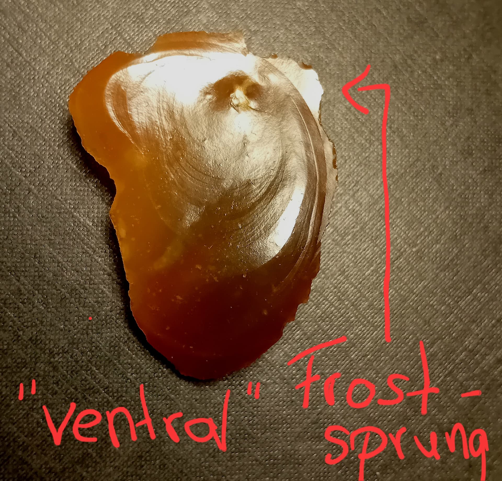 Der blaue Fund präsentiert sich mit einer scharfen Kante (pink). Der vermeintliche Abschlagpunkt, diese Kerbe (>), ist jedoch der natürliche 1. Frostsprung - von daher fehlt dort ein Bulbus.