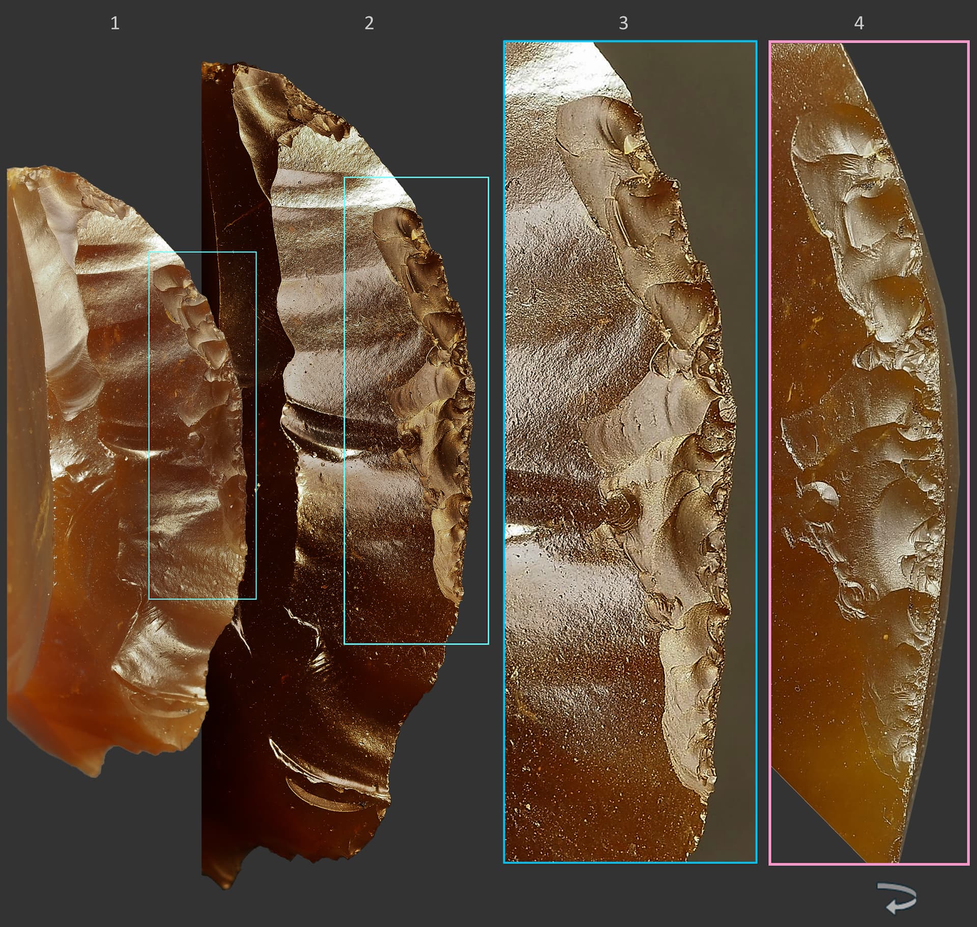 Im Vergleich zu Retuschen an eindeutigen Werkzeugtypen (Sicheln, Kratzerkappen, Endretuschen) machen diese Absplitterungen an der Stelle keinen Sinn.