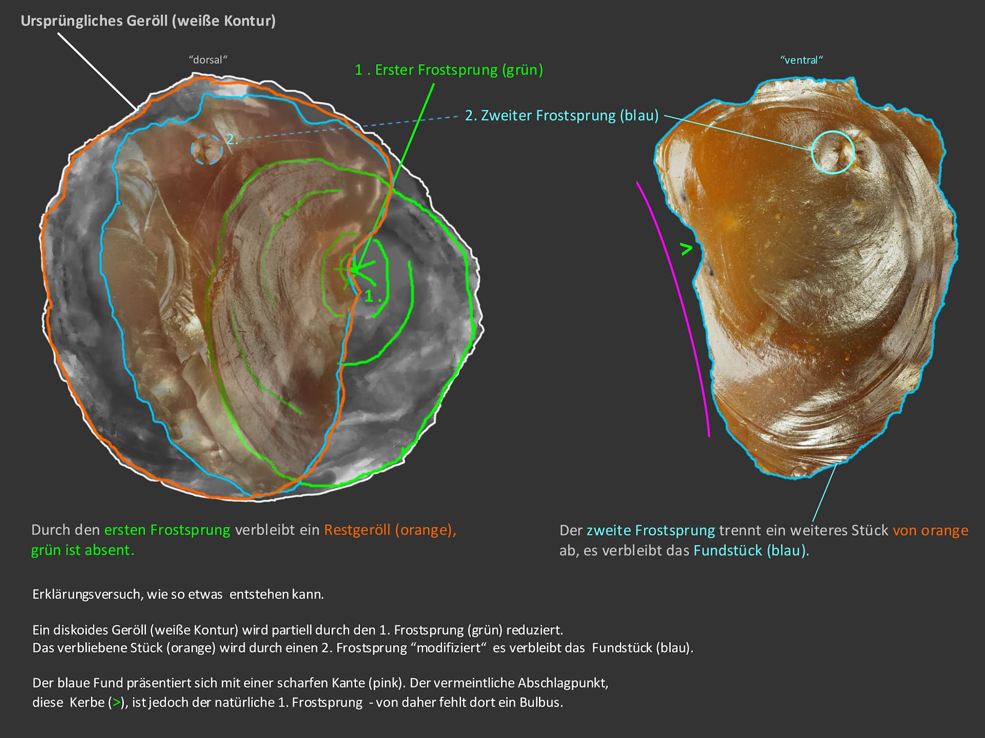 Das verbliebene Restgeröll (orange) wird durch einen 2. Frostsprung auf der anderen Seite “modifiziert“ es verbleibt das Fundstück (blau).