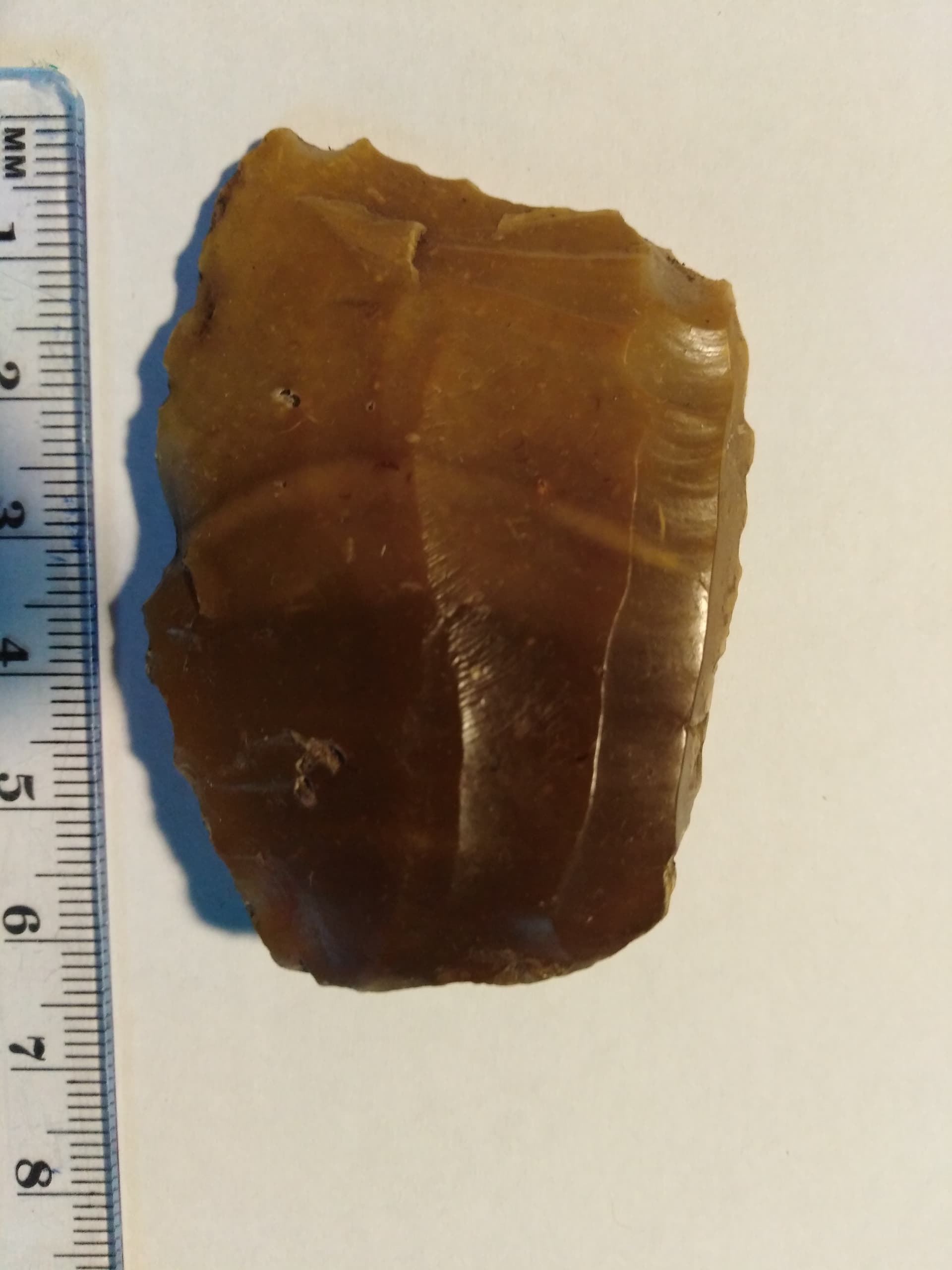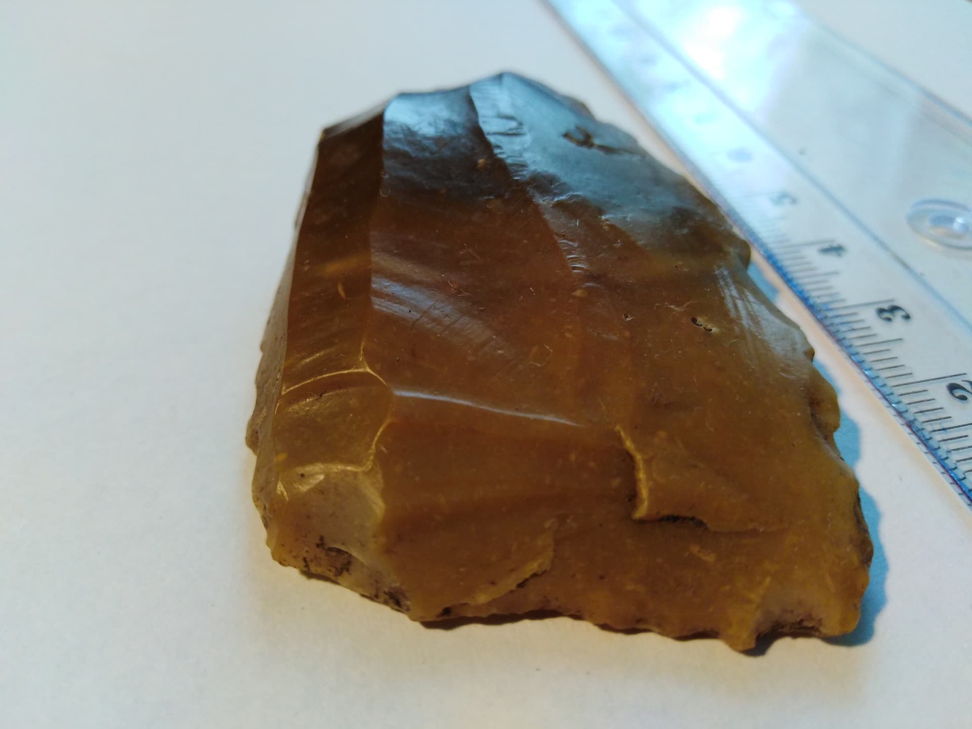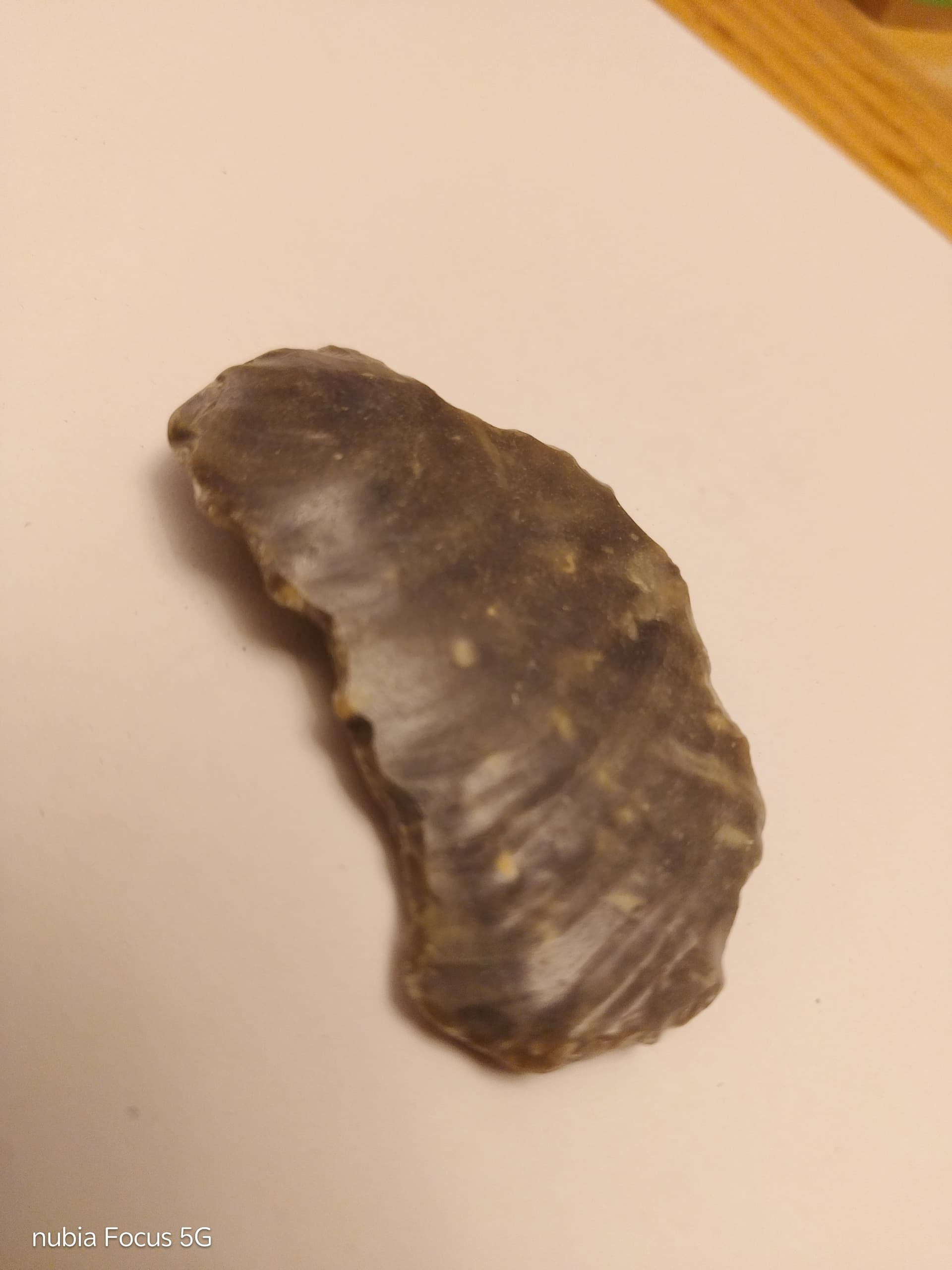 Ein interessantes Stück zeigst du hier. Ich kann mir vorstellen, dass das hier zu einer regen Diskussion führen wird. Einerseits scheint es typische Merkmale eines Abschlags, wie Ventral- und Dorsalseite zu haben, das heißt, eine Seite (dorsal), wo Abschlagnegative vorangegangener Abschläge zu sehen sind, als auch die Seite (ventral), wo das Stück vom Feuersteinkern gelöst wurde. Das Material ist schon das Richtige, Silex, Flint oder auch Feuerstein genannt, das in der Steinzeit bevorzugte Gestein für harte Geräte.