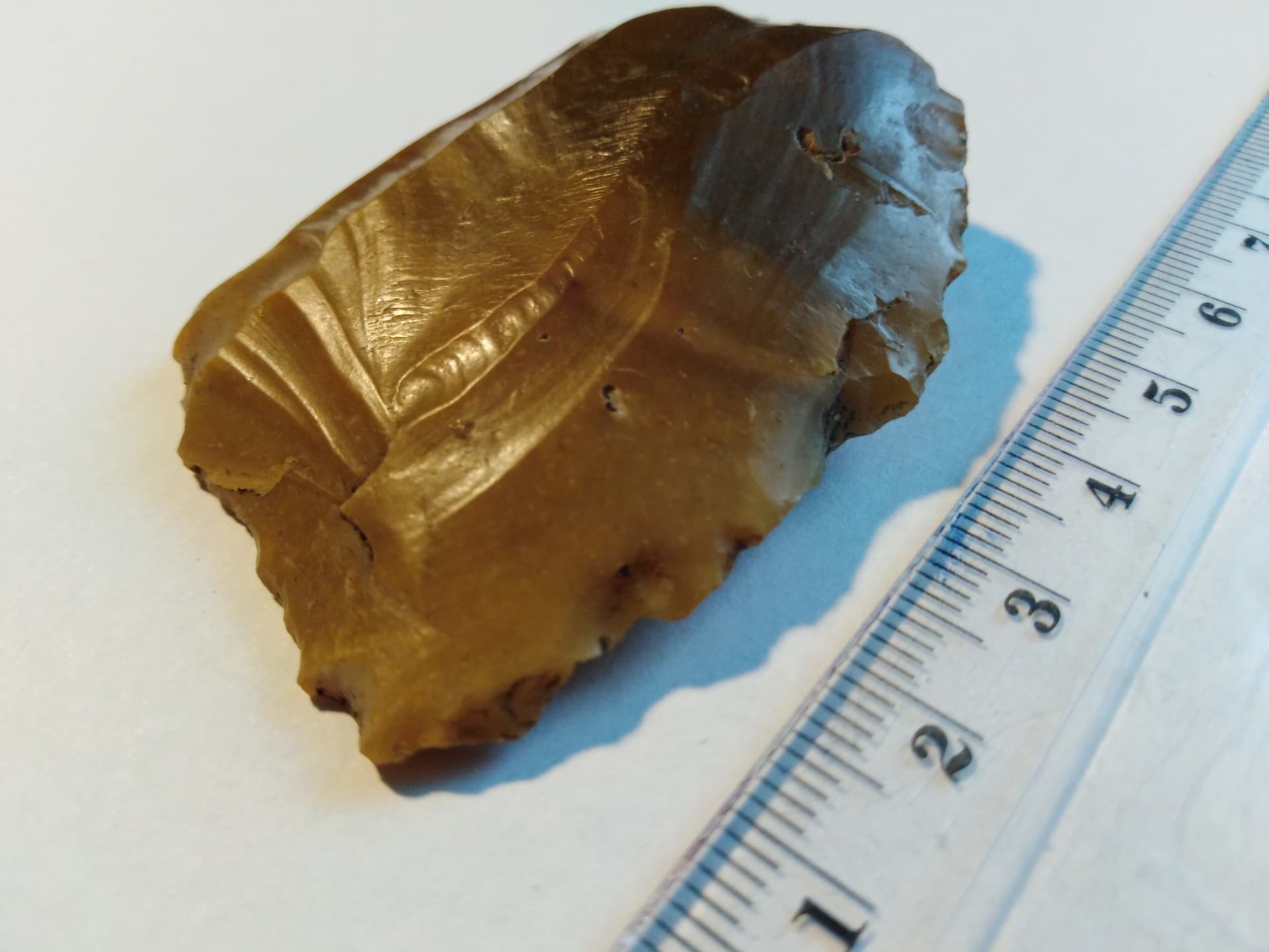 Nun ist der Bulbus (ventral) nicht typisch, zudem fehlt eine Schlagnarbe, die in der Regel vorhanden ist. Dorsal beginnt eine “Abschlagbahn” im “Nichts”, das heißt, sie kann nicht geslagen worden sein. Eine Weitere ist zu undeutlich, so dass man auch das Bulbusnegativ nicht erkennt.
