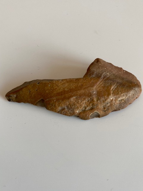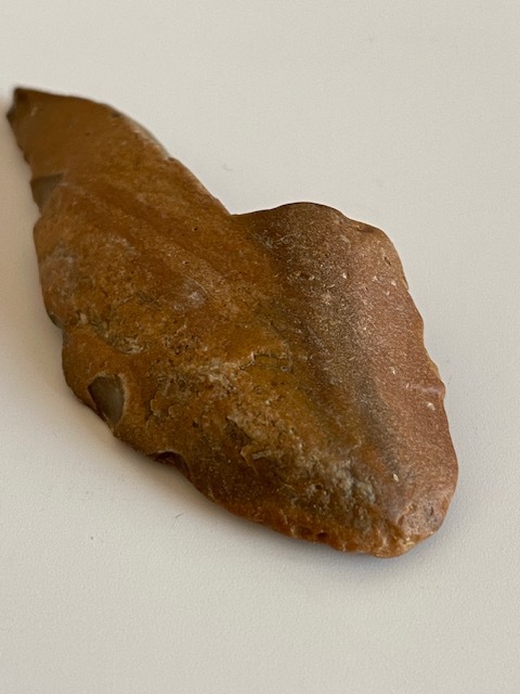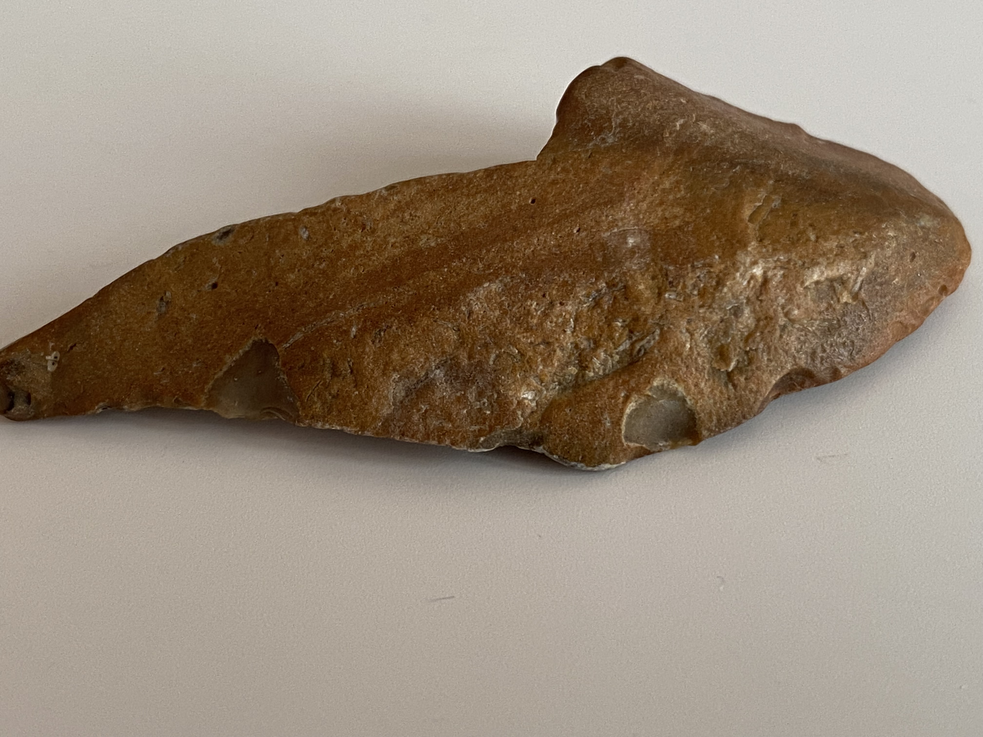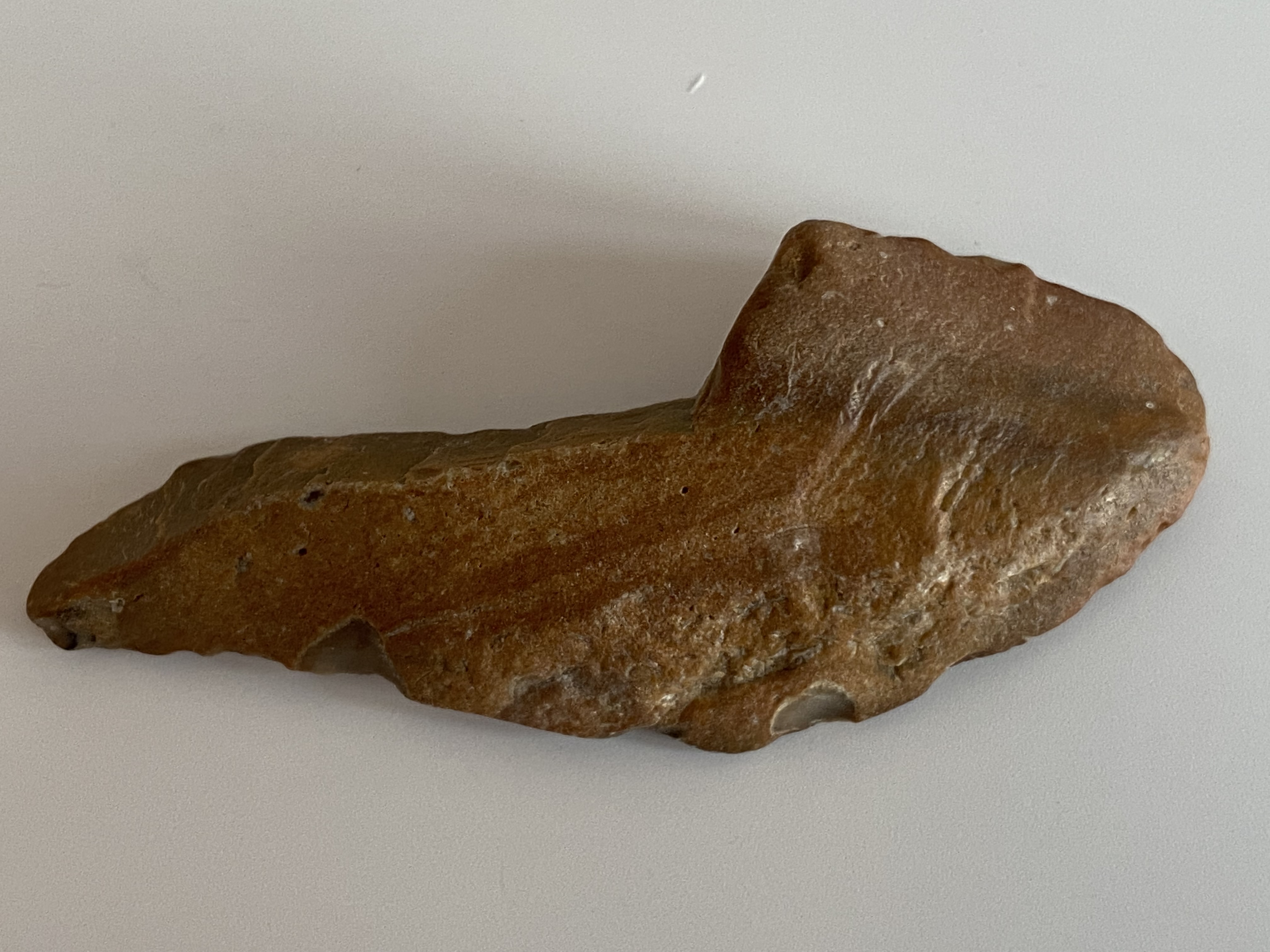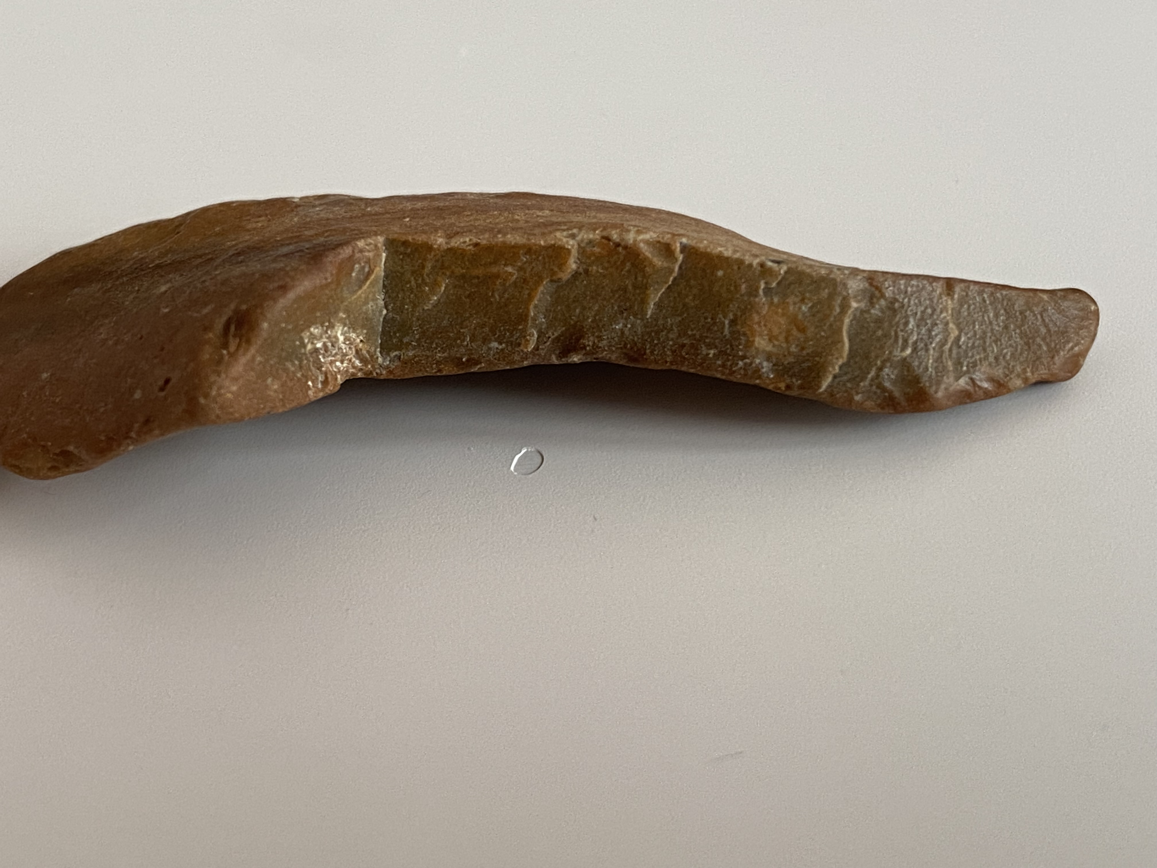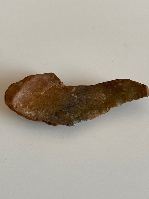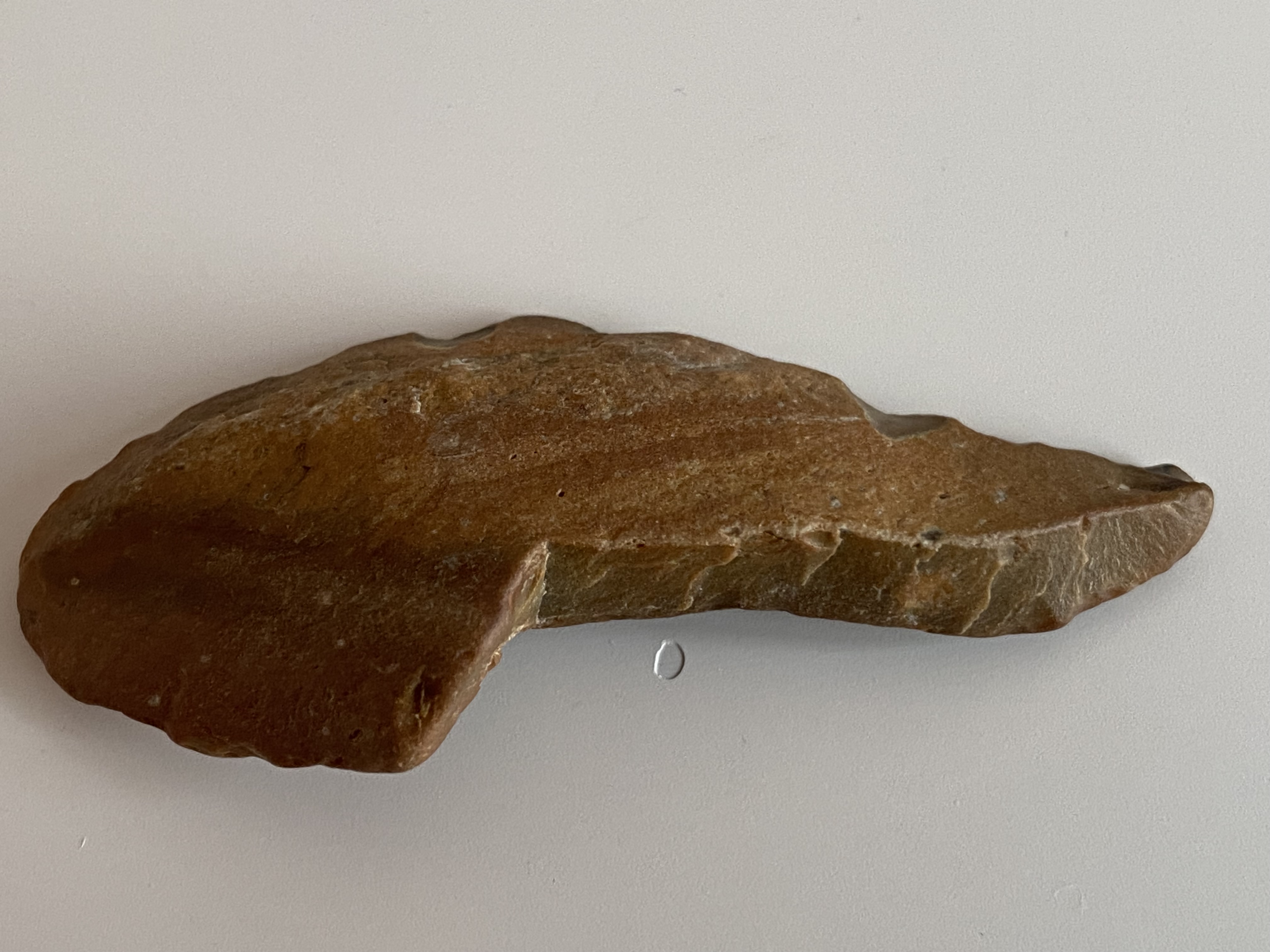Es handelt sich wohl um ein verrolltes Stück Feuerstein. Bearbeitungsspuren kann ich keine erkennen. Auch die Form, auch wenn sie einen an eine Klinge denken lassen könnte, weist keine typische Form eines Gerätes auf, selbst einen Abschlag würde ich eher ausschließen.