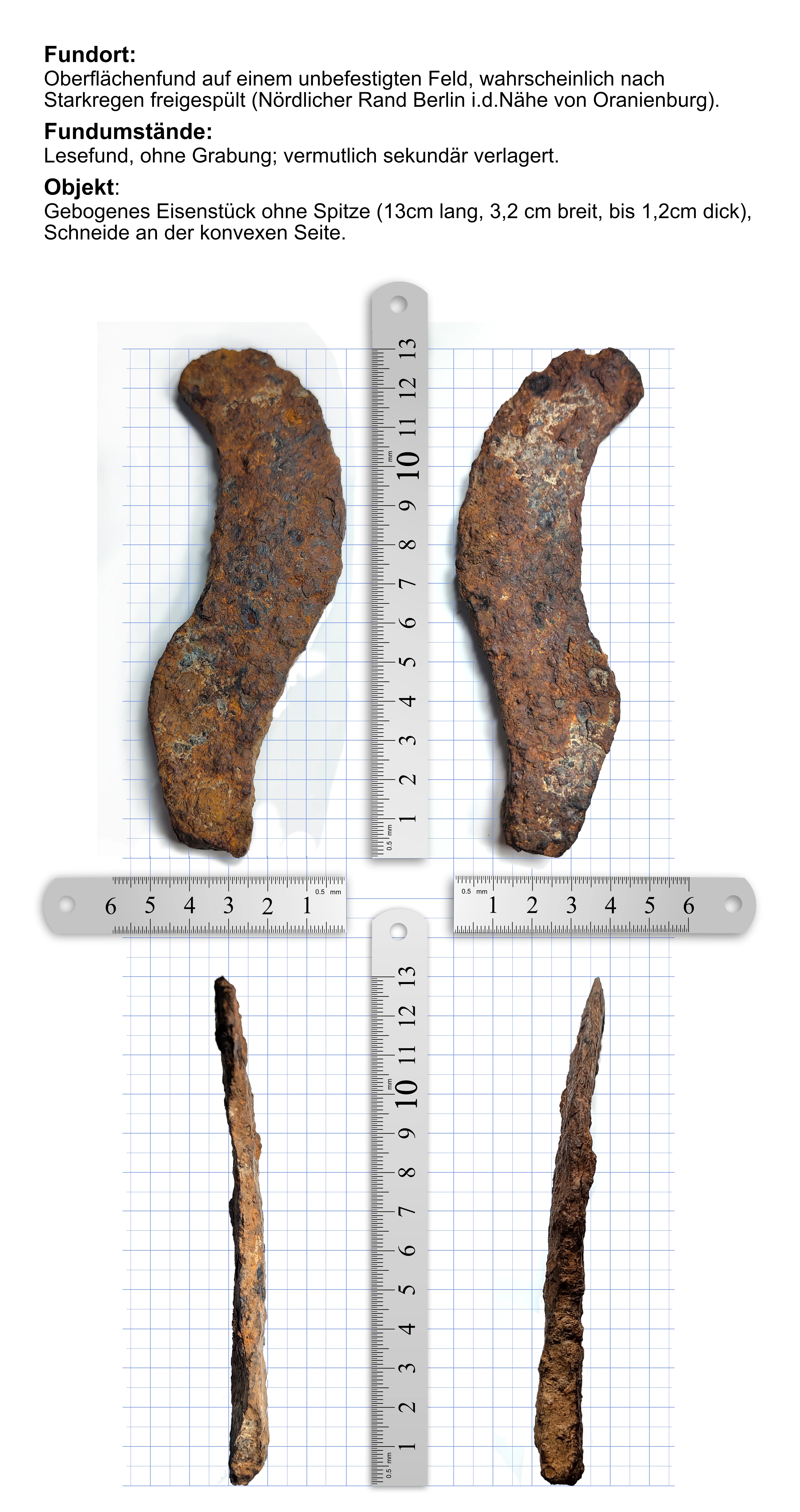Dieses Eisenstück das wahrscheinlich nach einem starken Regenguß freigewaschen wurde lag auf einem unbefestigten Weg zwischen zwei Wiesen bei mir im Dorf (nördlicher Rand Berlin). Ich finde dort desöfteren etwas. Die bisherigen Funde waren für leicht zu identifizieren (Maulschlüssel, Euro oder DM Münzen).