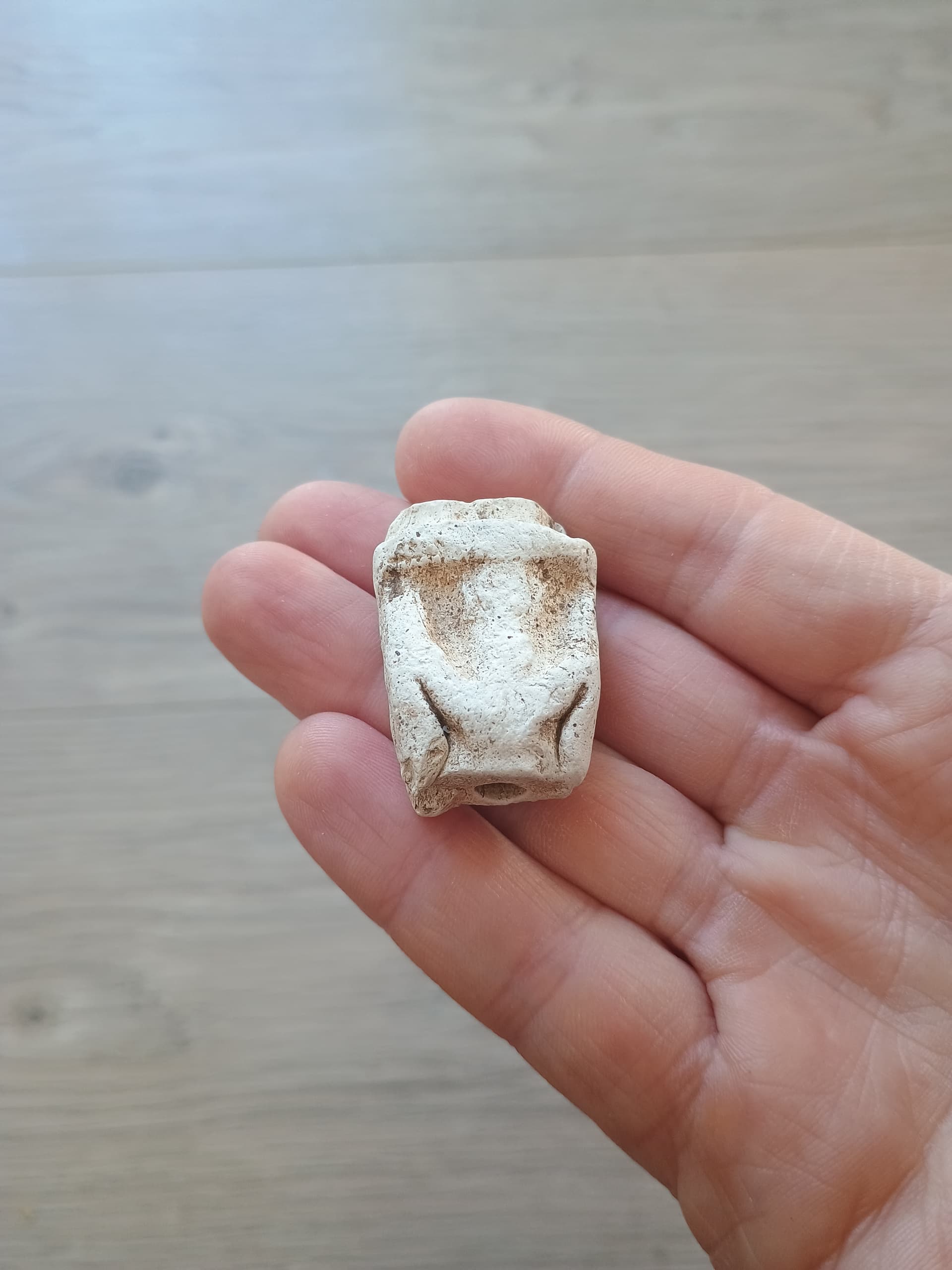 Es könnte sein, dass es sich um ein Figürchen handelt, ein Heiliger oder Maria, oder so etwas. Der Kanal würde von einem Stock stammen, auf den ein Tonklumpen befestigt war. Mithilfe einer zweiteiligen Form wurde dann eine Figur geformt, getrocknet und gebrannt.