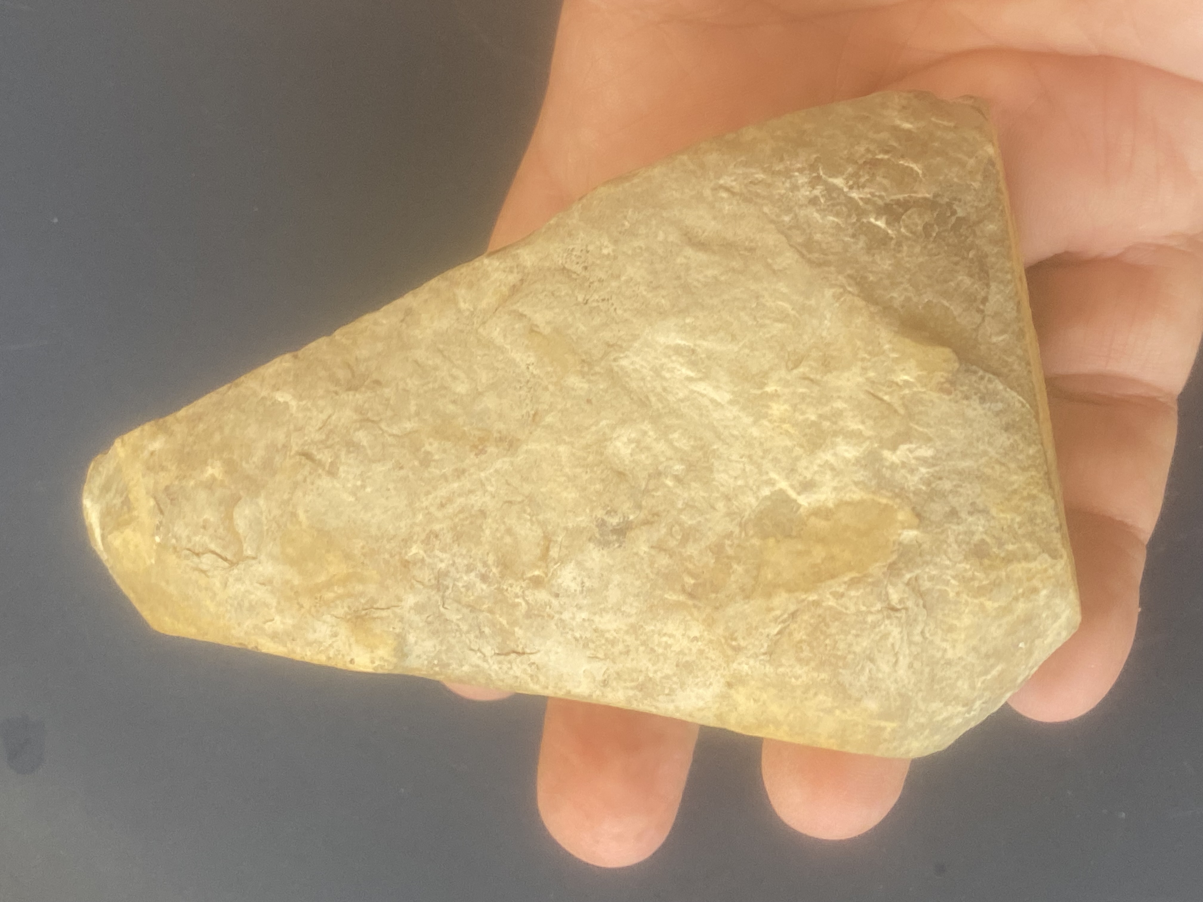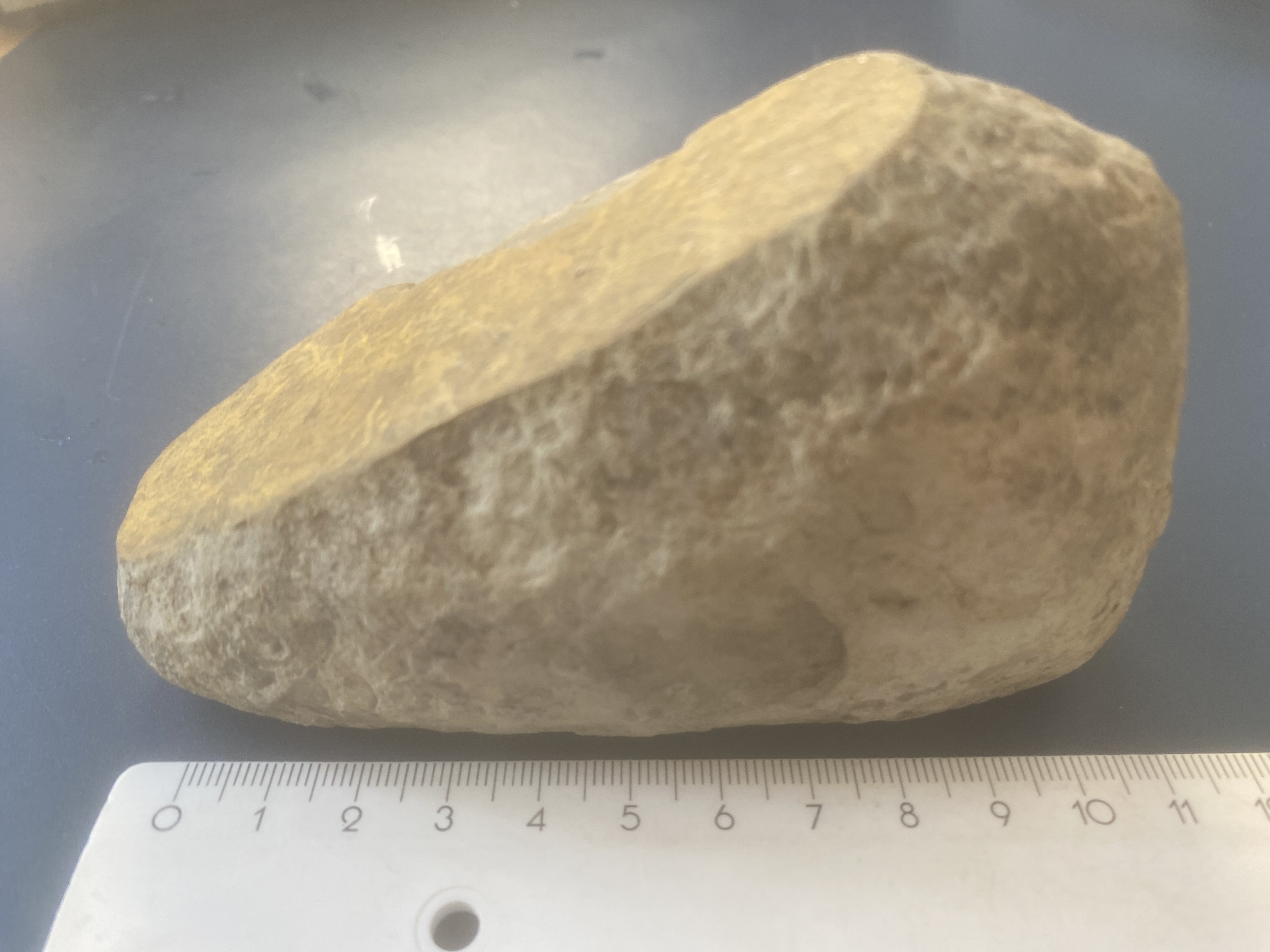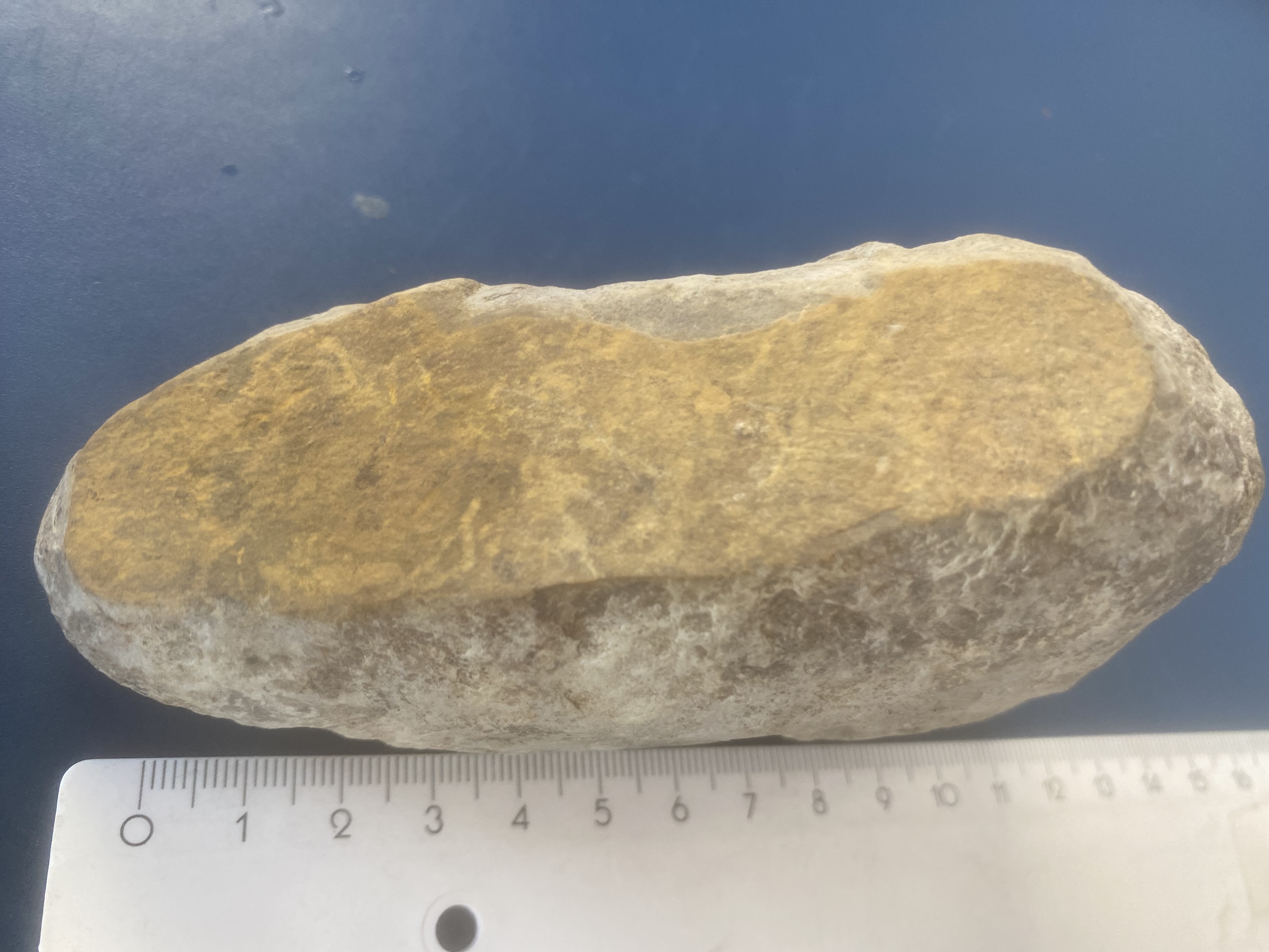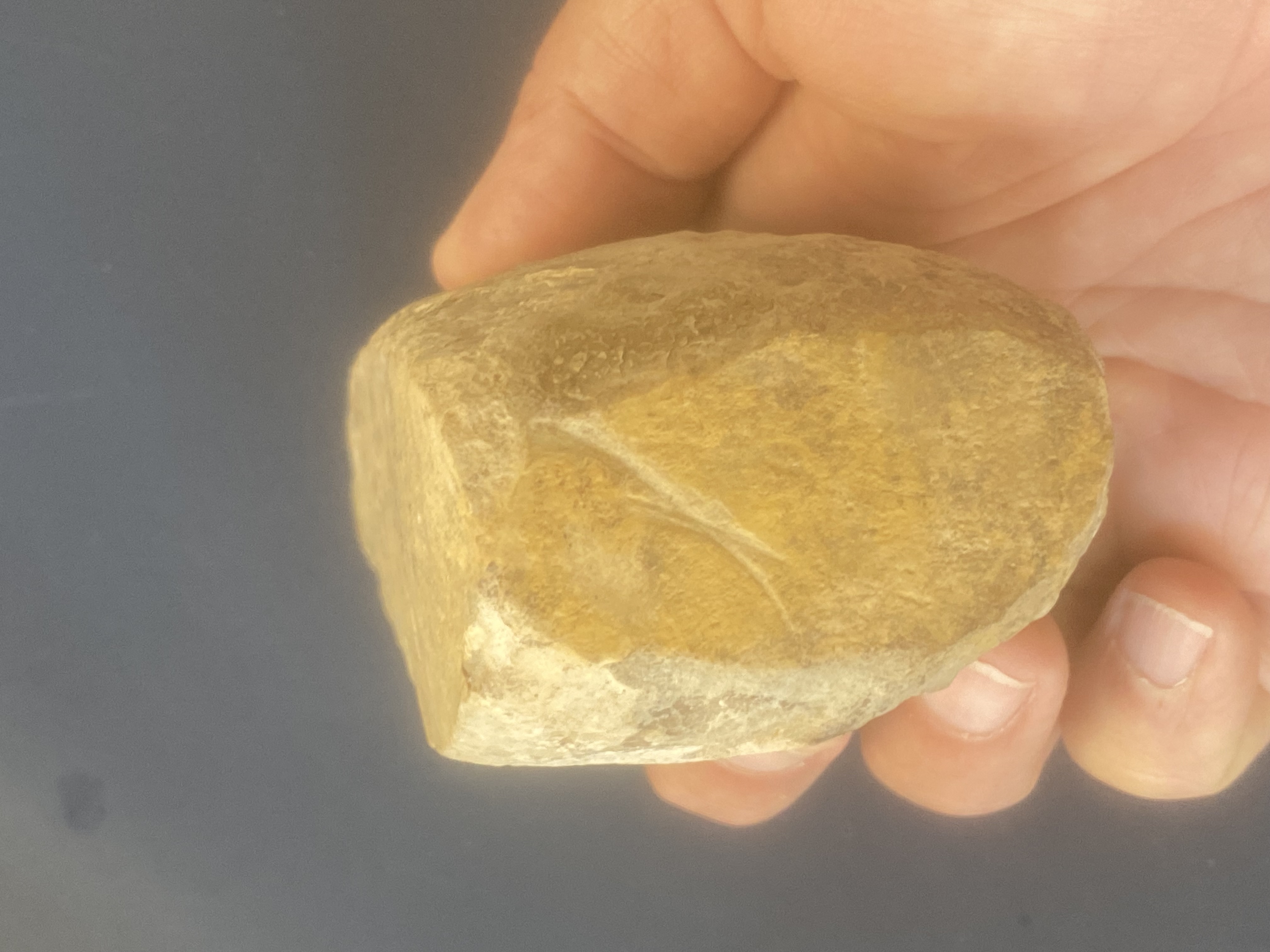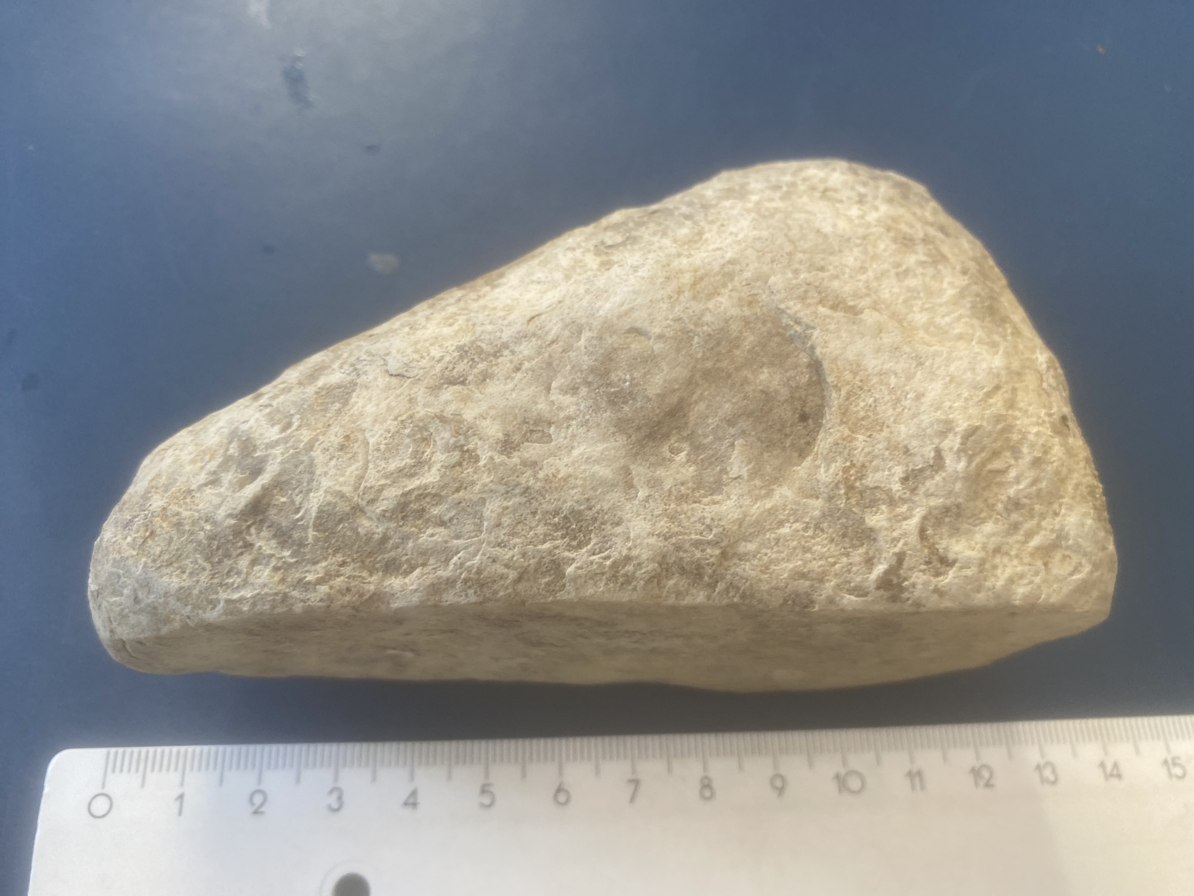 am vergangenen Wochenende habe ich ein eigenartiges Gesteinsobjekt aufgelesen. Vom gleichen Acker liegen mir leider keine weiteren auffälligen Funde vor. Dieser kompakte, nicht rauer, wohl autochthon hier vorkommender Kalkstein (reagiert auf Salzsäure) hat drei glatte Flächen. Zwei davon mit einer auffallend gelblichen Schattierung. Die andere Fläche wirkt farblich analog wie die Gesteinsrinde. An der „Nase“ des keilförmigen Objekt sind Absplitterungen, halte diese aber nicht intentional verursacht. Auf der einen Seite der Oberfläche ist zentral eine Oberflächenveränderung zu erkennen, die an den Beginn einer Bohrung wie bei einem Steinbeil erinnert, halte das aber eher für natürlich.