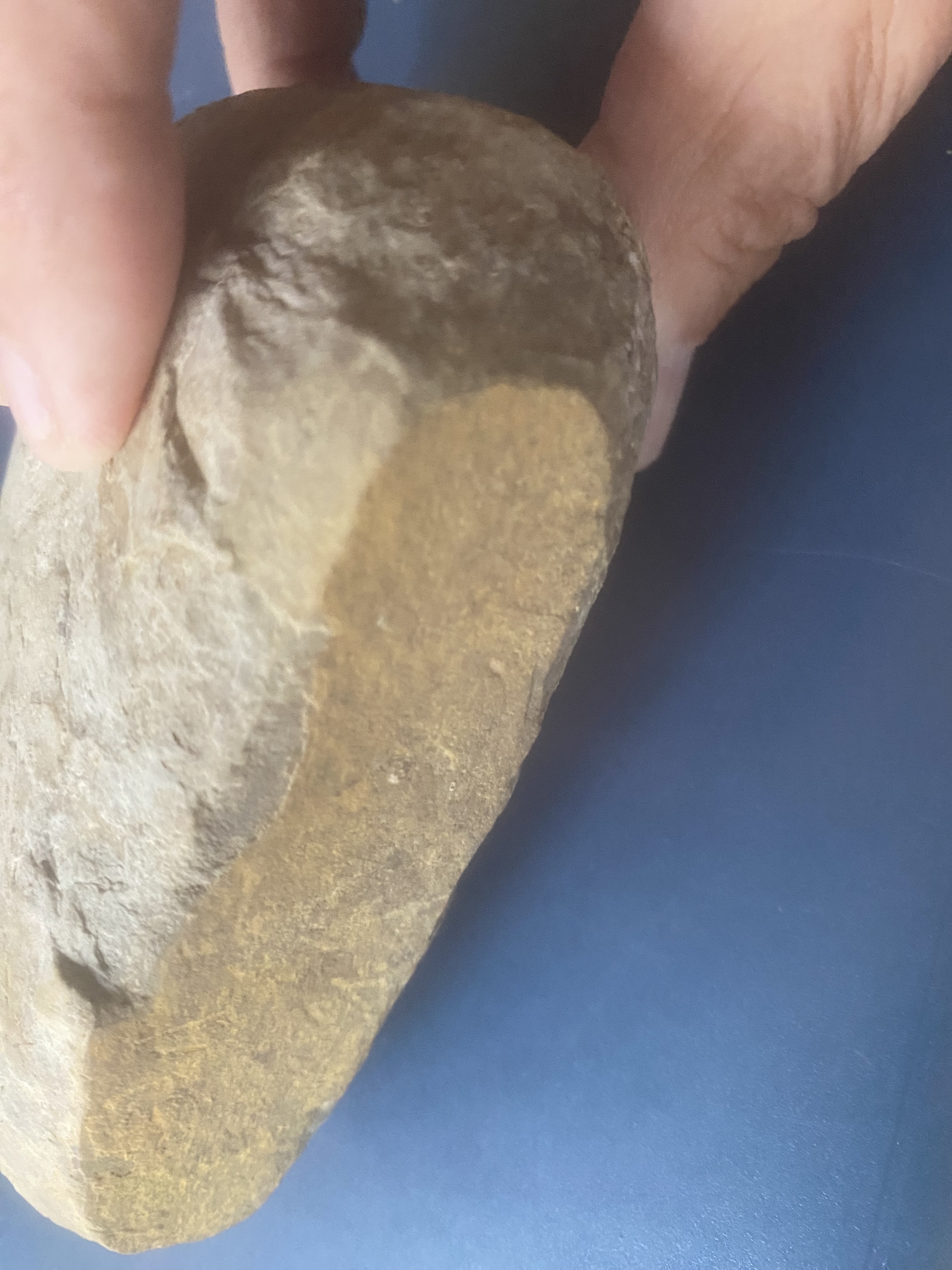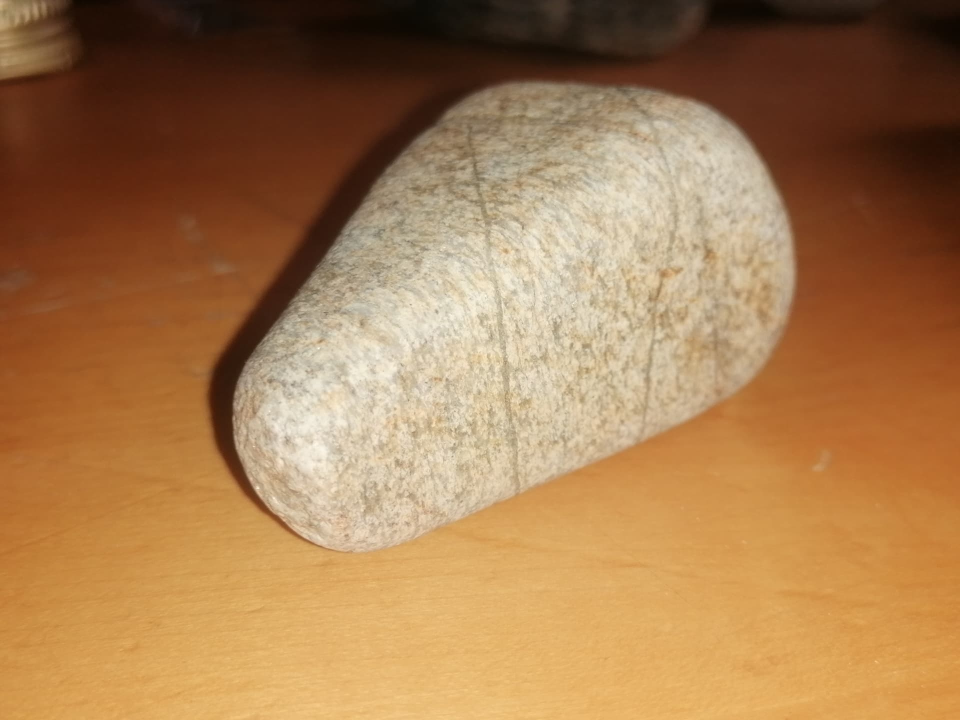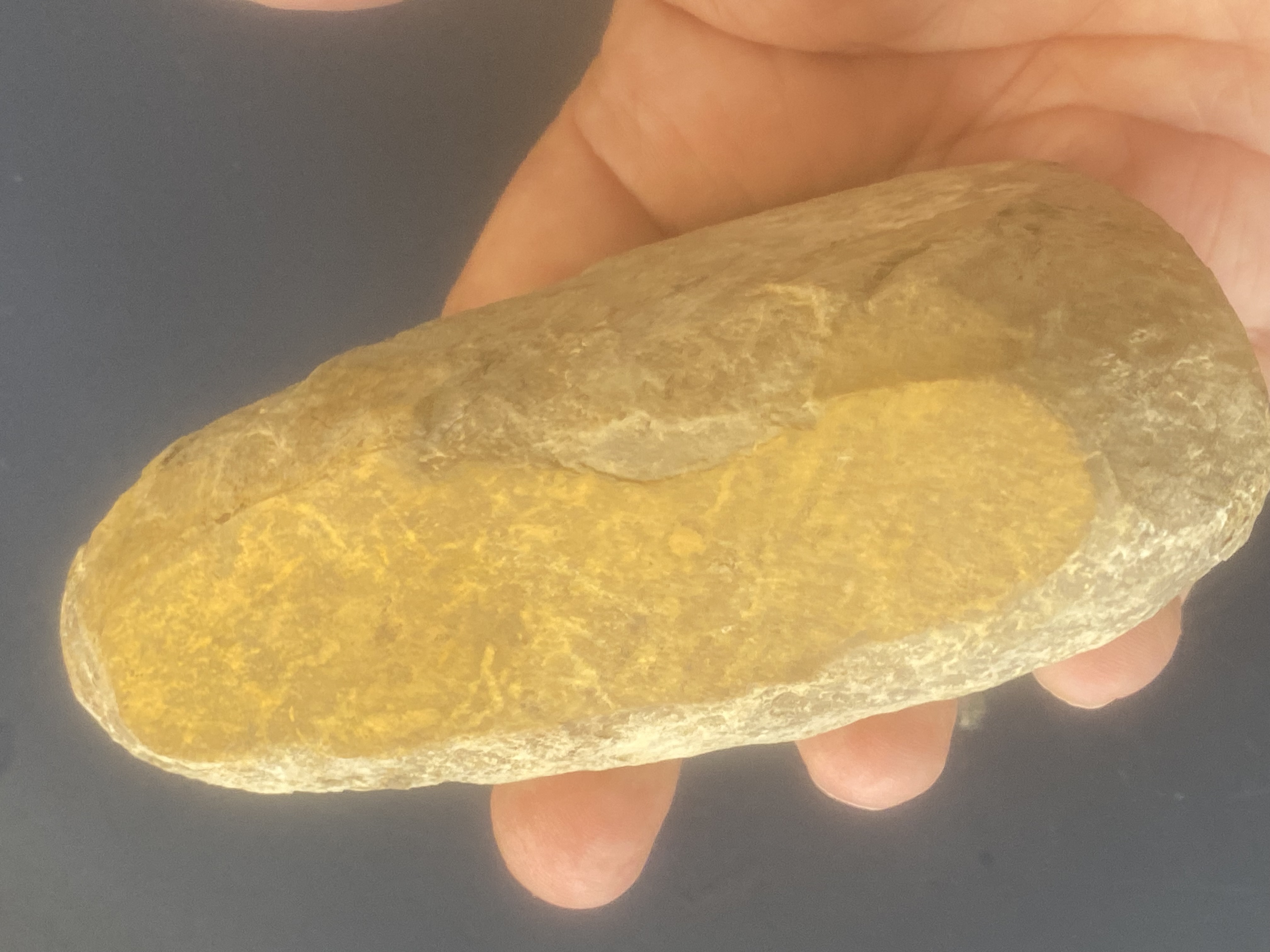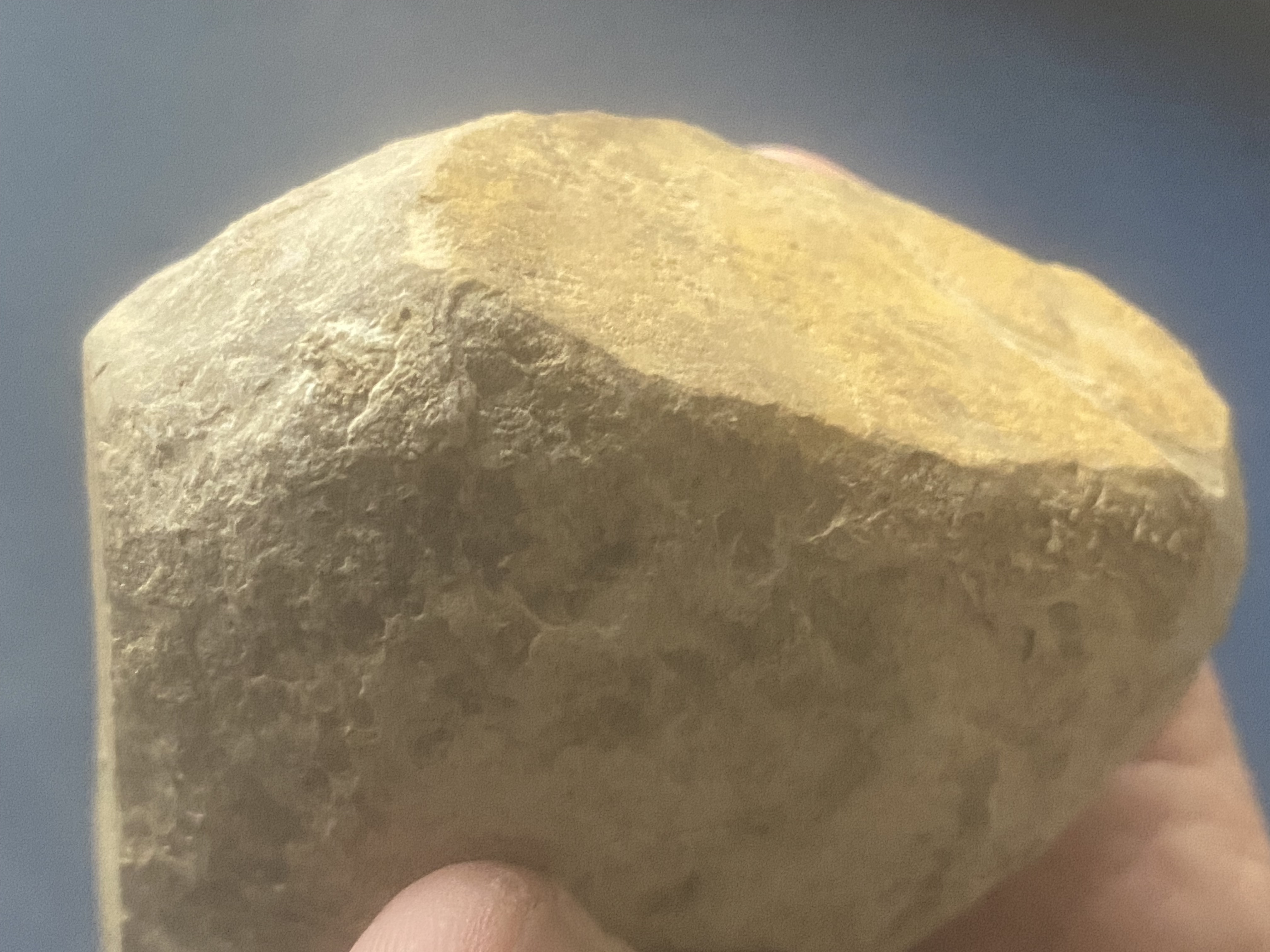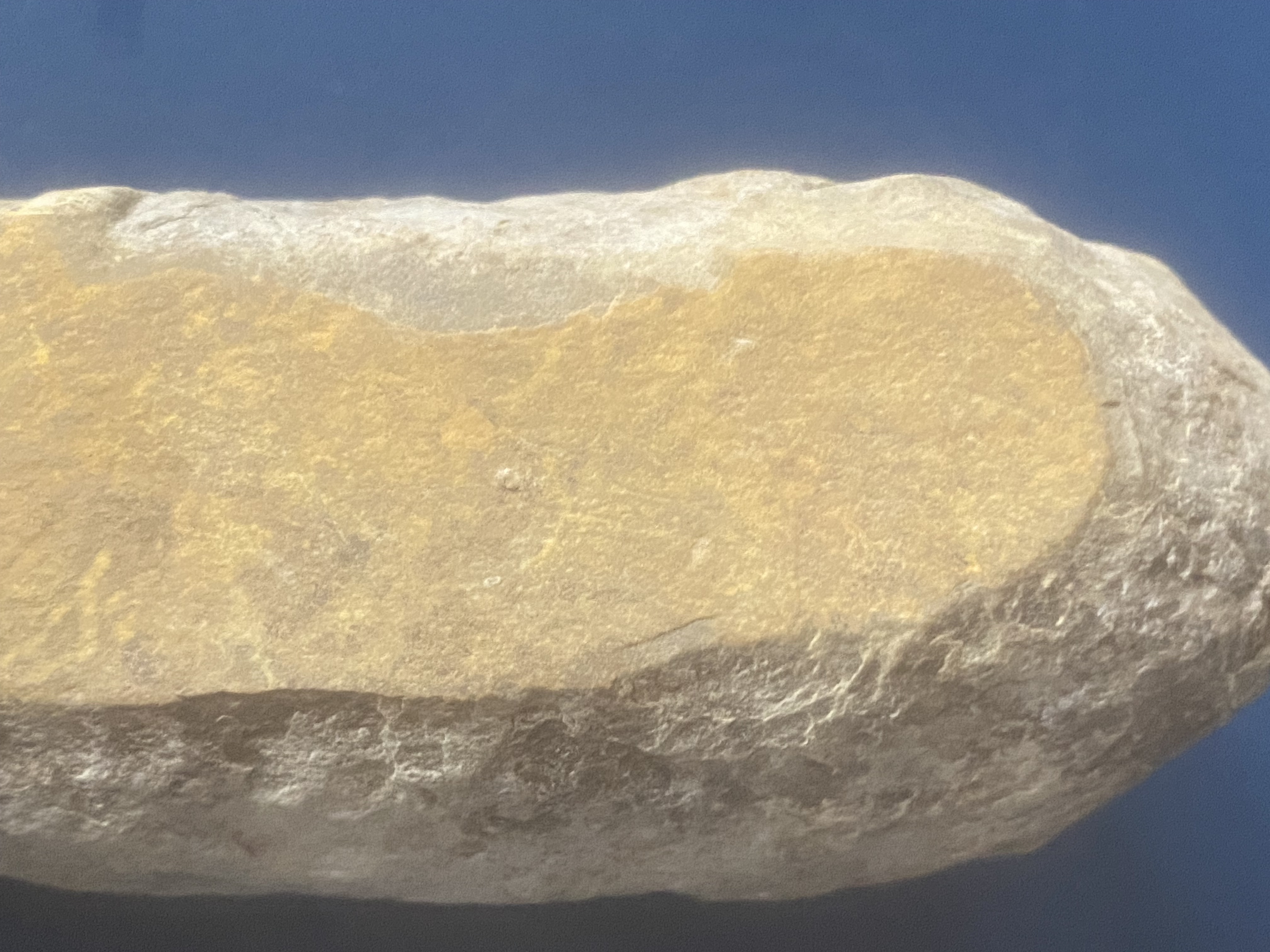 am vergangenen Wochenende habe ich ein eigenartiges Gesteinsobjekt aufgelesen. Vom gleichen Acker liegen mir leider keine weiteren auffälligen Funde vor. Dieser kompakte, nicht rauer, wohl autochthon hier vorkommender Kalkstein (reagiert auf Salzsäure) hat drei glatte Flächen. Zwei davon mit einer auffallend gelblichen Schattierung. Die andere Fläche wirkt farblich analog wie die Gesteinsrinde. An der „Nase“ des keilförmigen Objekt sind Absplitterungen, halte diese aber nicht intentional verursacht. Auf der einen Seite der Oberfläche ist zentral eine Oberflächenveränderung zu erkennen, die an den Beginn einer Bohrung wie bei einem Steinbeil erinnert, halte das aber eher für natürlich.