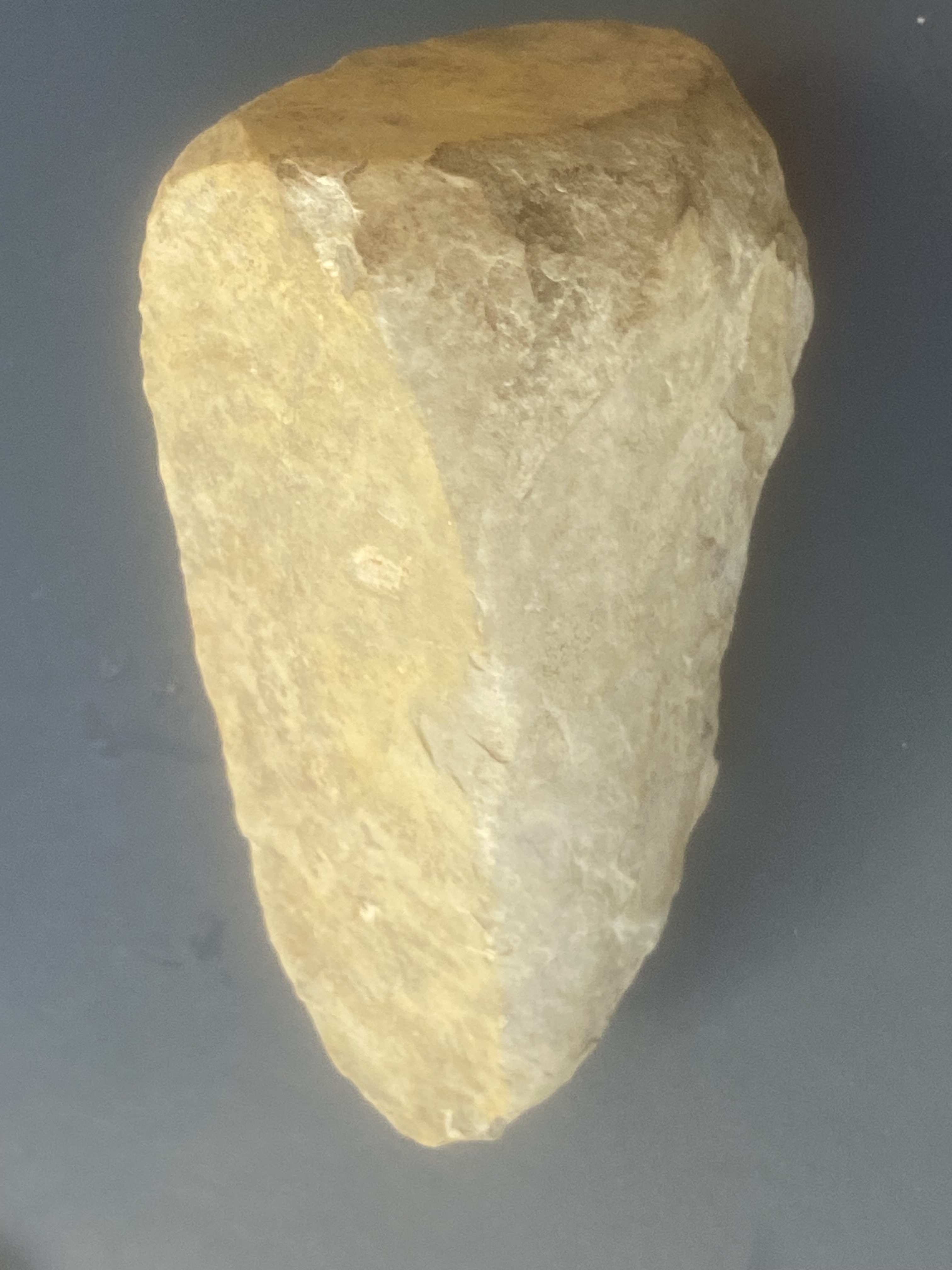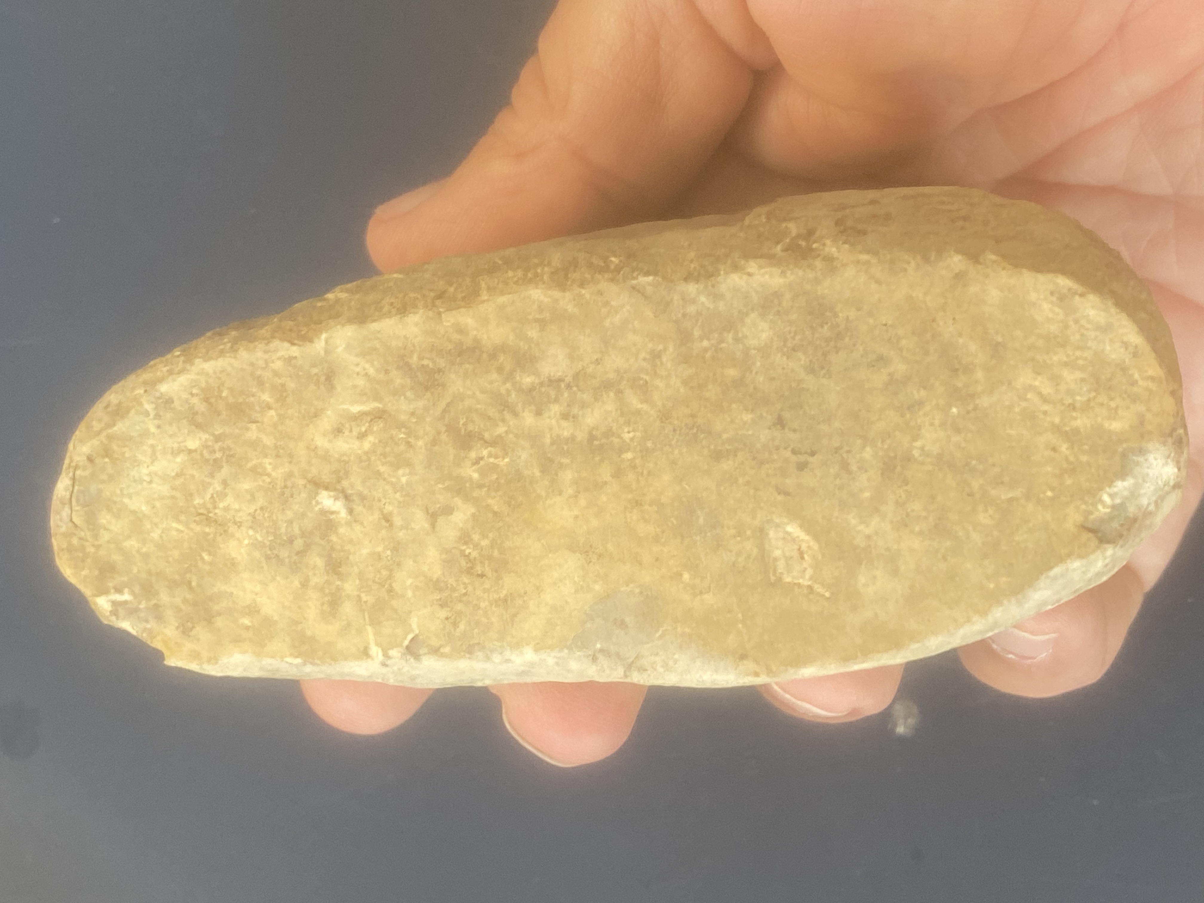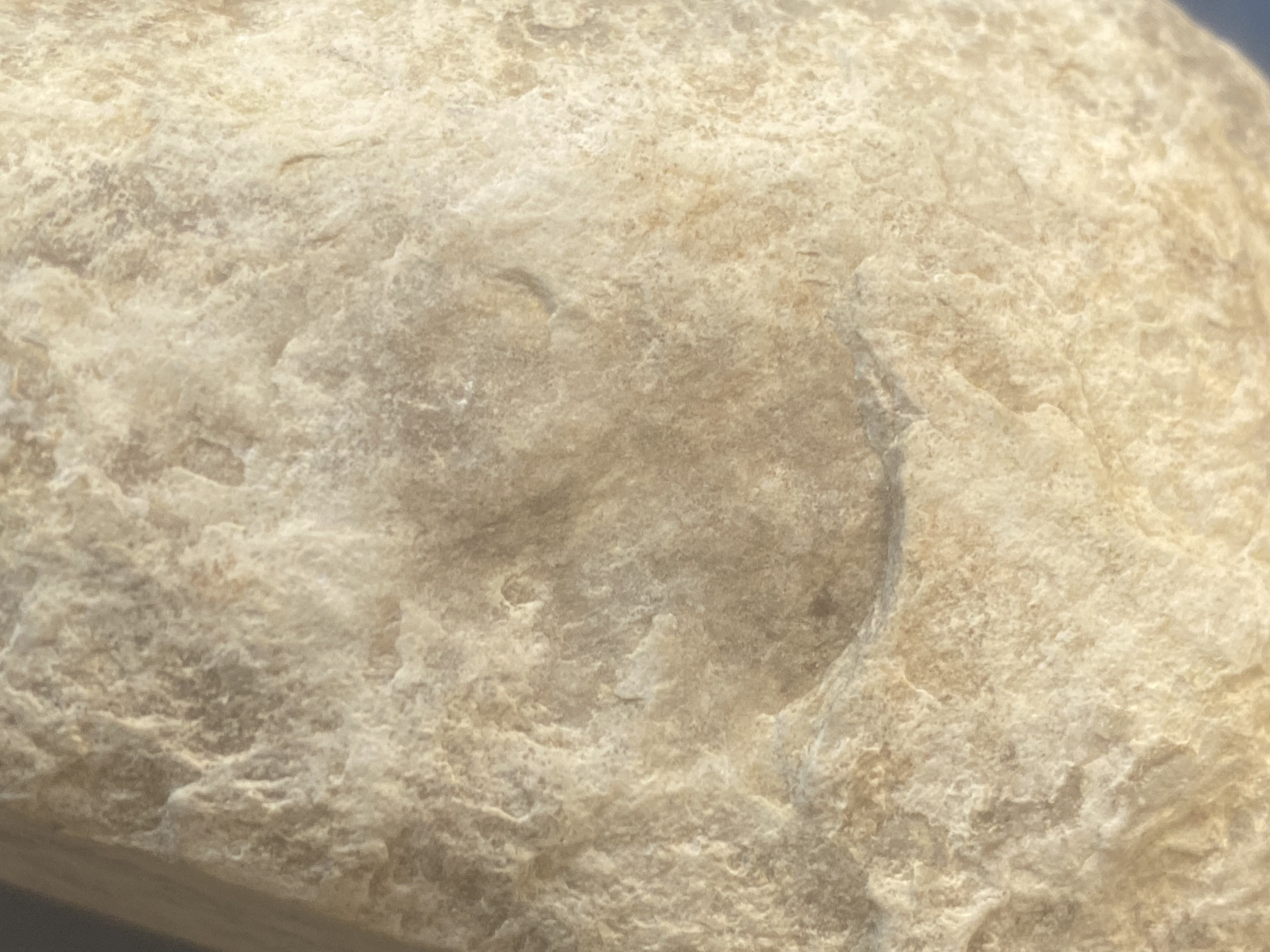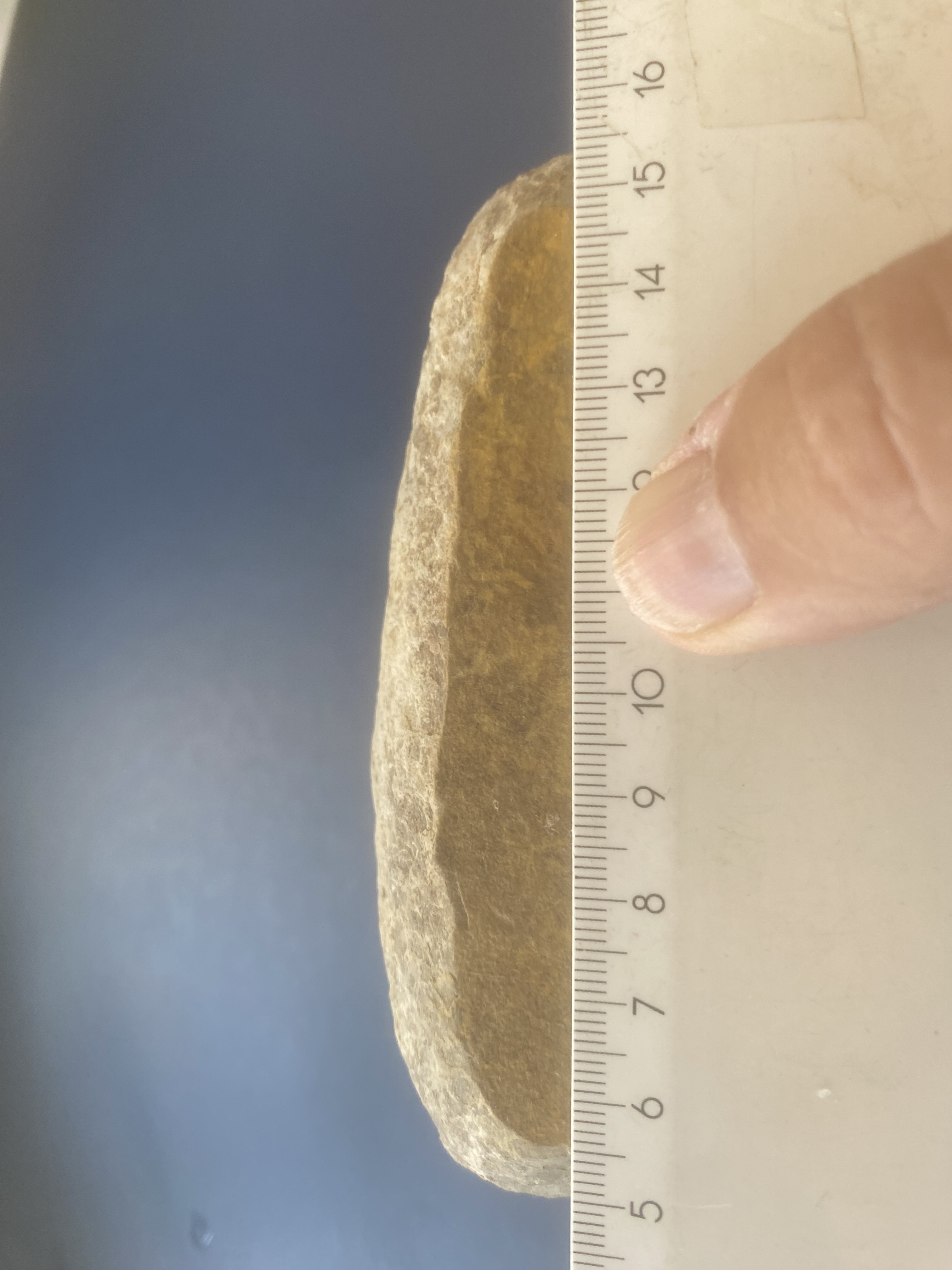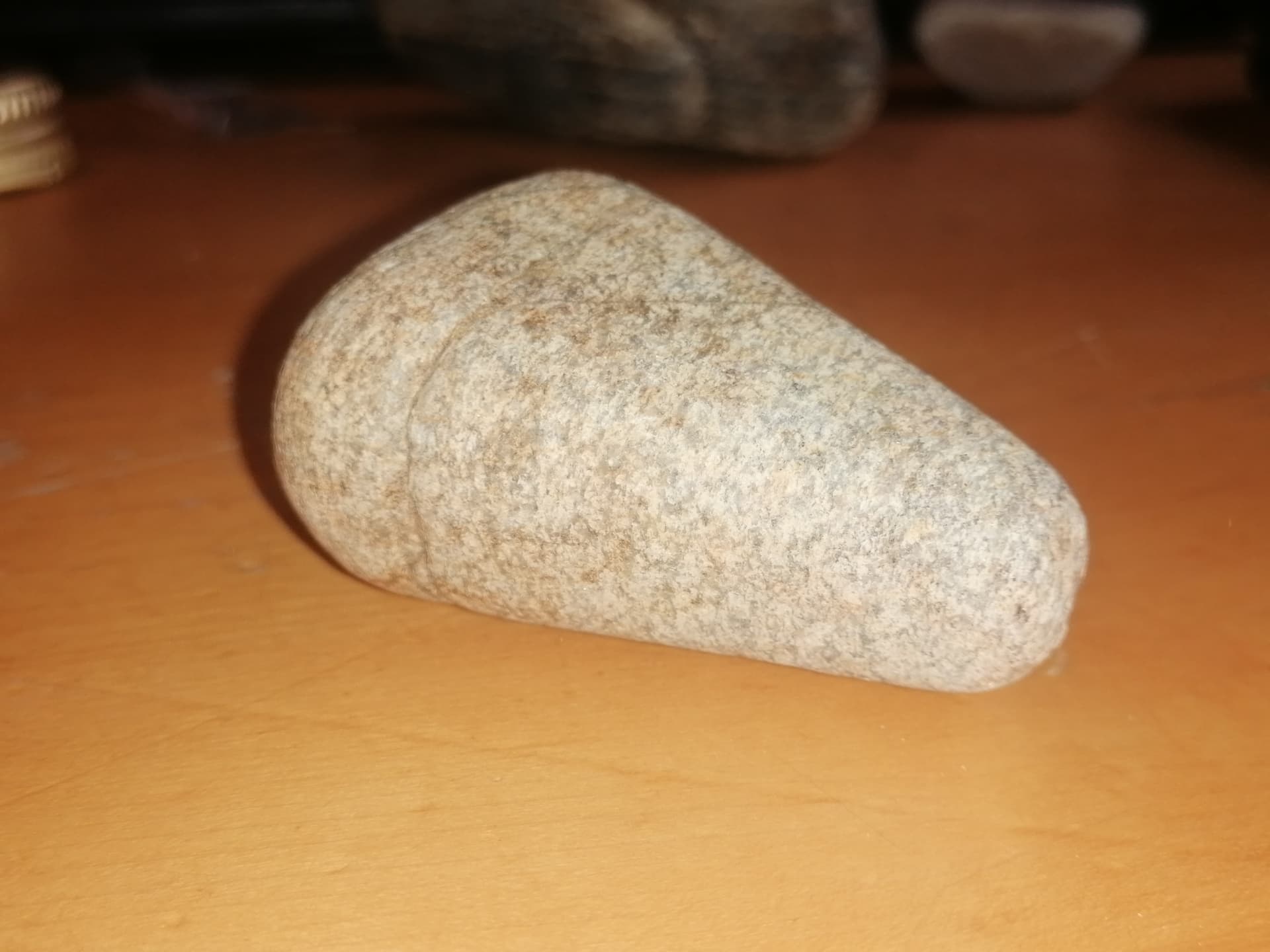 am vergangenen Wochenende habe ich ein eigenartiges Gesteinsobjekt aufgelesen. Vom gleichen Acker liegen mir leider keine weiteren auffälligen Funde vor. Dieser kompakte, nicht rauer, wohl autochthon hier vorkommender Kalkstein (reagiert auf Salzsäure) hat drei glatte Flächen. Zwei davon mit einer auffallend gelblichen Schattierung. Die andere Fläche wirkt farblich analog wie die Gesteinsrinde. An der „Nase“ des keilförmigen Objekt sind Absplitterungen, halte diese aber nicht intentional verursacht. Auf der einen Seite der Oberfläche ist zentral eine Oberflächenveränderung zu erkennen, die an den Beginn einer Bohrung wie bei einem Steinbeil erinnert, halte das aber eher für natürlich.