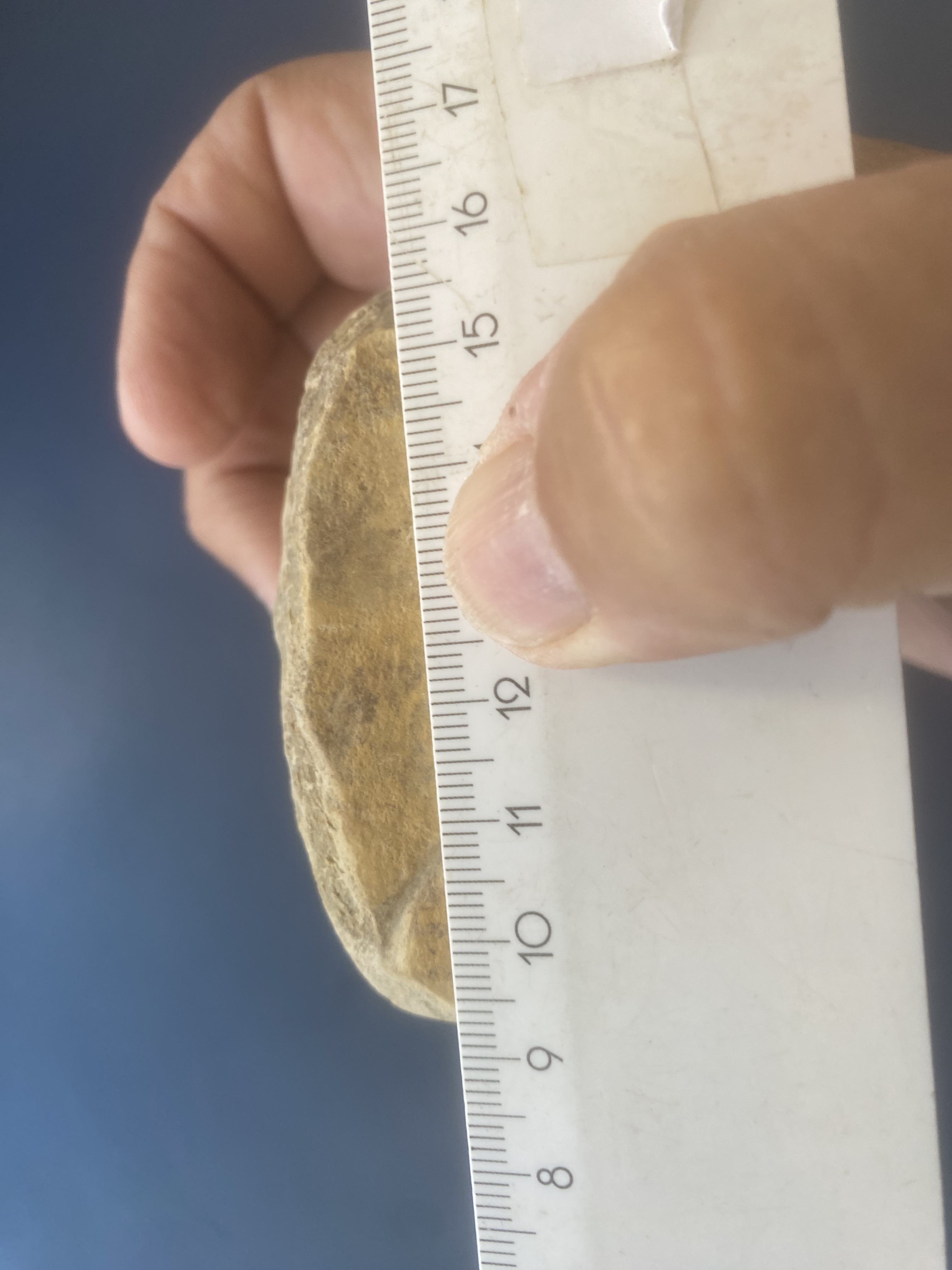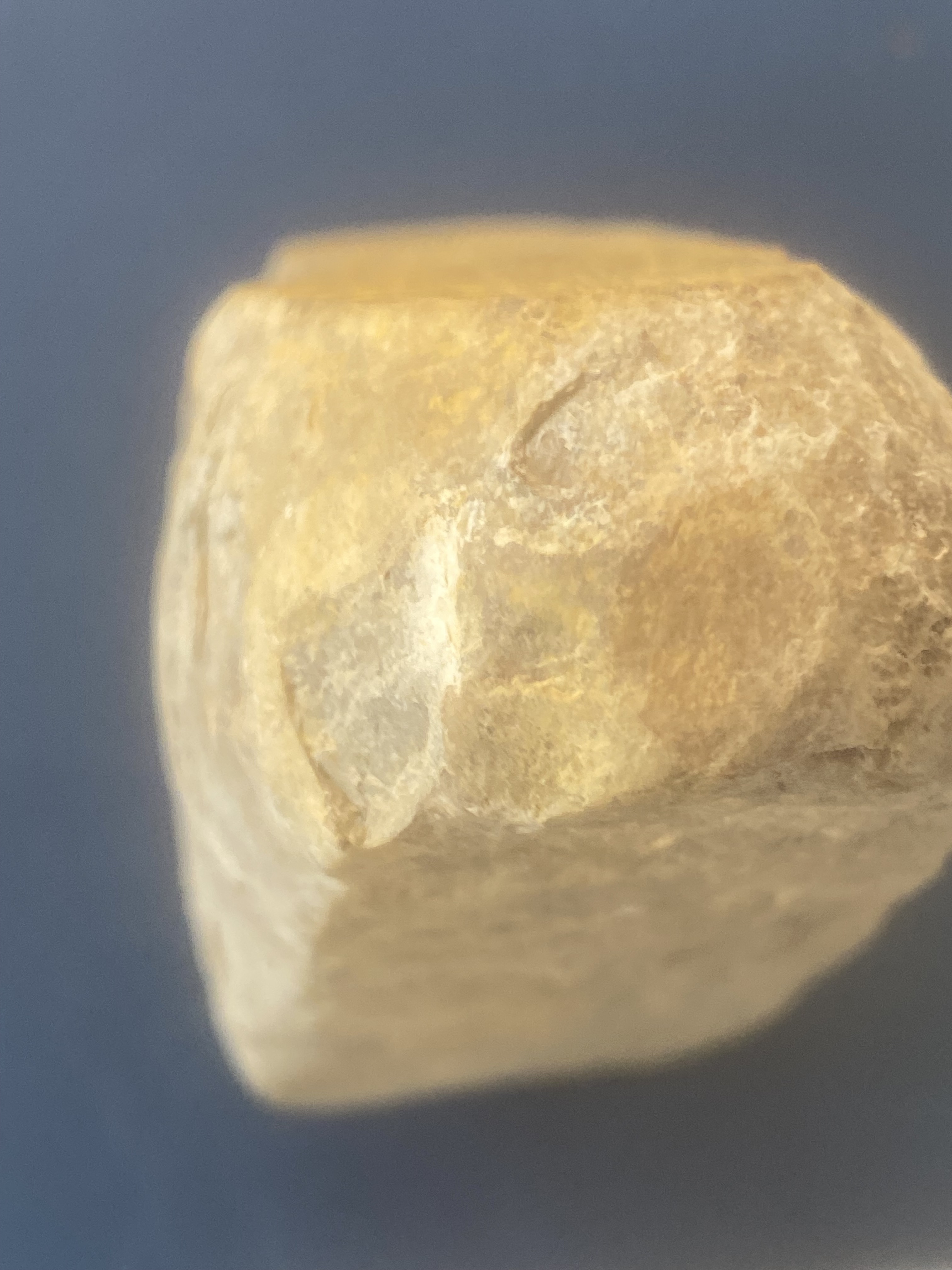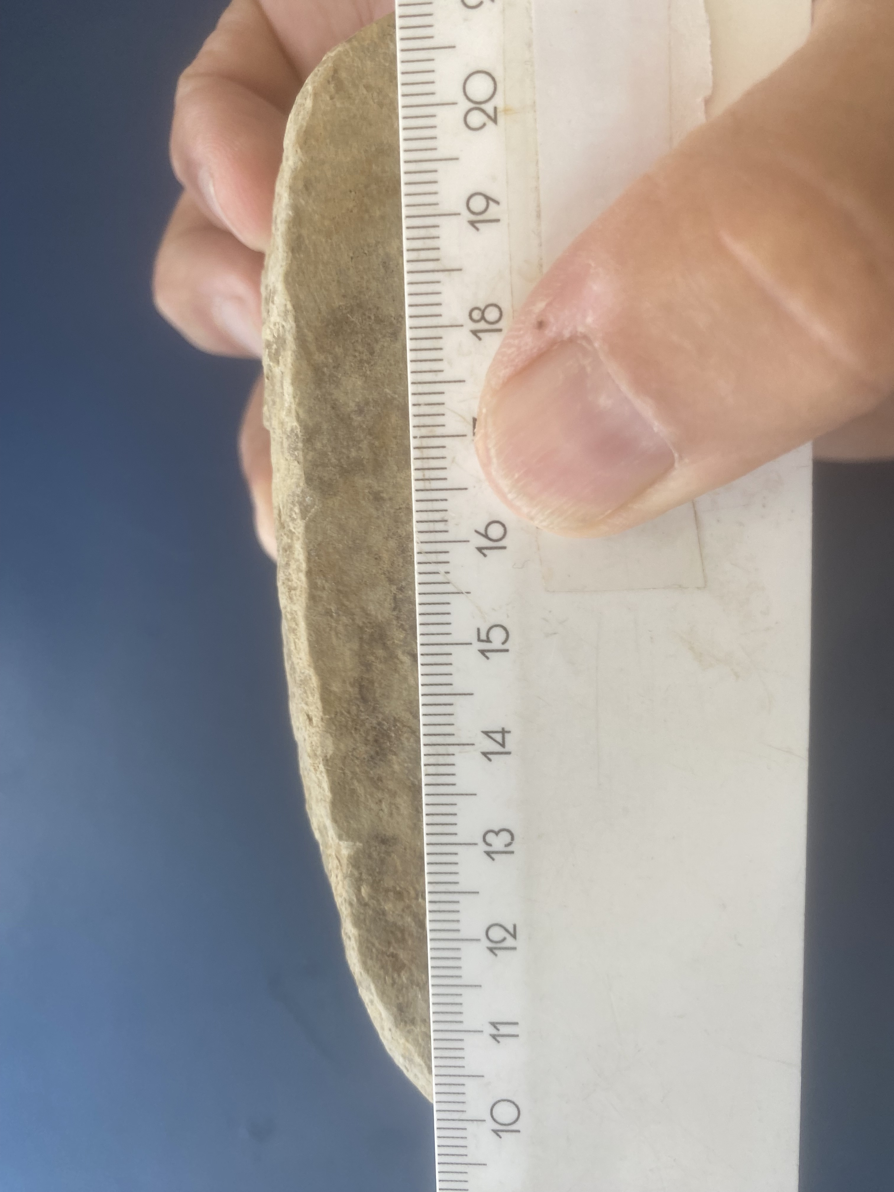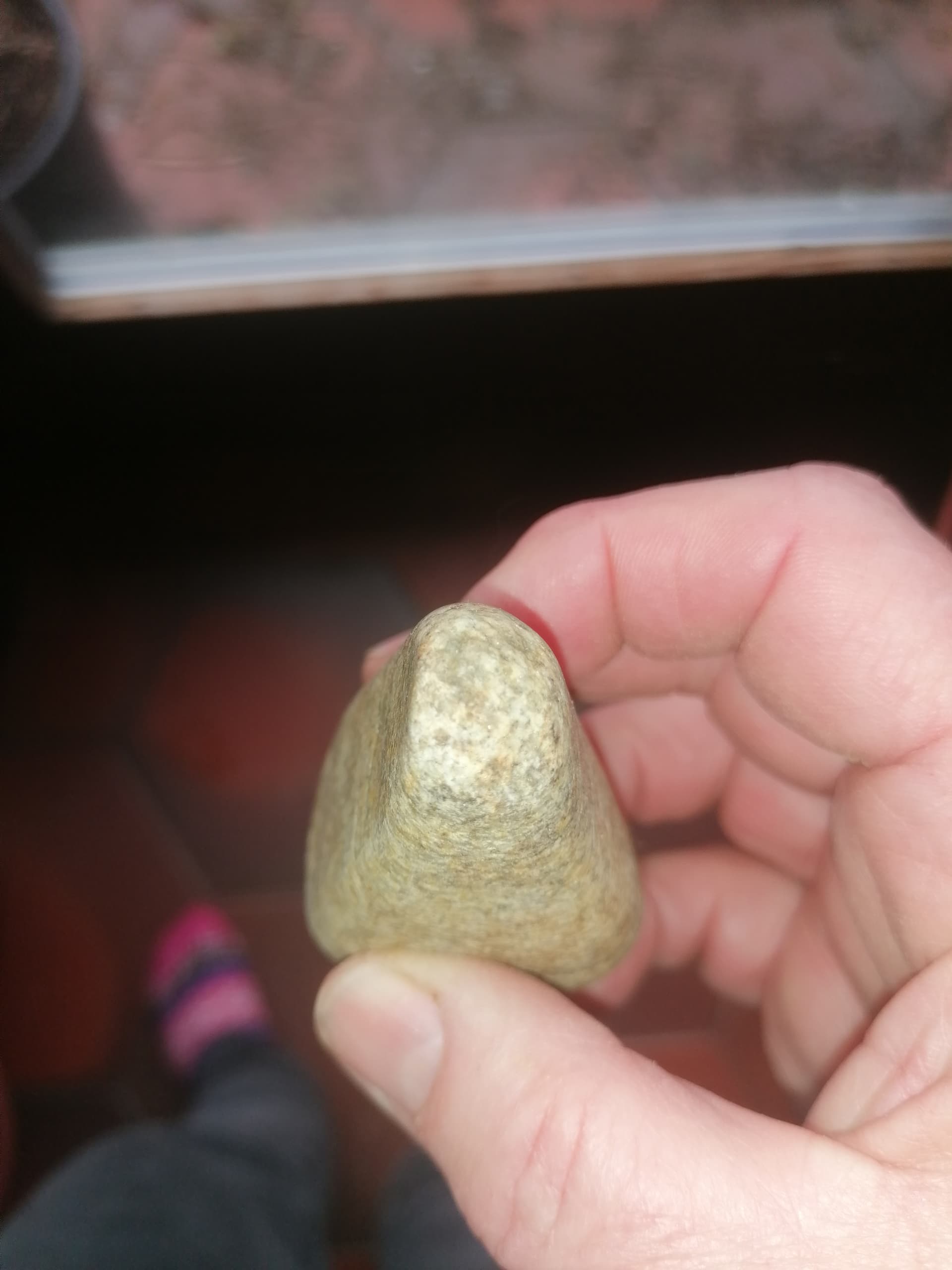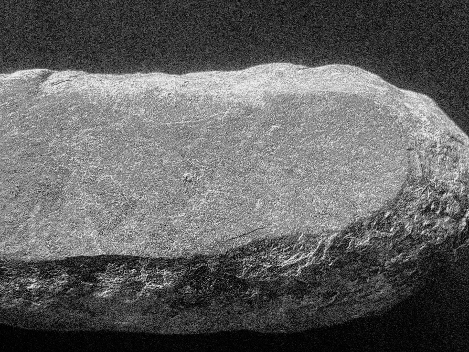 am vergangenen Wochenende habe ich ein eigenartiges Gesteinsobjekt aufgelesen. Vom gleichen Acker liegen mir leider keine weiteren auffälligen Funde vor. Dieser kompakte, nicht rauer, wohl autochthon hier vorkommender Kalkstein (reagiert auf Salzsäure) hat drei glatte Flächen. Zwei davon mit einer auffallend gelblichen Schattierung. Die andere Fläche wirkt farblich analog wie die Gesteinsrinde. An der „Nase“ des keilförmigen Objekt sind Absplitterungen, halte diese aber nicht intentional verursacht. Auf der einen Seite der Oberfläche ist zentral eine Oberflächenveränderung zu erkennen, die an den Beginn einer Bohrung wie bei einem Steinbeil erinnert, halte das aber eher für natürlich.