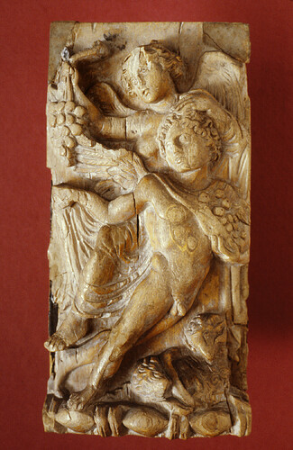 EDIT: jetzt update ich mich der Vollständigkeit halber nochmal selber: Es handelt sich, zumindest bei dem “Engel” wohl eher um einen römischen (bekränzten) Amor. Hier ein Beispiel mit ähnlichem Halsschmuck:
