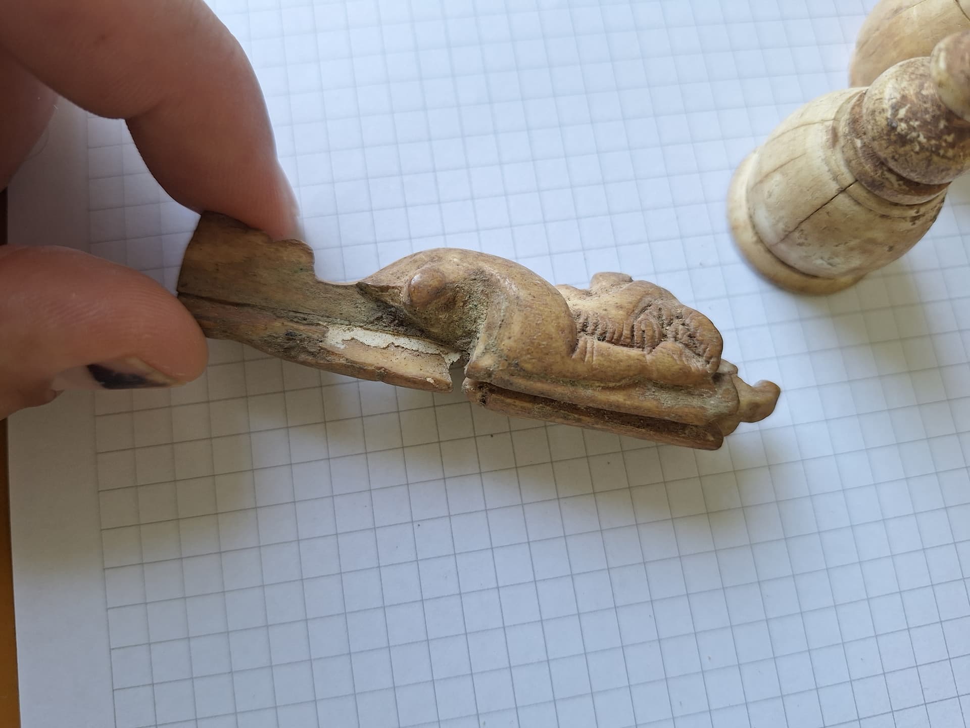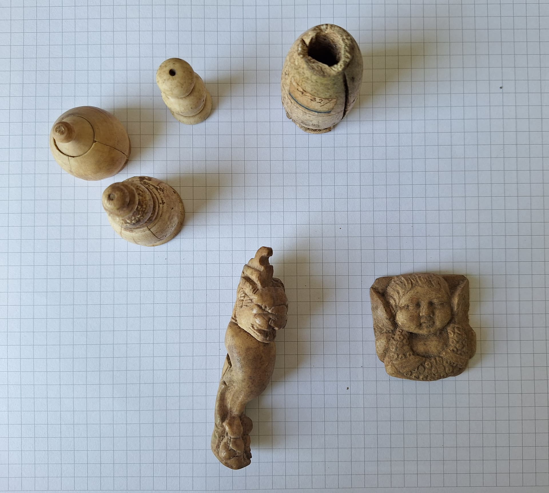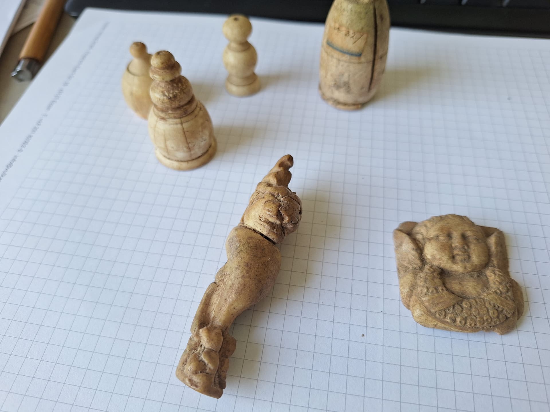 Kann jemand von Euch die Stücke einordnen und vor allem, welche Funktion die Teile mal hatten? Die runden, zylinderförmigen Objekte wirken auf mich wie Spielsteine. Der Löwe hatte wohl mal irgendeine mechanische Funktion.