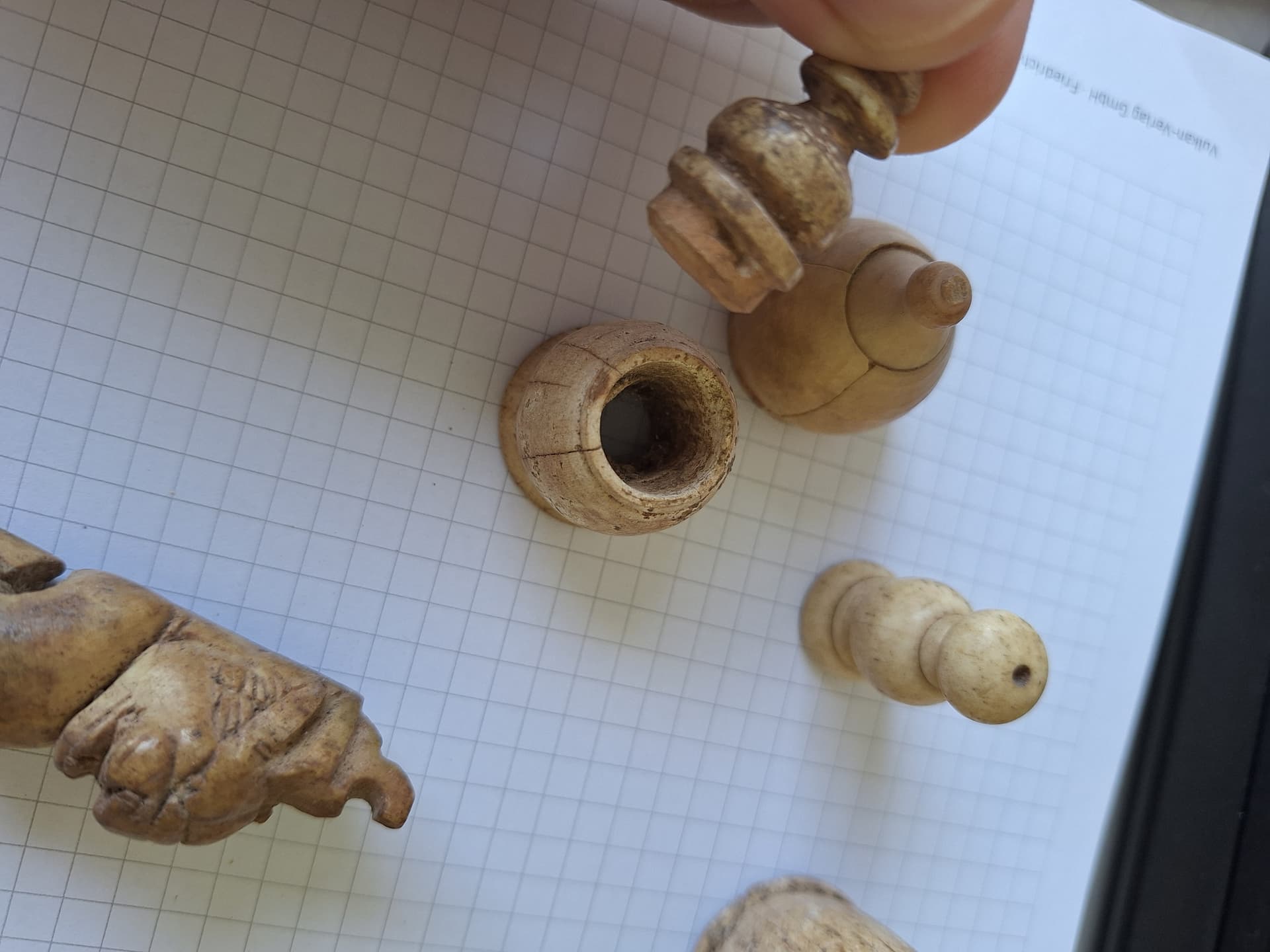 diese kleine Sammlung von Beinarbeiten habe ich heute bekommen. Sie stammen aus einer alten französischen Sammlung und stehen evtl im koptischen und römischen Kontext? Aber leider lässt sich bzgl. der Herkunft nicht mehr herausfinden. Auf einem der Objekte befindet sich noch ein alter Sammlungs-Aufkleber.
