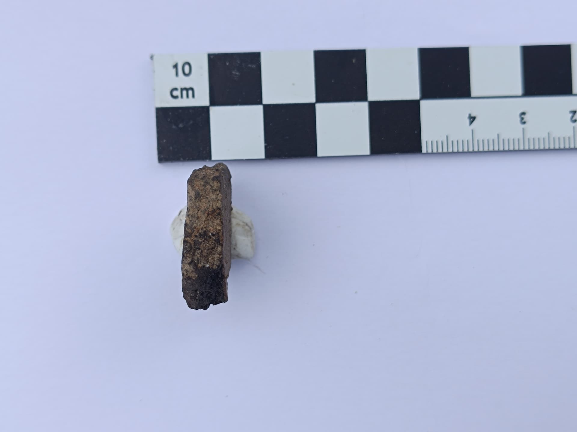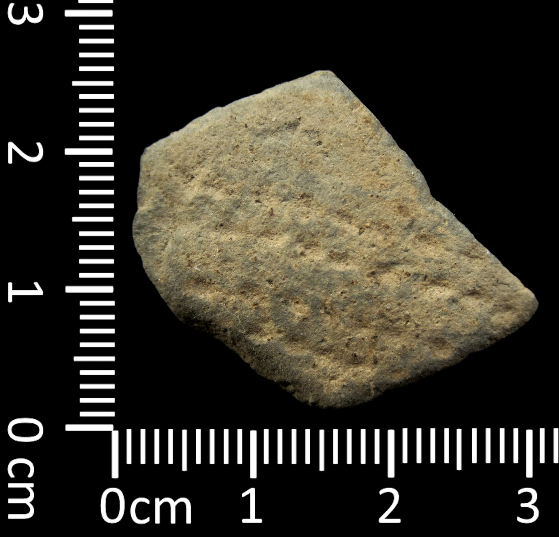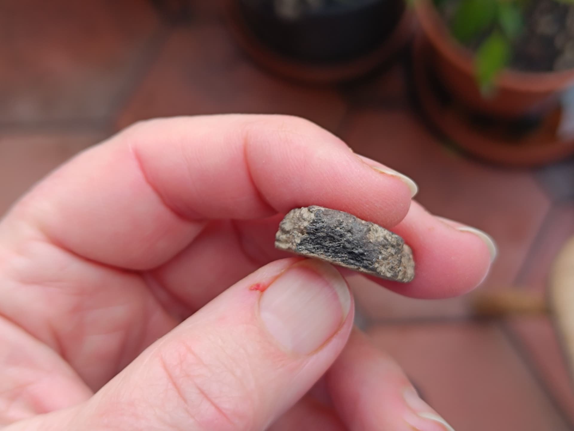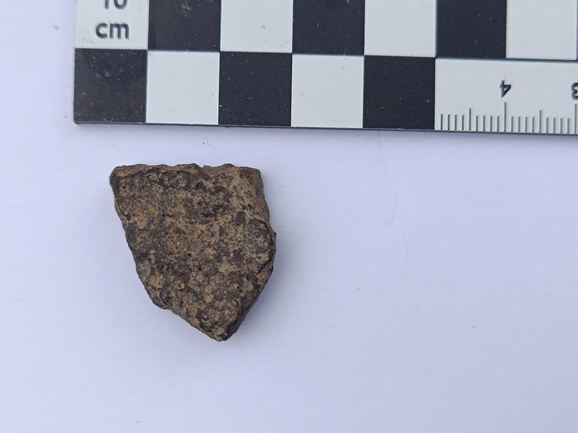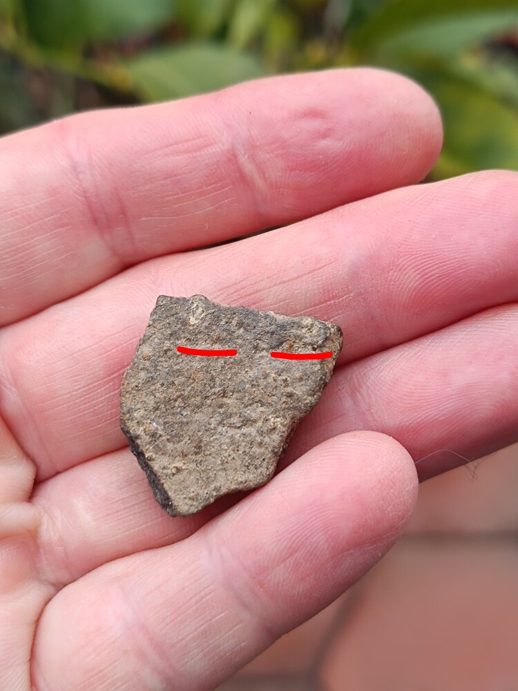 So, hier nochmal die Außenseite bei Tageslicht, nochmal aus der Hand, weil man auf der Unterlage fotografiert die Ritzungen fast nicht mehr erkennen kann. Gestern war die Scherbe noch leicht feucht vom Acker. Ich meine, ganz zart eventuell noch weitere Ritzungen erkennen zu können, eine der Archäologinnen auch, aber ist wirklich schwierig und müssen auch nicht unbedingt weitere drauf sein.