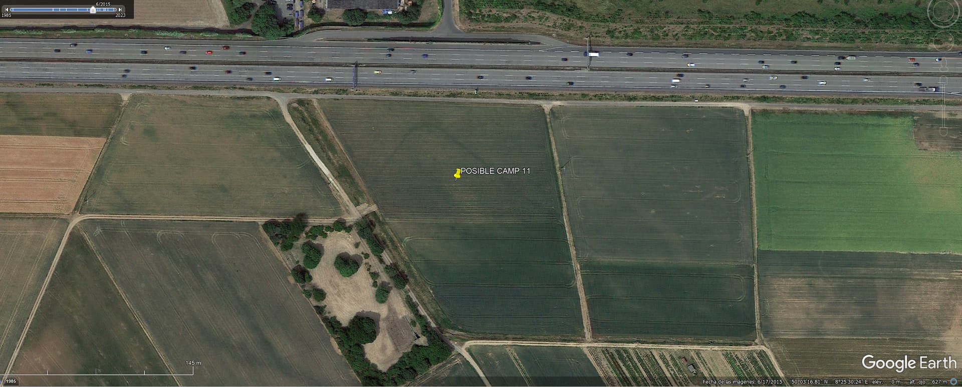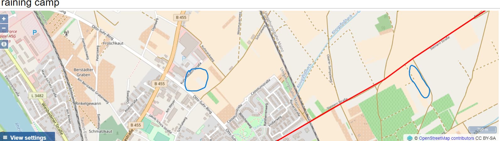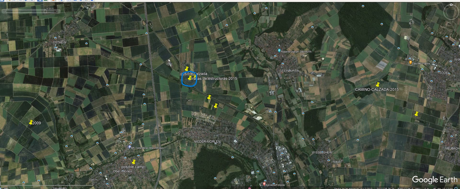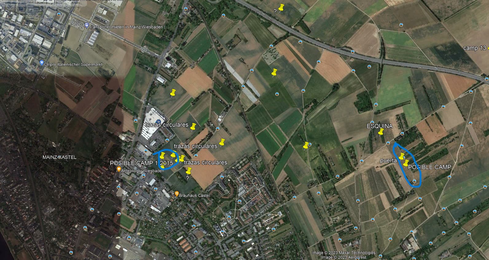 Bei den von @kino gefundenen Lagerstrukturen handelt es sich um bekannte mutmaßliche Übungslager, die unweit des Legionslagers in Mainz zwar rechts des Rheins aber links des Limes gelegen sind.
