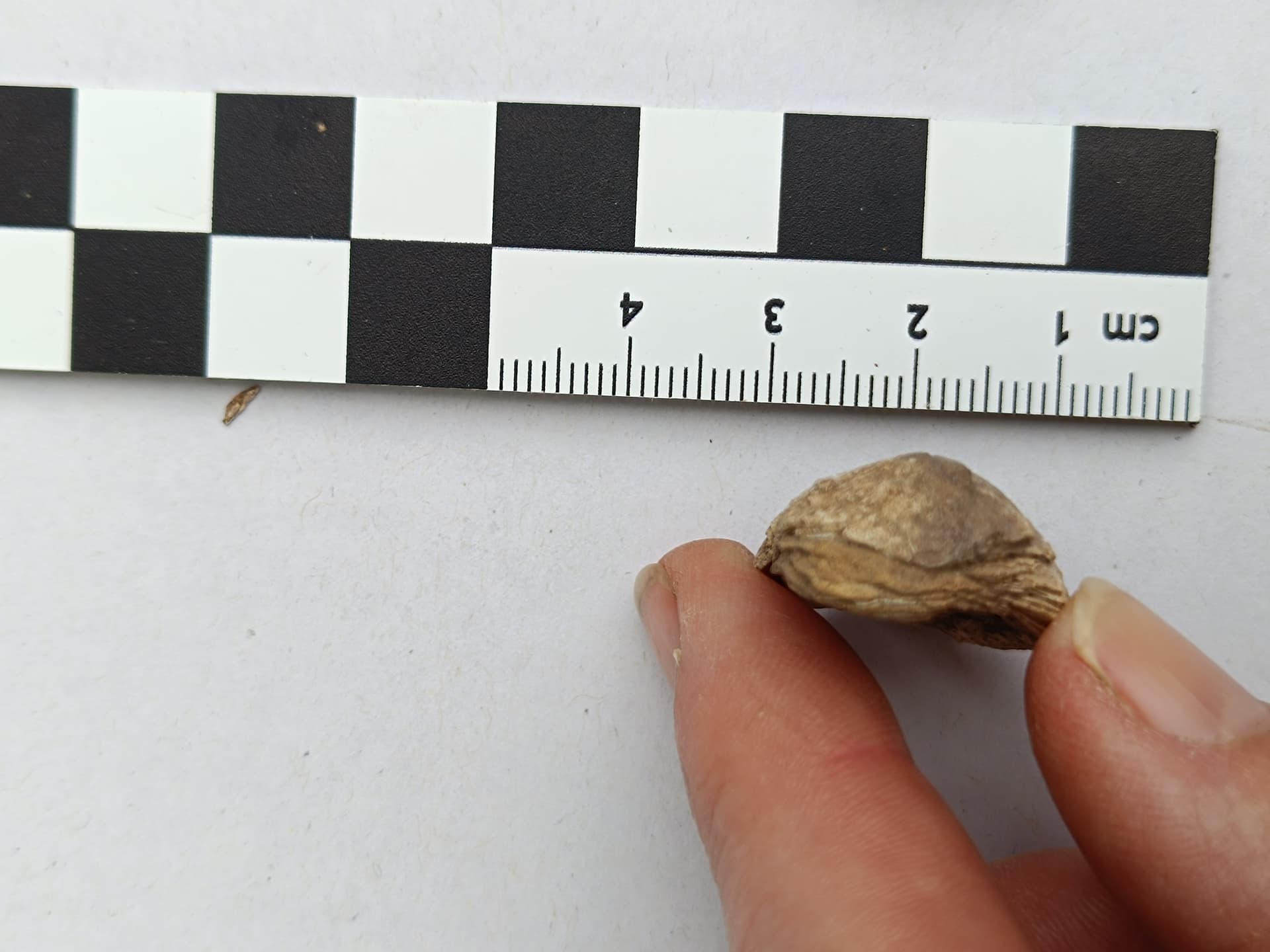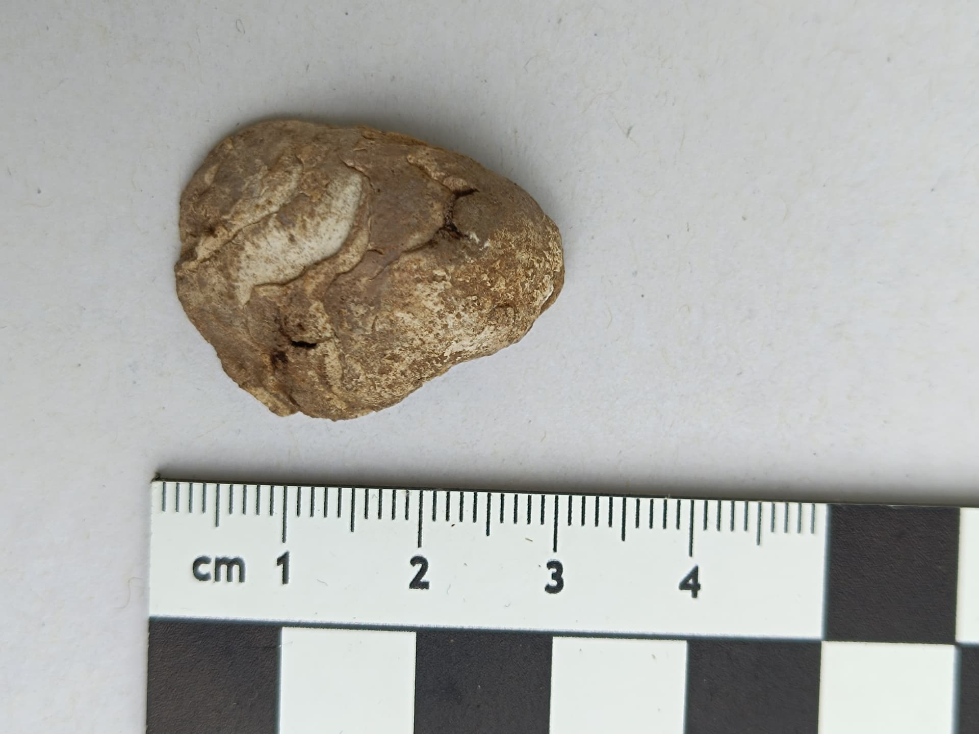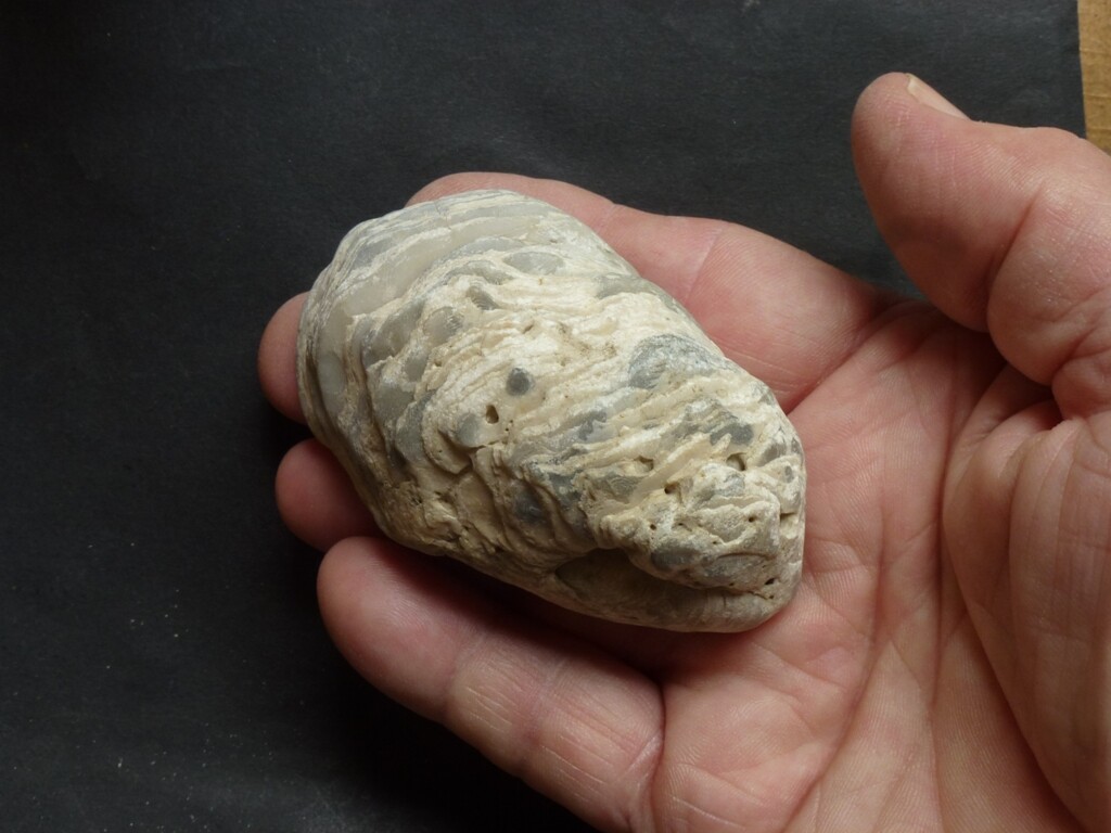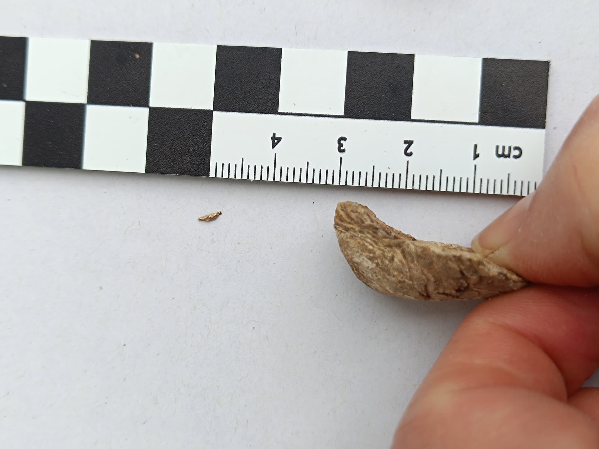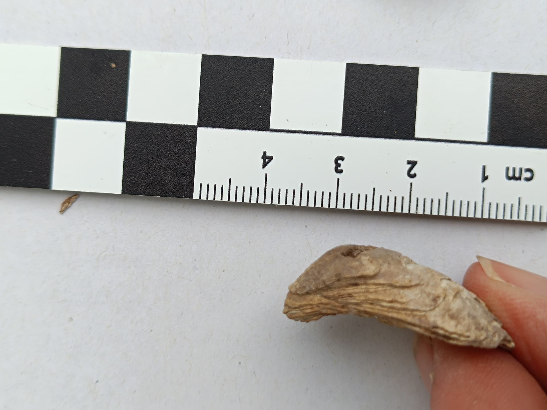 nach längerer Zeit aufgrund Zeitmangels war ich gestern noch schnell bei der Neolithsiedlung (Ldkr. Passau), um zu sehen, ob der Boden vielleicht schon offen ist. Leider war bereits wieder der Winterweizen angesät, also wieder nix, hab mich sehr geärgert. Bin aber ein paar Minuten den Feldrand abgelaufen, obwohl man in dem Braun-Braun eh nichts erkennen konnte. Aber ein Stück ist mir aufgefallen, und nach etwas Reinigung daheim ist es eindeutig ein Scharnierstück einer wohl ursprünglich recht ordentlichen Muschel. Ich habe etwas recherchiert, es wird sich wohl um den Rest einer Süßwassermuschel handeln, Unio oder Anodanta. Bearbeitungsspuren sind keine zu sehen. Da die Donau an dieser Stelle ca. 20 km entfernt liegt und die Siedlung oben auf einem Hügel liegt, wird sie vermutlich dort hingebracht worden sein. Muscheln liegen dort i.d.R. keine natürlicherweise rum. Versteinert ist sie auch nicht, noch eindeutig kalkig, man kann auch sehr schön die dünnen Schichten erkennen.