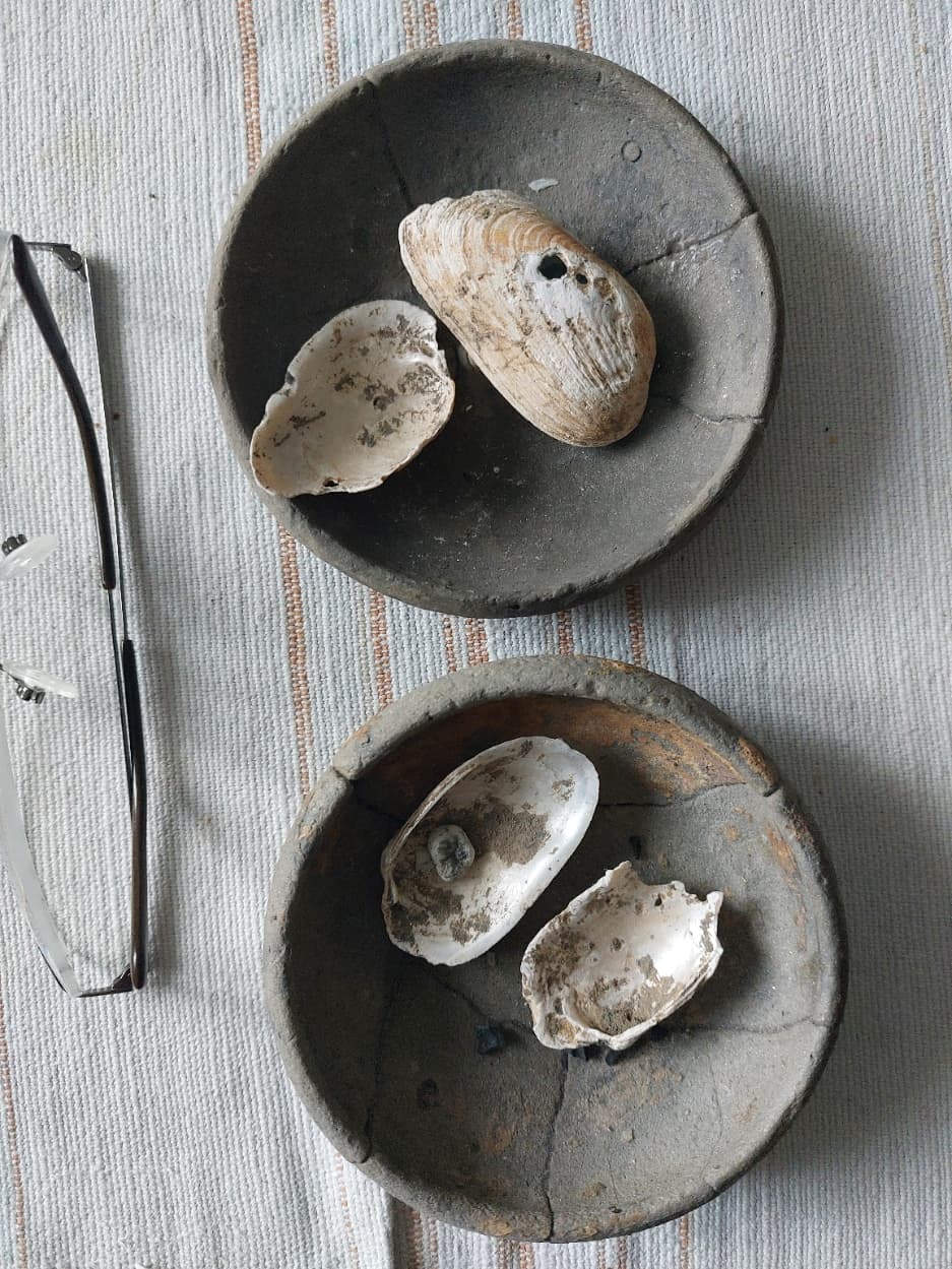 nur als Beispiel gedacht, diese beiden römerzeitlichen Tellerchen wurden bei einer Tiefpflügung in den 80-iger Jahren aus einem römerzeitlichen Gräberfeld ausgepflügt. In den Tellerchen lagen jeweils diese beiden Muscheln.