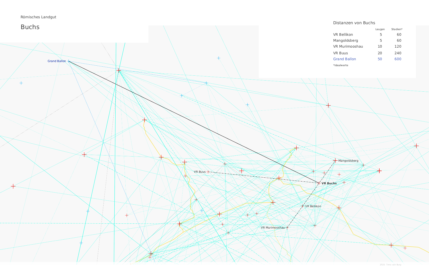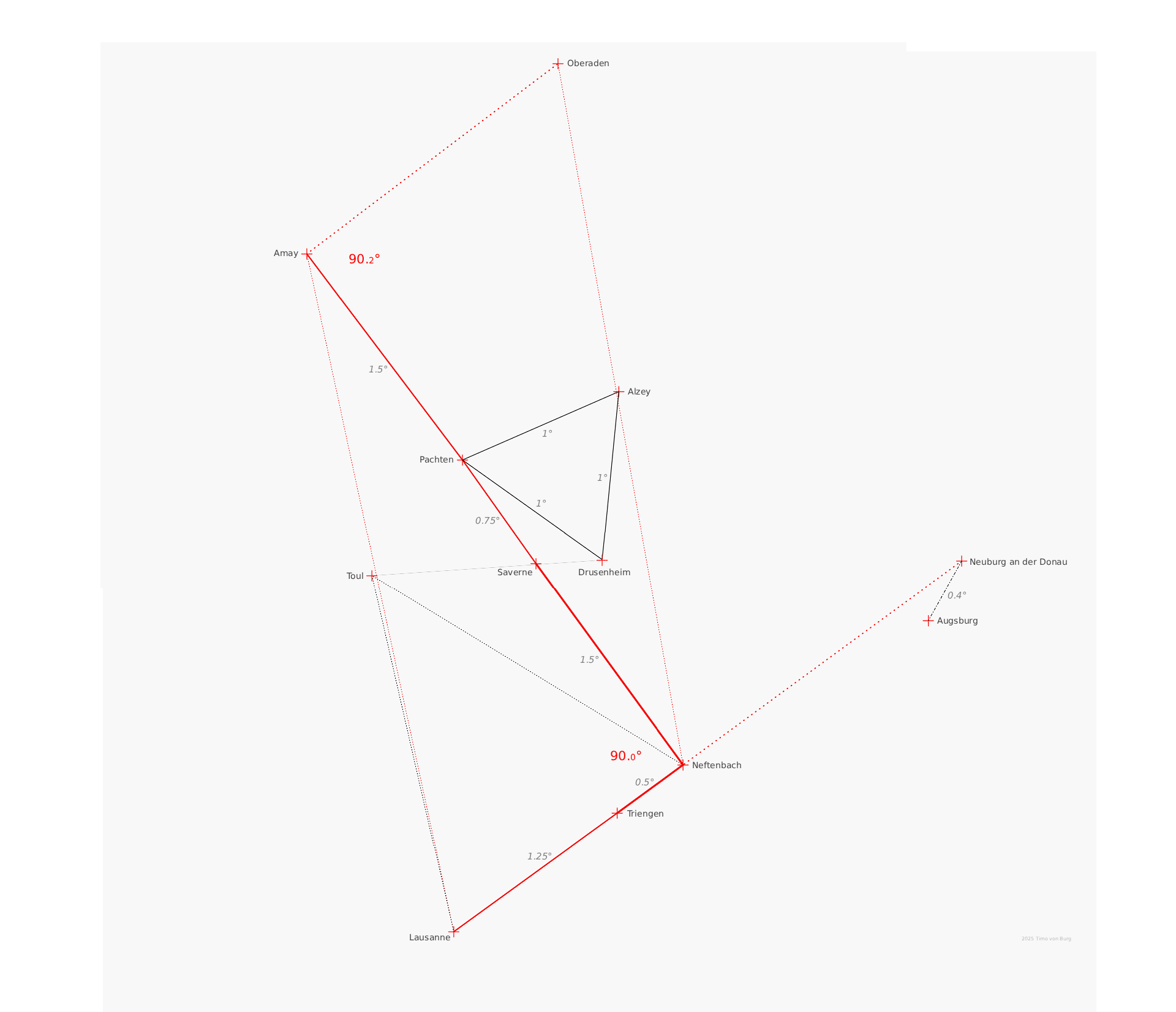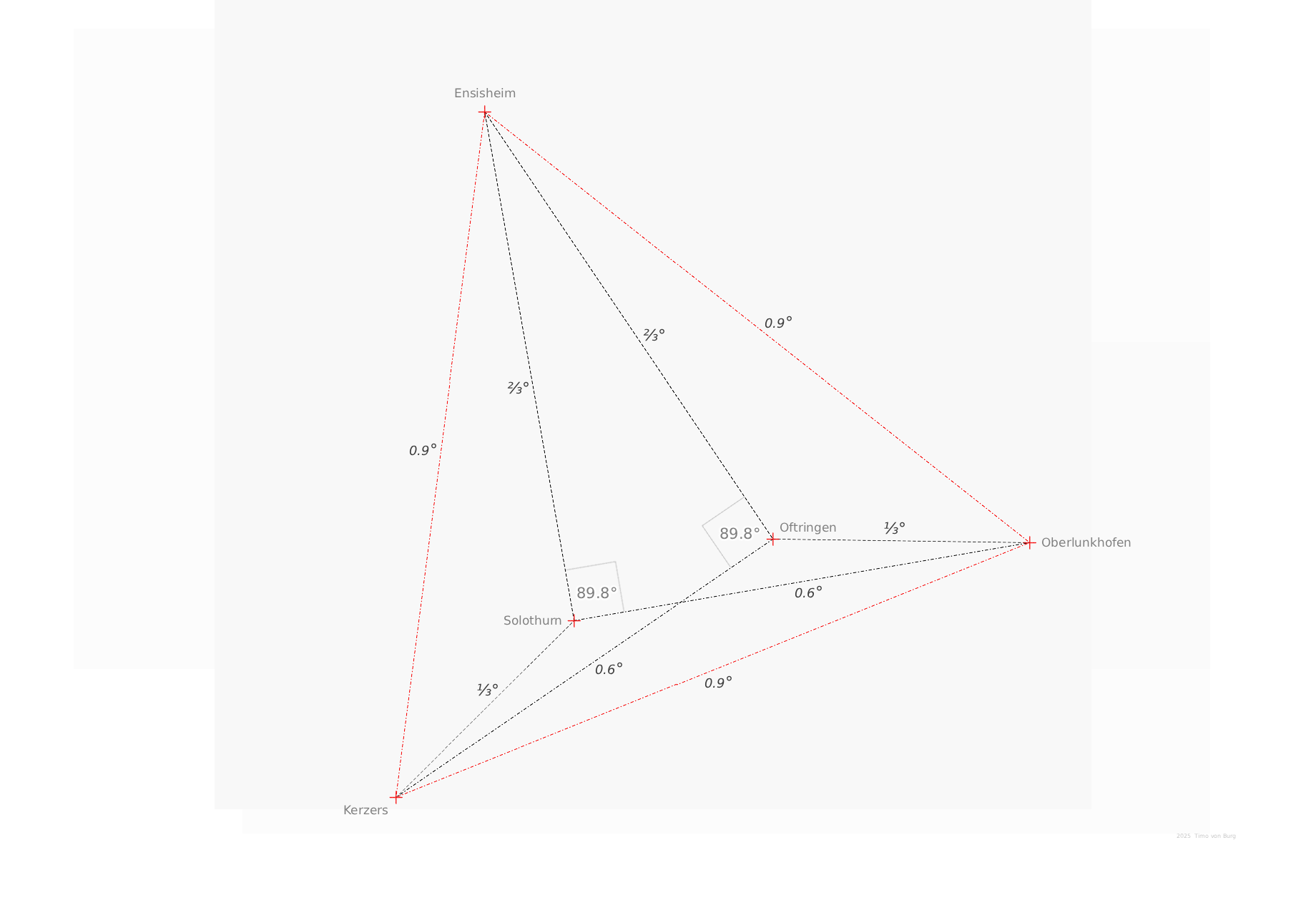 Zum Wachtbühl: auch hier sind 8 Referenzorte vorgegeben bei denen die Entfernung +/1-% einen “glatten” Wert ergeben muß - und dort muss man auch noch einen Turm hinstellen können um etwas zu beobachten. Auch das ist für Länge/Breite ein ziemlich überbestimmtes System, so dass man es m.E. nicht konstruieren kann.