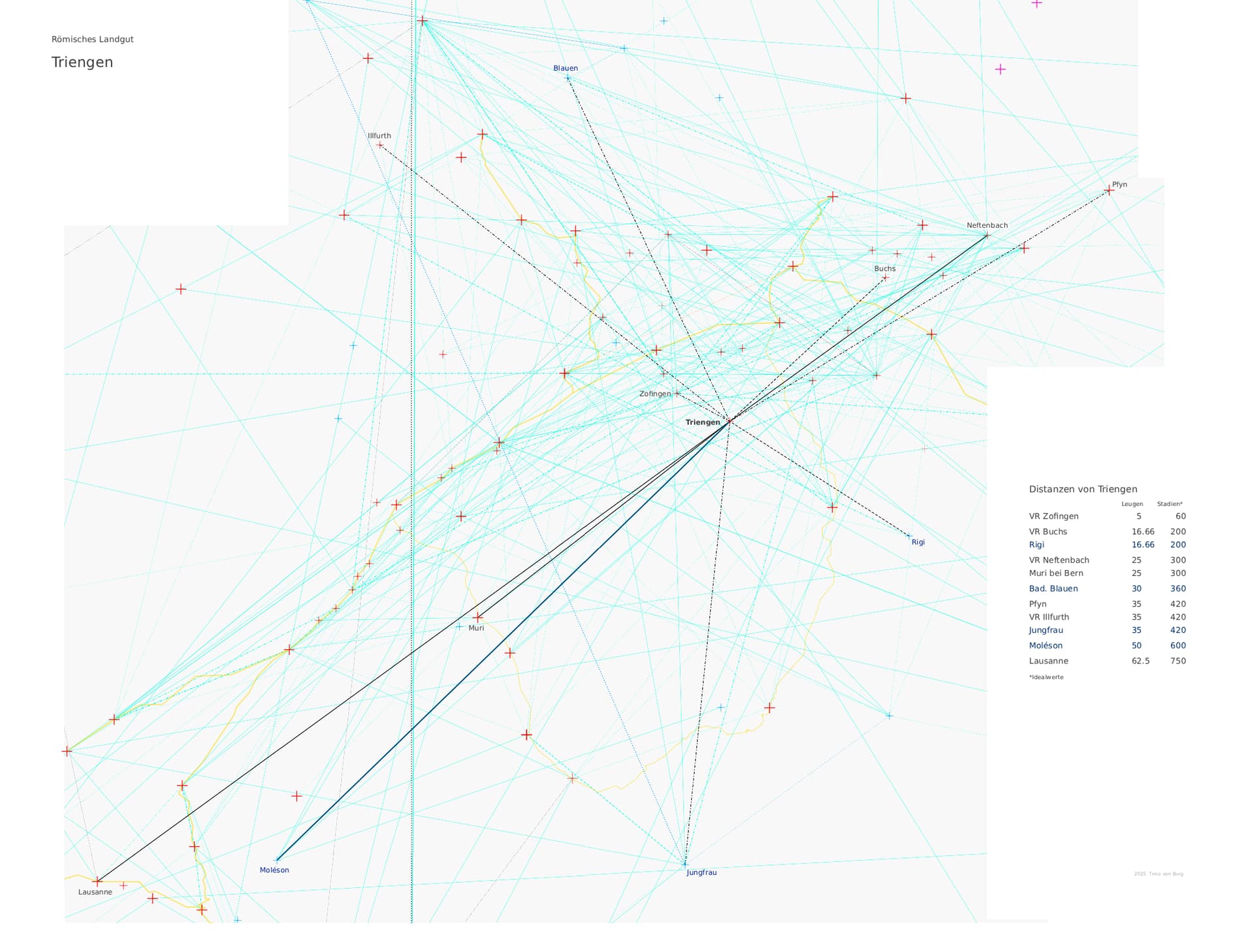 Aber das bringt mich noch auf eine andere Frage: welchen Nutzen haben sie davon gehabt das alles so genau zu vermessen und dann Solothurn genau da zu gründen? Es ist doch ein erheblicher Aufwand erst mal drei Berge zu finden, und dann warten, bis man sie unter optimalen Bedingungen überhaupt anpeilen oder gar besteigen konnte. Diese dann genau zu vermessen um solche Dreiecke reinzulegen. Nur um festzulegen, wo eine Siedlung entstehen soll.