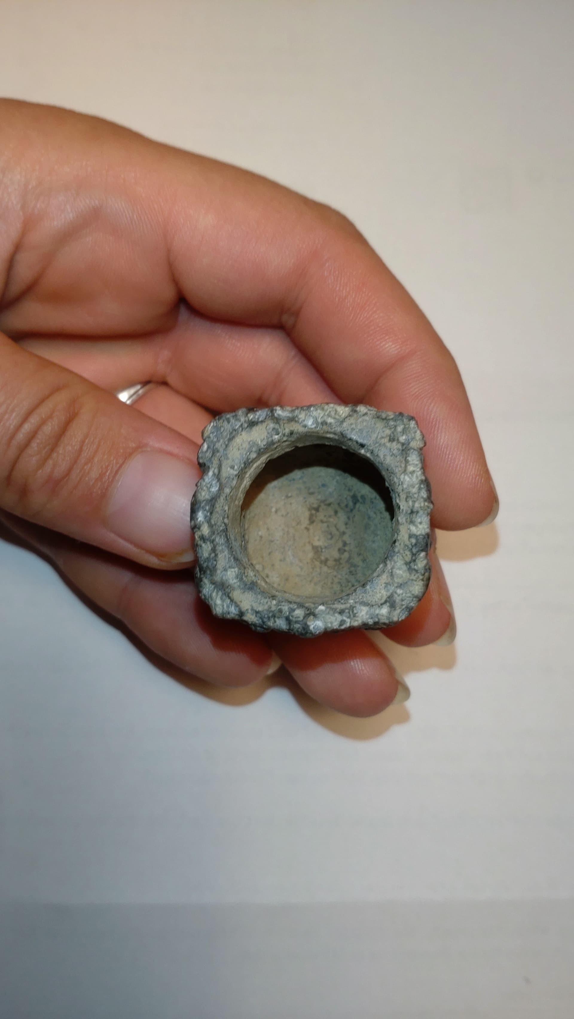 Hallo zusammen, mein Name ist René aus dem Landkreis Kulmbach in Oberfranken. Bei arbeiten in meinem Garten habe ich ein Objekt gefunden, dessen Bedeutung, Nutzen oder Gebraucht vollkommen unbekannt ist. Ich beschäftige mich schon seit Jahrzehnten mit dem Thema Archäologie ( Frühmittelalter und Mittelalter). Das Objekt ist augenscheinlich aus Bronze und handgefertigt. Auf allen vier Seiten sind Wappen ähnliche Strukturen erkennbar. Weiterhin ist das Objekt unterhalb der Wappen mit Kreisen verziert. Auf der Spitze scheint ein Hahnenkamm oder Hahn zu sein. Meine erste Vermutung lag bei einem Knauf (Schwert / Dolch) oder einem verzierten Hohlgewicht. Vielleicht ist es auch etwas ganz anderes.