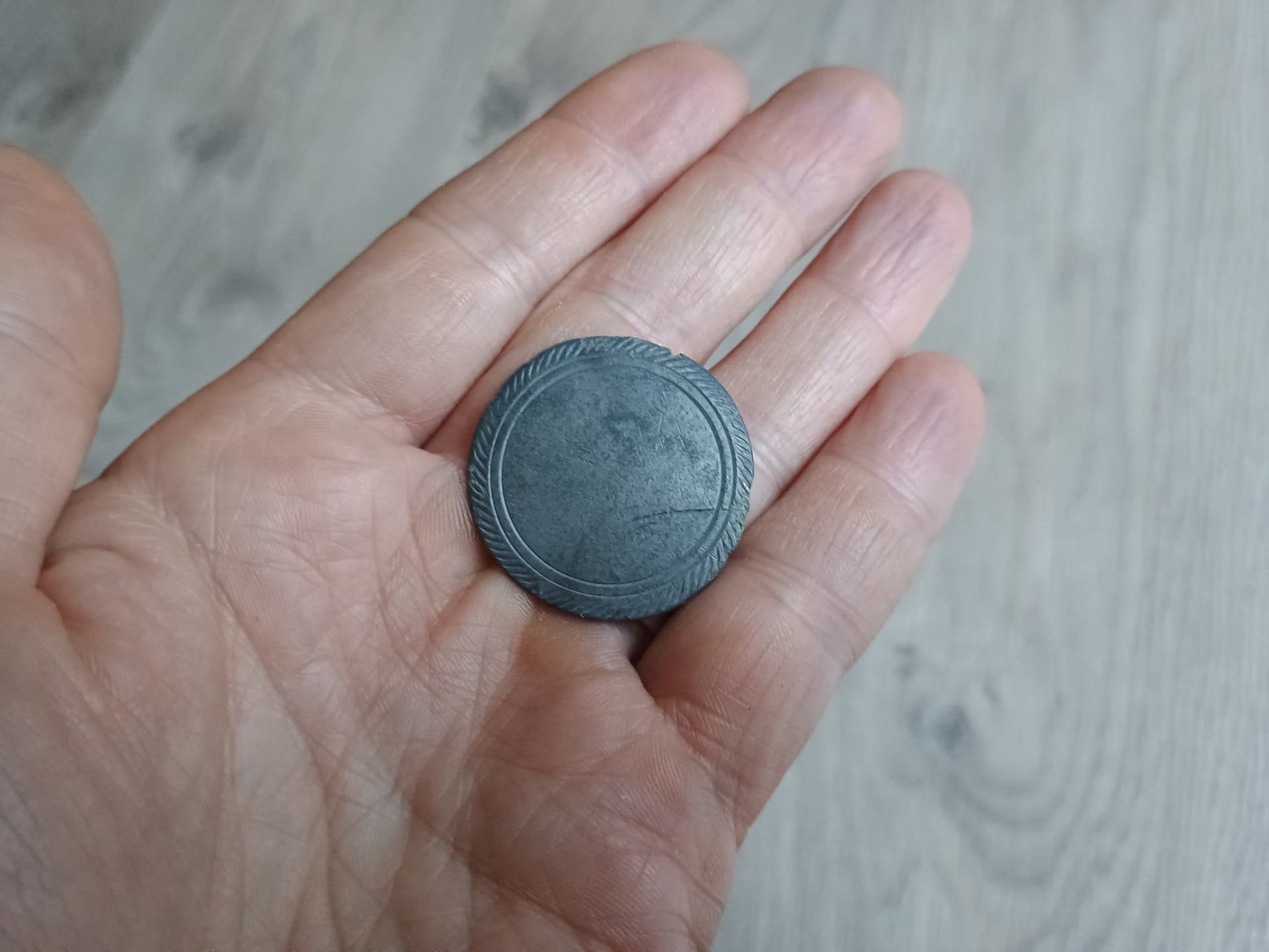 Der Knopf sieht ganz ähnlich zu dem, den ich im Garten gefunden hatte. Die Gravur wurde wohl von Hand gefertigt, da sie sehr unregelmäßig ist. Auf der Rückseite war wohl eine Öse angelötet. Was aussieht wie eine Erhöhung, ist tatsächlich eine Mulde. Vermutlich damit die Öse besser hält. Fand ich ein Recht interessantes Detail.
