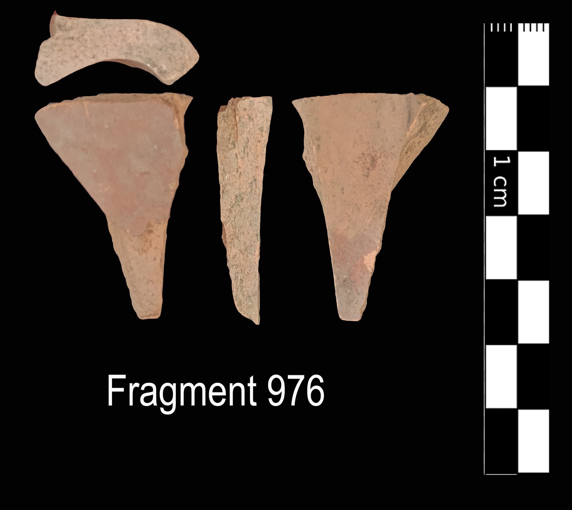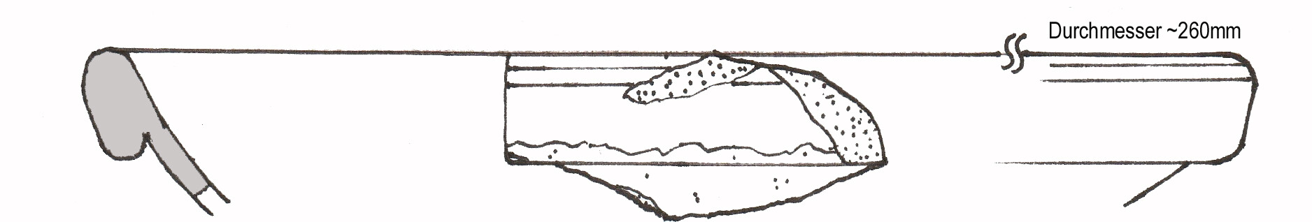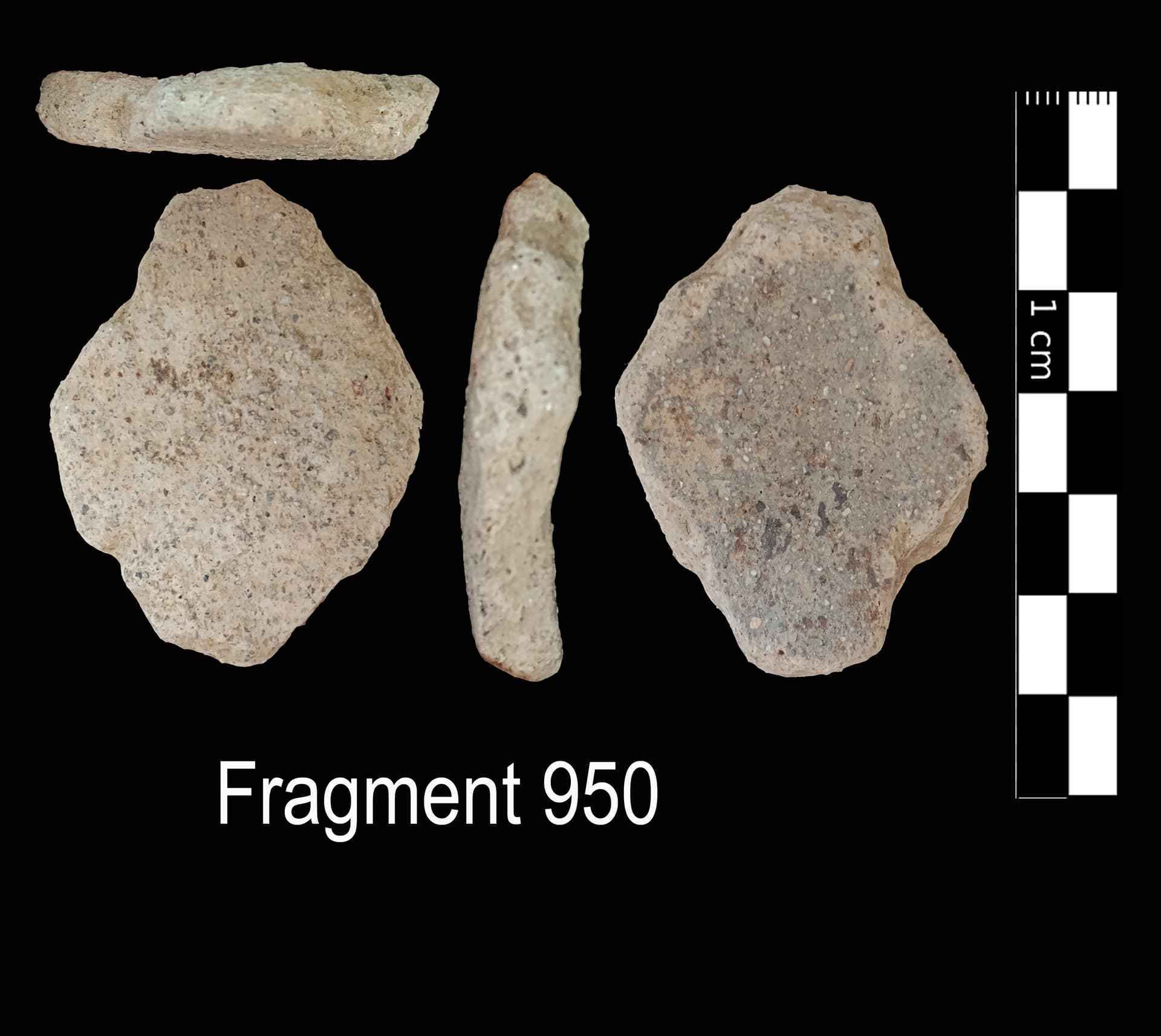 Fragment 810 hat er als eher Grapenfuß eingeschätzt. Evtl. auch eine hornförmige Handhaben. Die Bläschen hält er für Gebrauchsspuren vom Einsatz im Feuer.