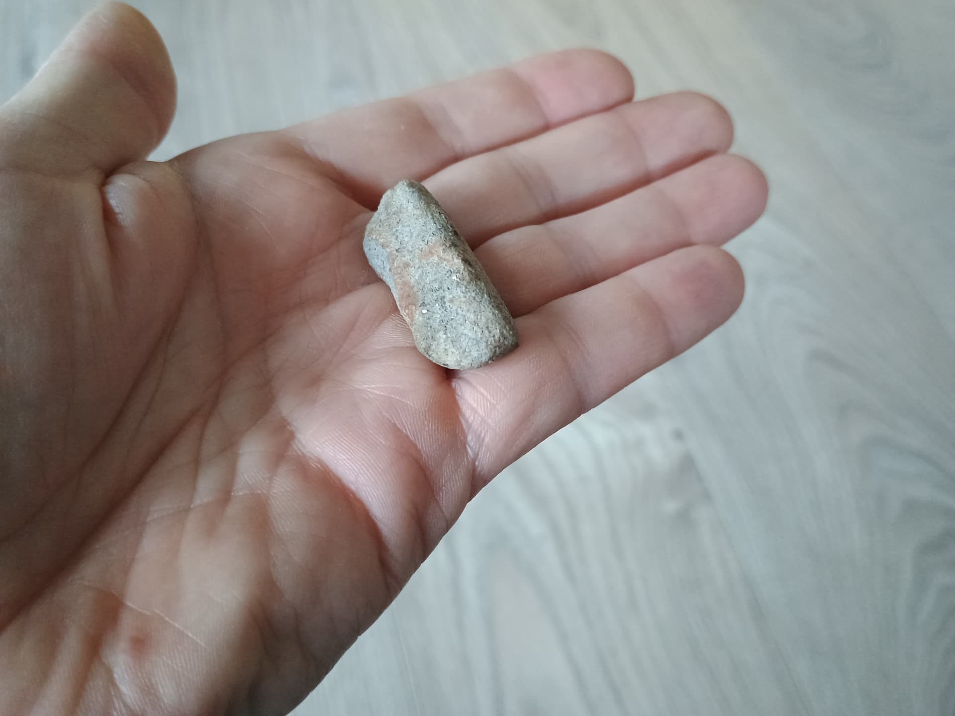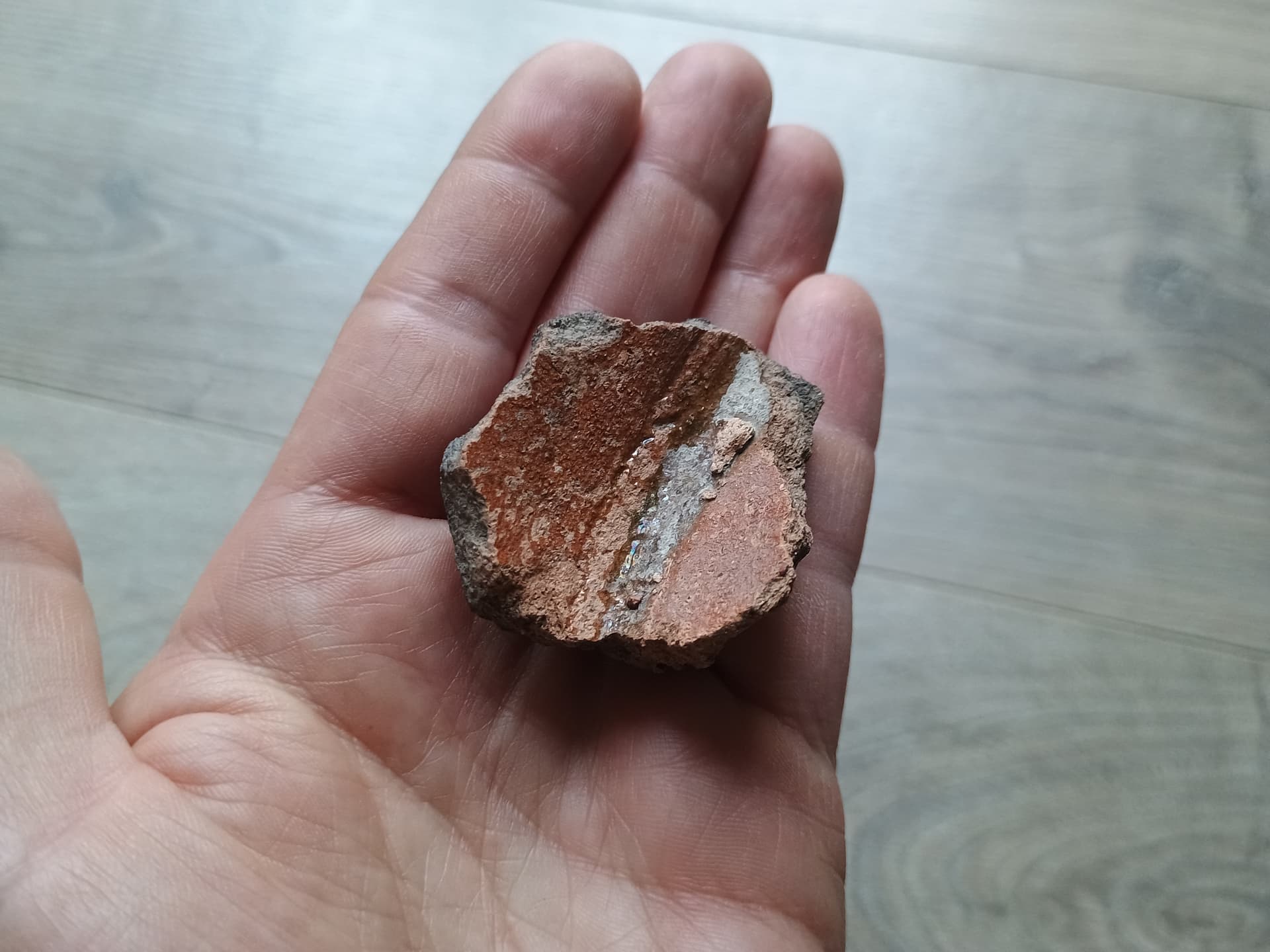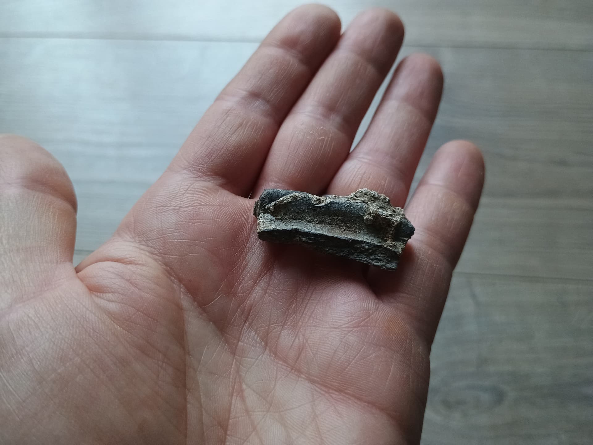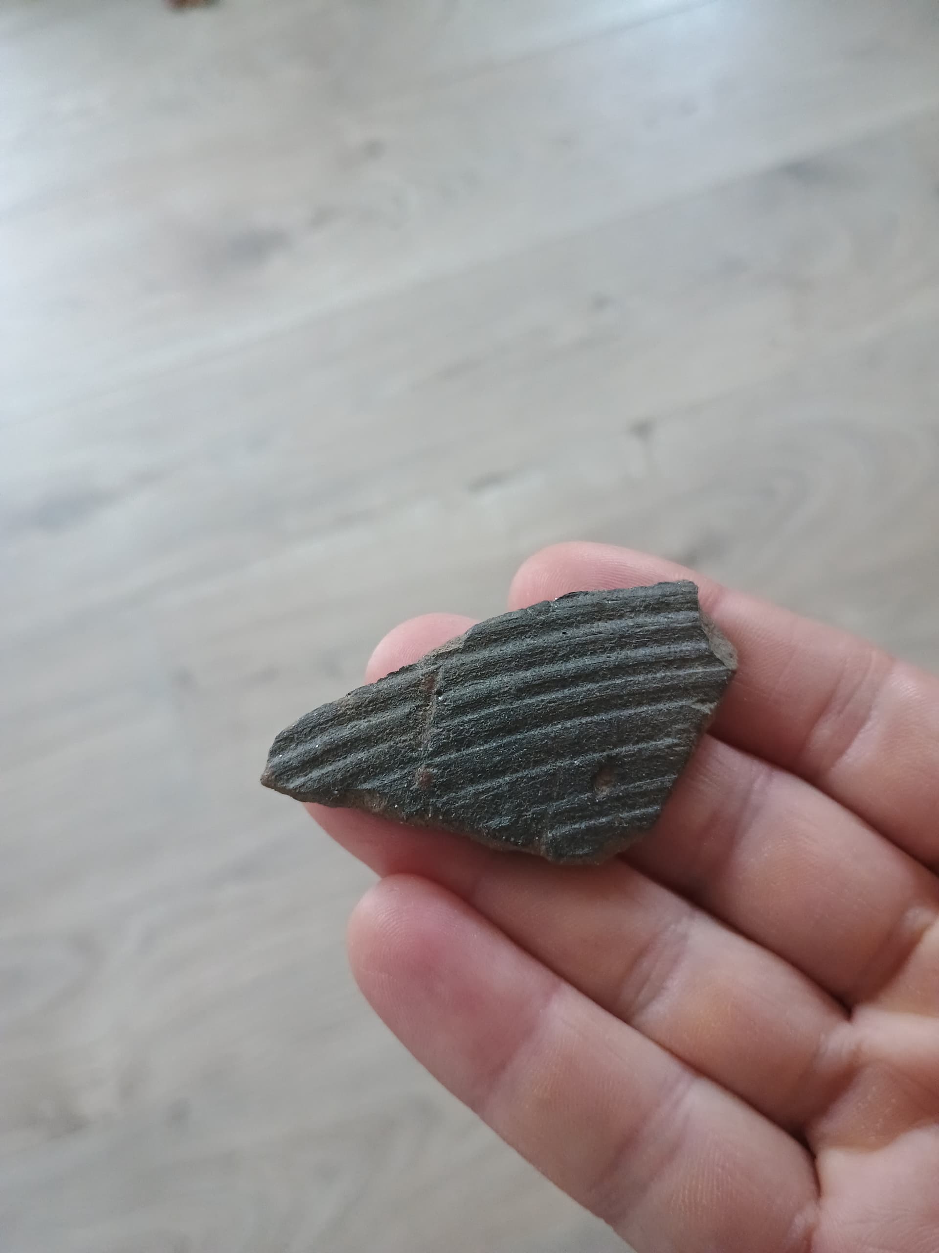 Ihr werdet euch jetzt fragen, was ist jetzt das? So hab ich auch erst Mal geschaut. Als ich es in der Erde gefunden hatte, dachte ich erst an ein Stück Kabelmantel, beim Waschen würde allerdings klar, dass es das nicht ist. Ich dachte dann als nächstes an ein Stück Beton aus der die Armierung rausgerostet ist. Als nächstes dachte ich an ein Stück Betonzuberrand. Erst als es dann trocken war, war ich mir sicher ein Grauwarerand mit Zementkontamination vor mir zu haben. Die Beschreibung des Stückes ist durch die Kontamination etwas schwierig. Ich will es trotzdem versuchen.