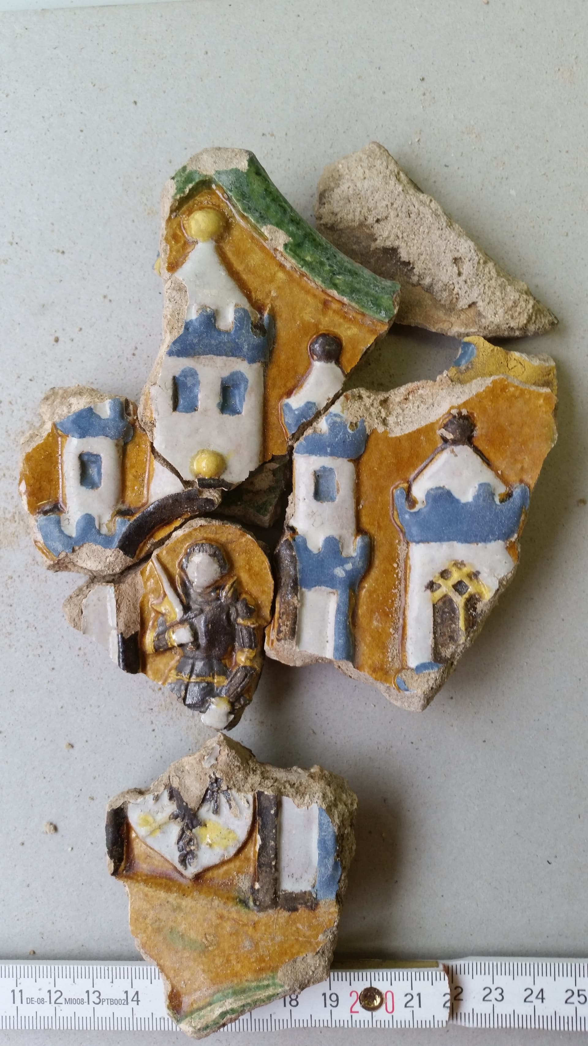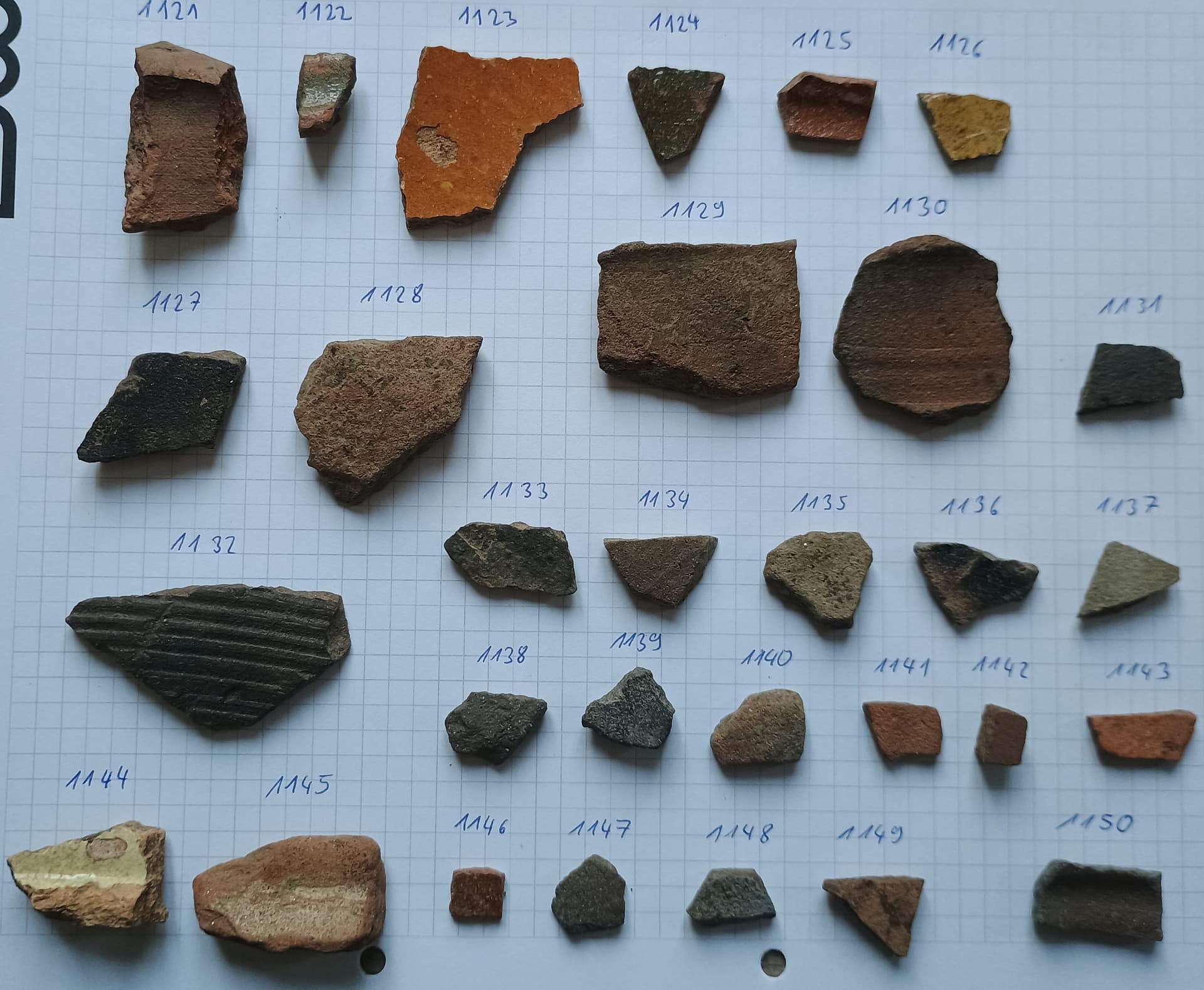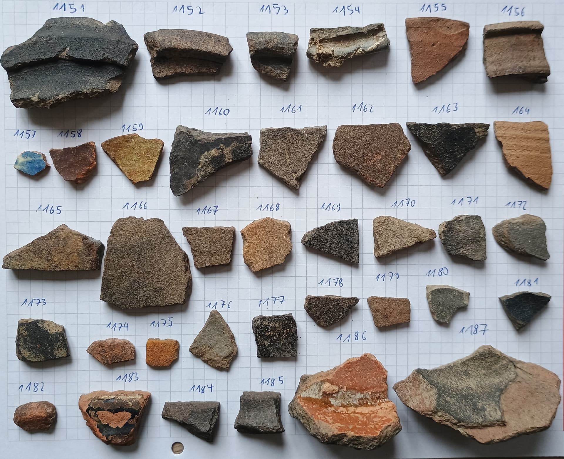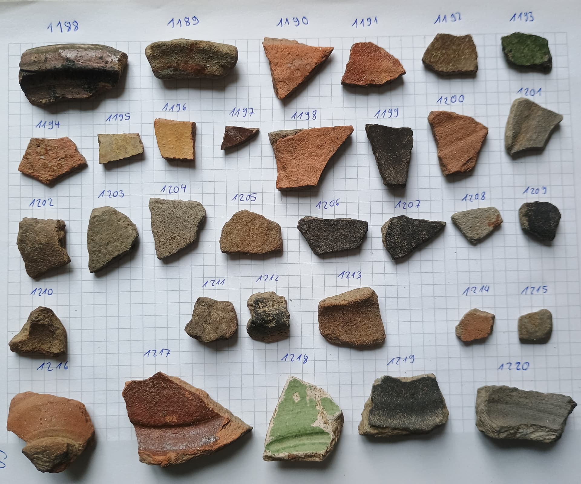 Diesmal viele sehr große Funde, aber leider nichts zueinander passendes. Wir haben sechs Randstücke unglasiert (1151 bis 1156). Die letzten beiden sind vermutlich Deckelstücke. Dann drei glasierte Wandstücke (1157- 1159). Ein Halsstück (1181). Eine Ofenkachel (1183), die möglicherweise zu der Ofenkachel mit schwarzer Glasur und Goldverzierung passt. Allerdings hab ich auf dem neuen Fund kein Gold gefunden, daher Fragezeichen. Vier Bodenstücke (1184-1187). Ein Mini-Stück, welches ich nicht zuordnen kann (1182). Der Rest sind unglasierte Wandscherben.