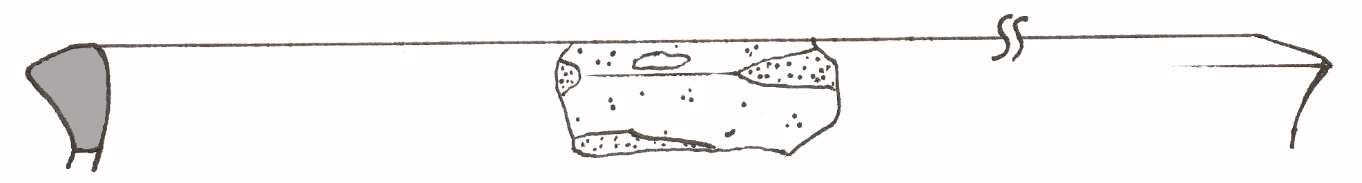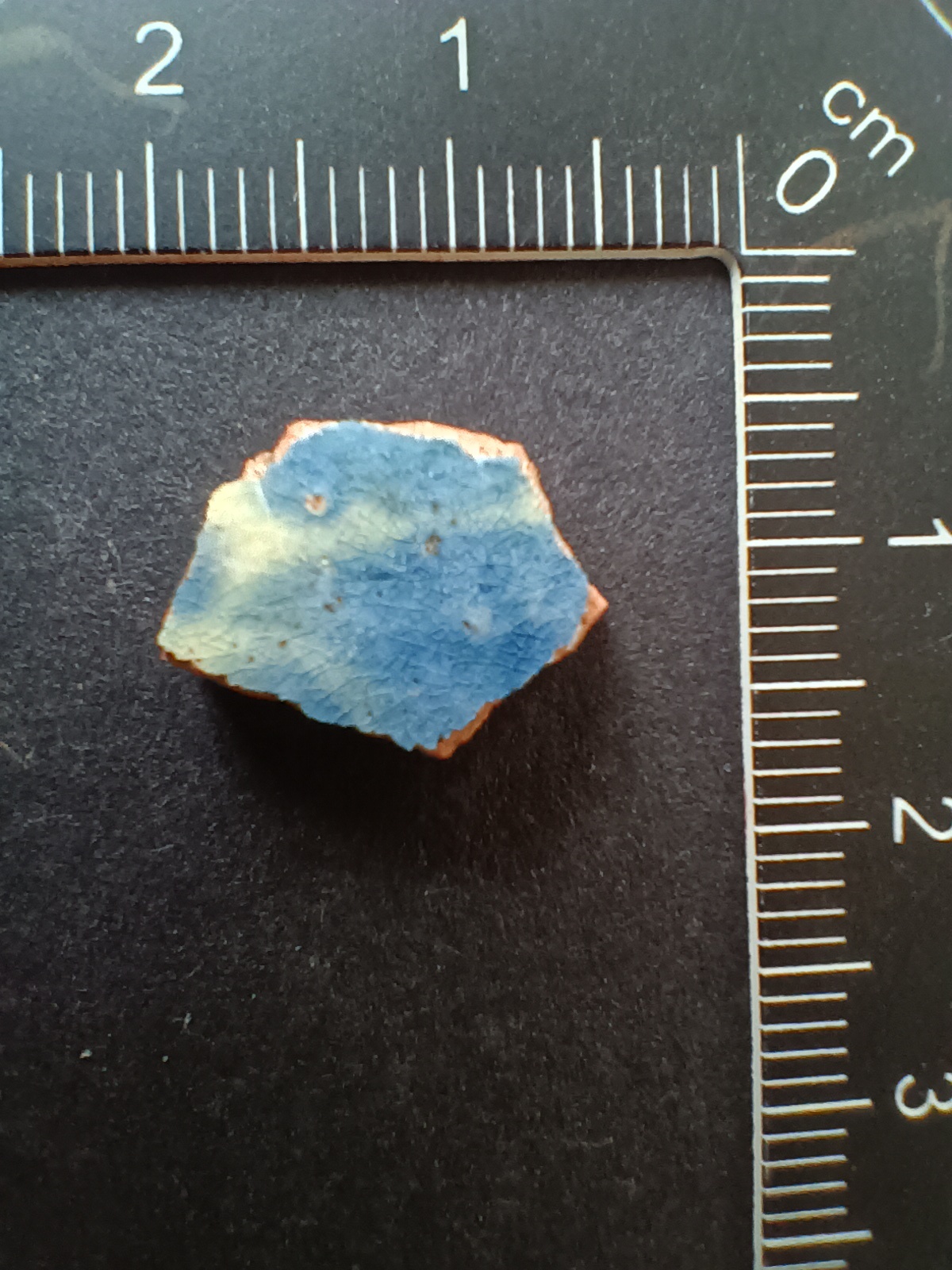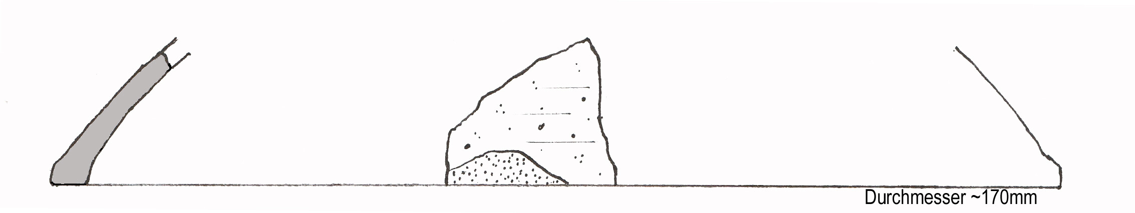 Das Stück ist reduzierend hart gebrannt und sehr fein gemagert. Glimmer ist nur wenig zu erkennen. Das Stück scheint innen geglättet zu sein. Aus diesem Grund würde ich das Stück in der frühen Neuzeit vermuten.