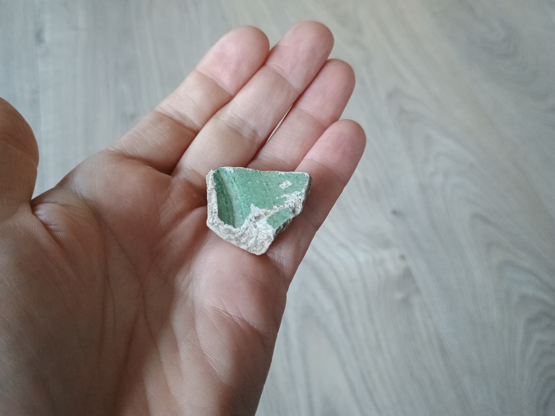 Das Stück würde offenbar erst reduzierend gebrannt. Der Boden hatte aber wohl Sauerstoff abbekommen und ist daher oxidierend gebrannt. Dadurch war das Stück nicht wasserfest und der Töpfer entschied sich wohl eine Innenglasur zu machen, um das Stück abzudichten. Auch hier wieder Pech: scheinbar ist weiter oben etwas zerbrochen und dann in die Glasur runter gefallen und festgebrannt. Kann mir vorstellen, dass dies sehr ärgerlich war.