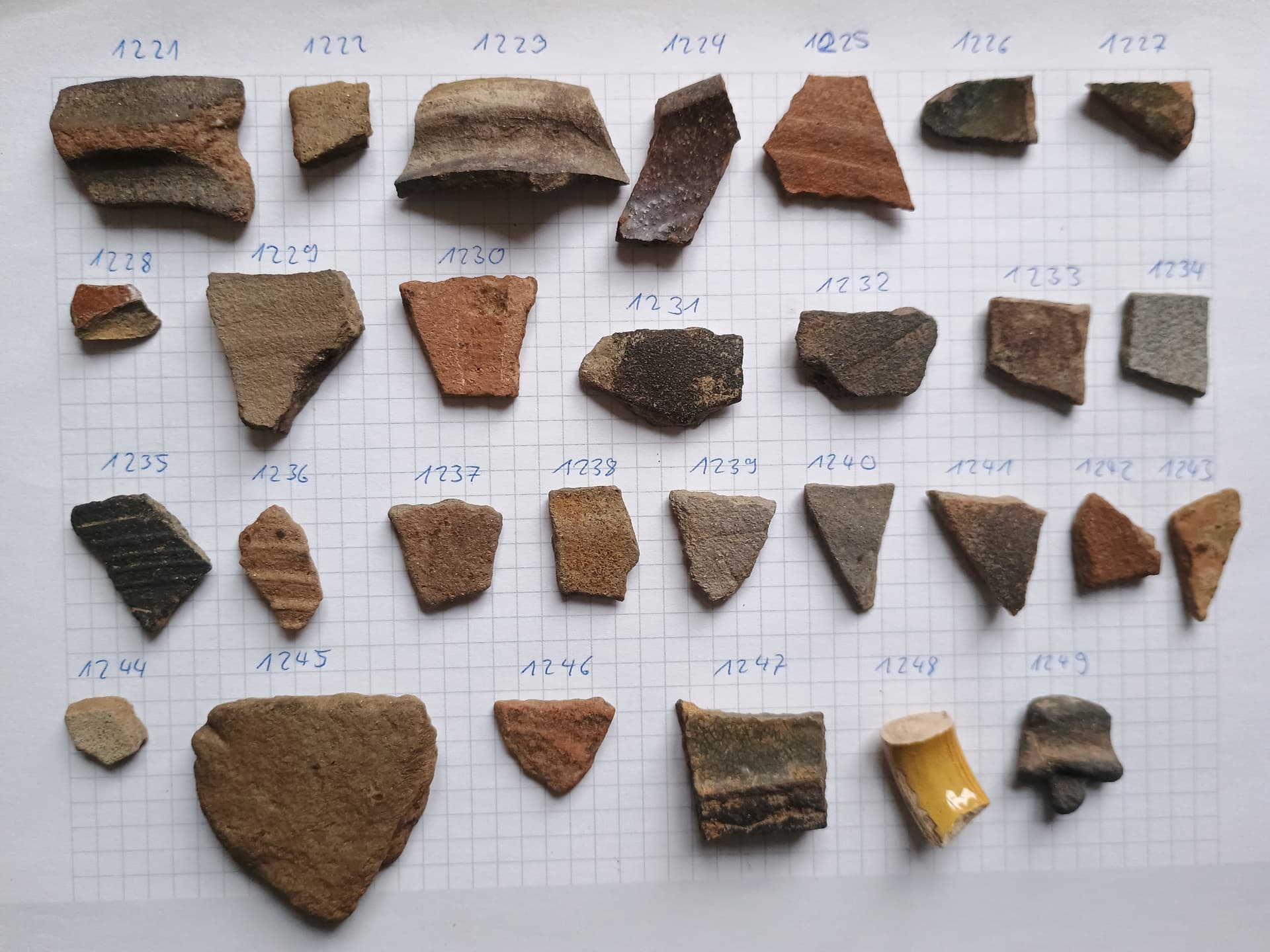 Wir haben zwei Randstücke unglasiert (1221, 1222) und zwei glasiert (1223,1224). Vier Wandstücke glasiert (1225-1228) und sechzehn unglasiert (1229-1244). Drei mutmaßliche Bodenstücke (1245-1247) und zwei Handhaben (2248,1249).