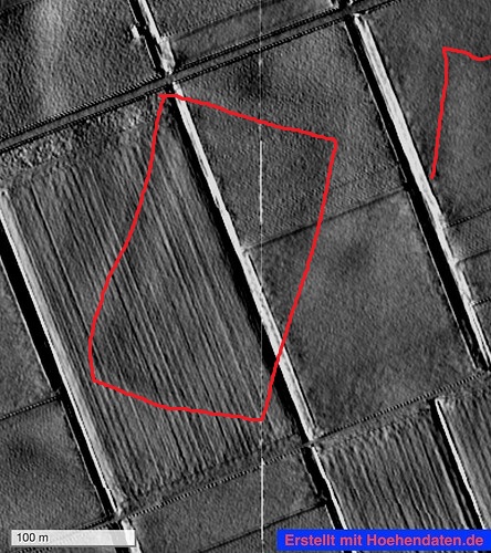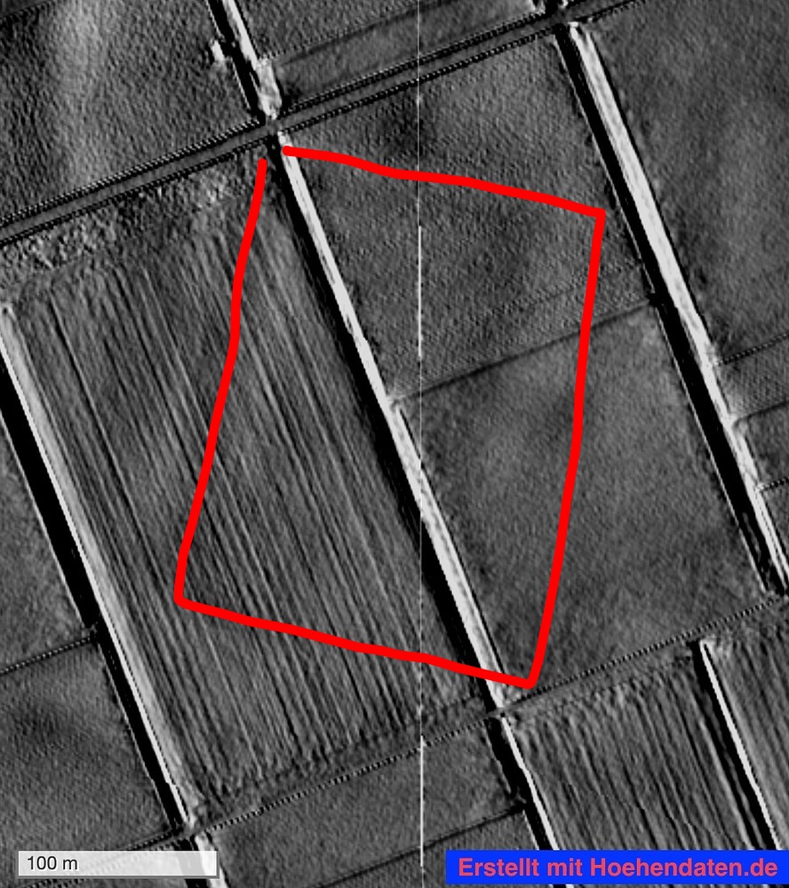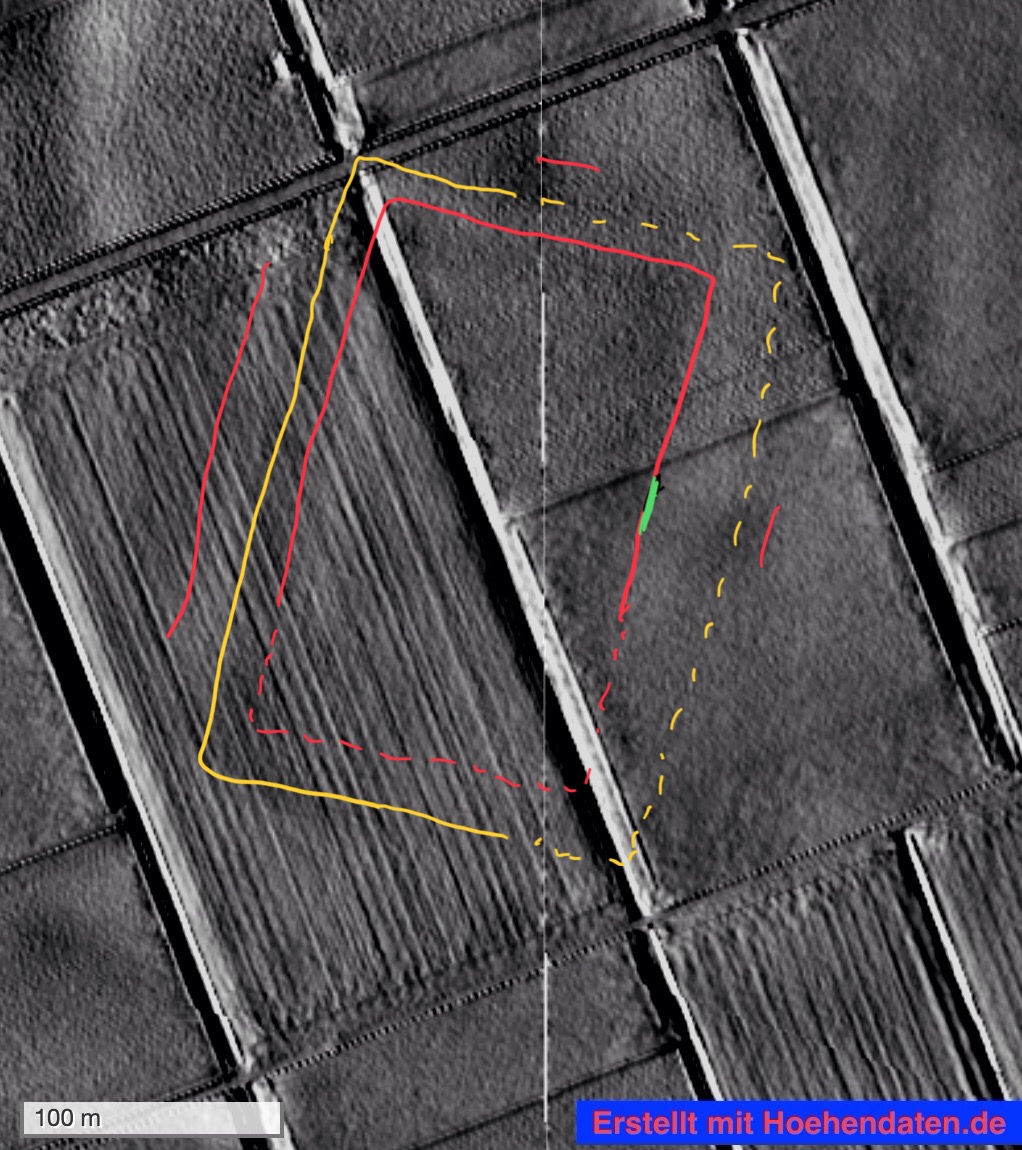 ich sah diesen Abschnitt ebenfalls , allerdings eher mehr in einem extremeren Rechteckformat, der Bodenverfärbung folgend. Ein derartiges Rechteckformat würde für eine Schanze wohl eher nicht zutreffend sein.