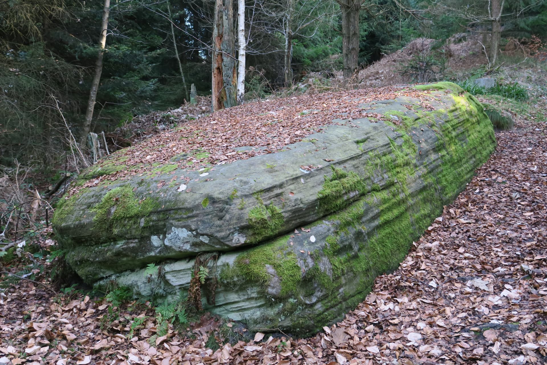 ich bin mir sicher auch dafür gibt es eine natürliche Erklärung. Jedenfalls erscheint es mir nicht sinnvoll den kompletten Stein abzutragen um chaotisch Näpfe stehen zu lassen. Da hätten Menschen ein sinnvolles Muster gewählt und vermutlich auch nicht den ganzen Stein abgetragen.