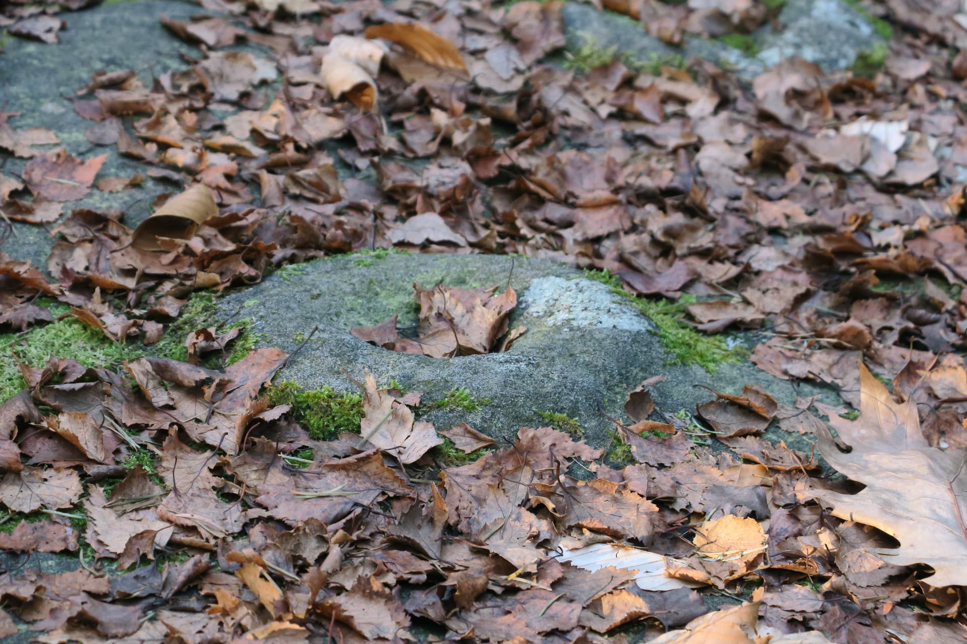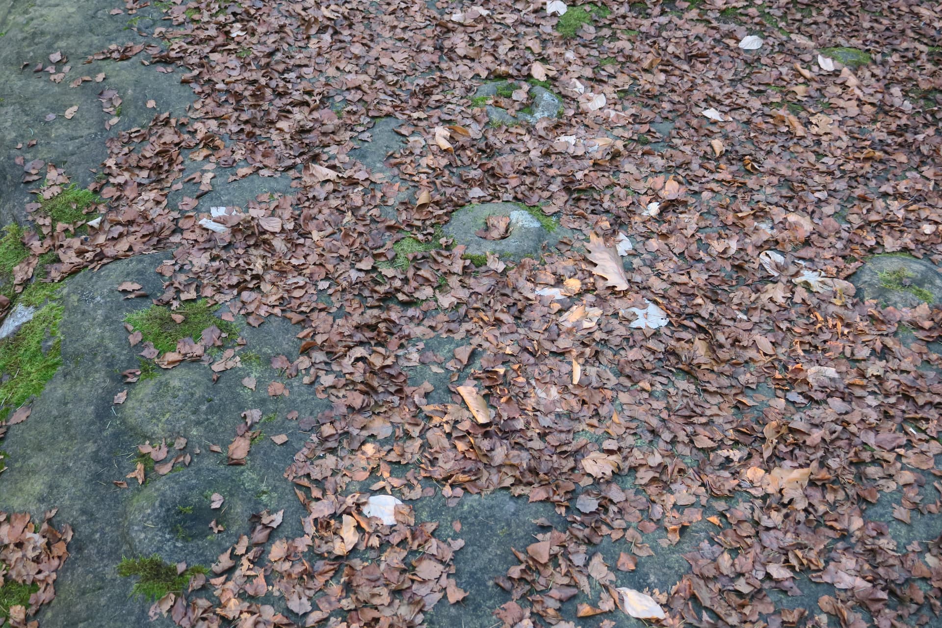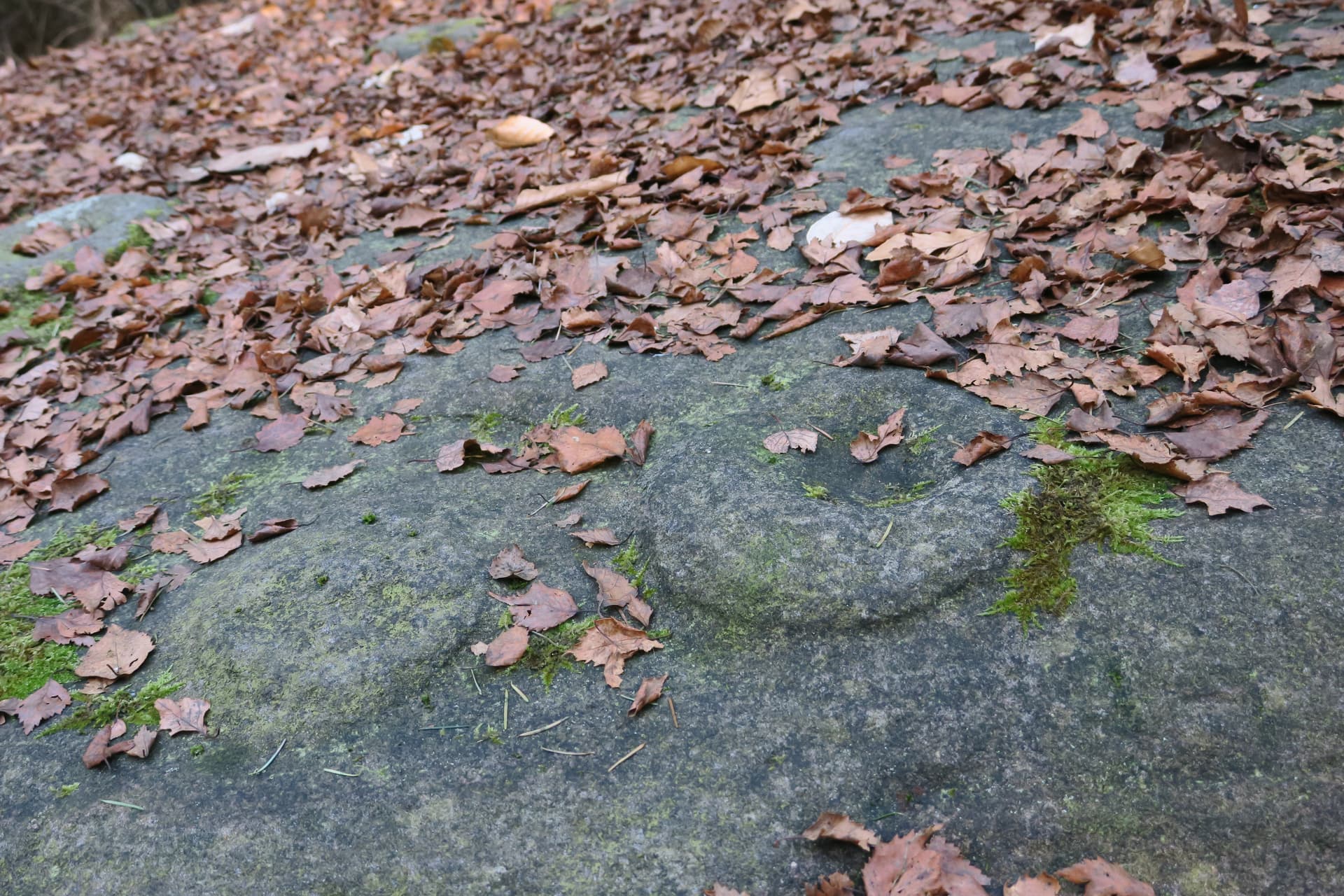 Auf dem Foto Mauzenstein-1 kann man rechts unten bereits einige Schalen erkennen, die von einer wulstartigen Umrandung eingefasst werden und sich über die Schichtungen des Gesteins hinweg ziehen. Klettert man auf den Felsklotz so wird offenbar, daß sich auf dessen Oberfläche ca. ein halbes Dutzend dieser speziellen Schalen befindet, die man aber aufgrund der Laubbelags teilweise nur erahnen kann (Mauzenstein-2)