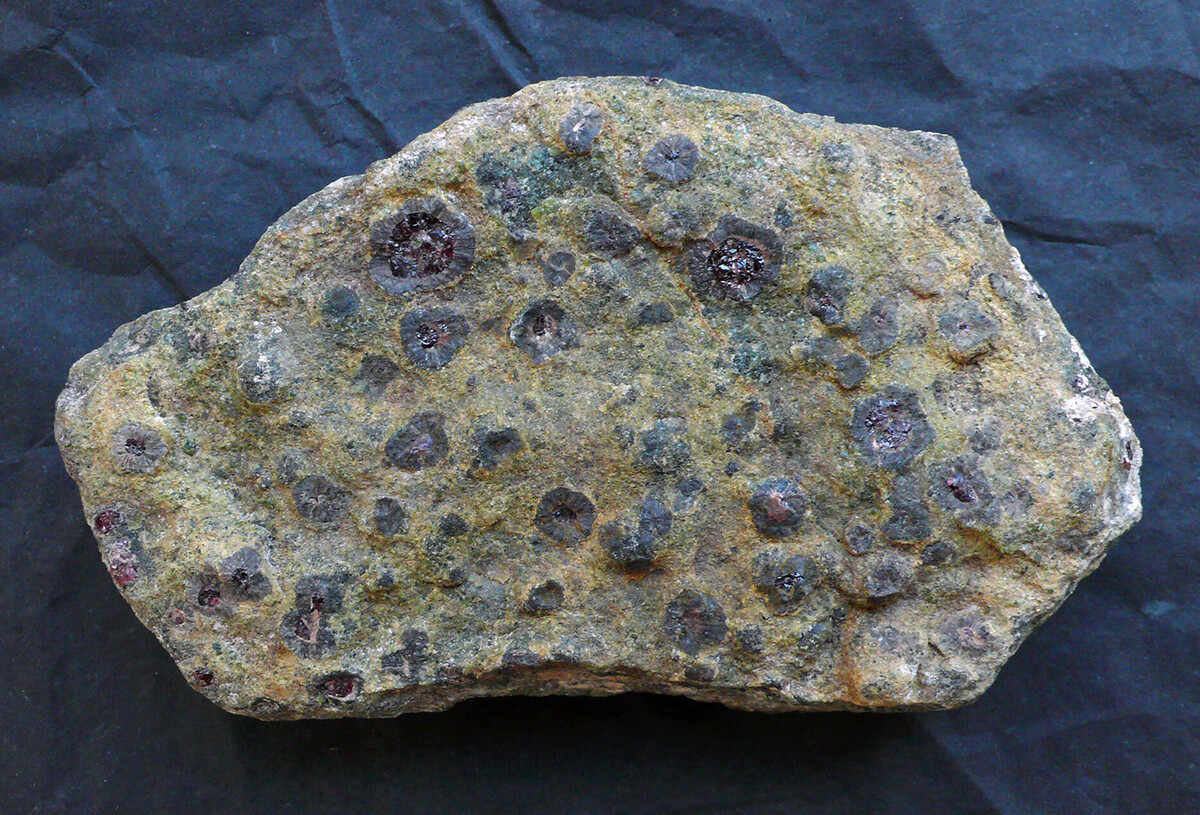 ich fürchte, Jürgen liegt hier falsch. Die ‘dunklen Punkte’ auf dem ersten Bild in seinem Link sind Pyropkristalle, also Granate, in einer magmatischen Matrix.