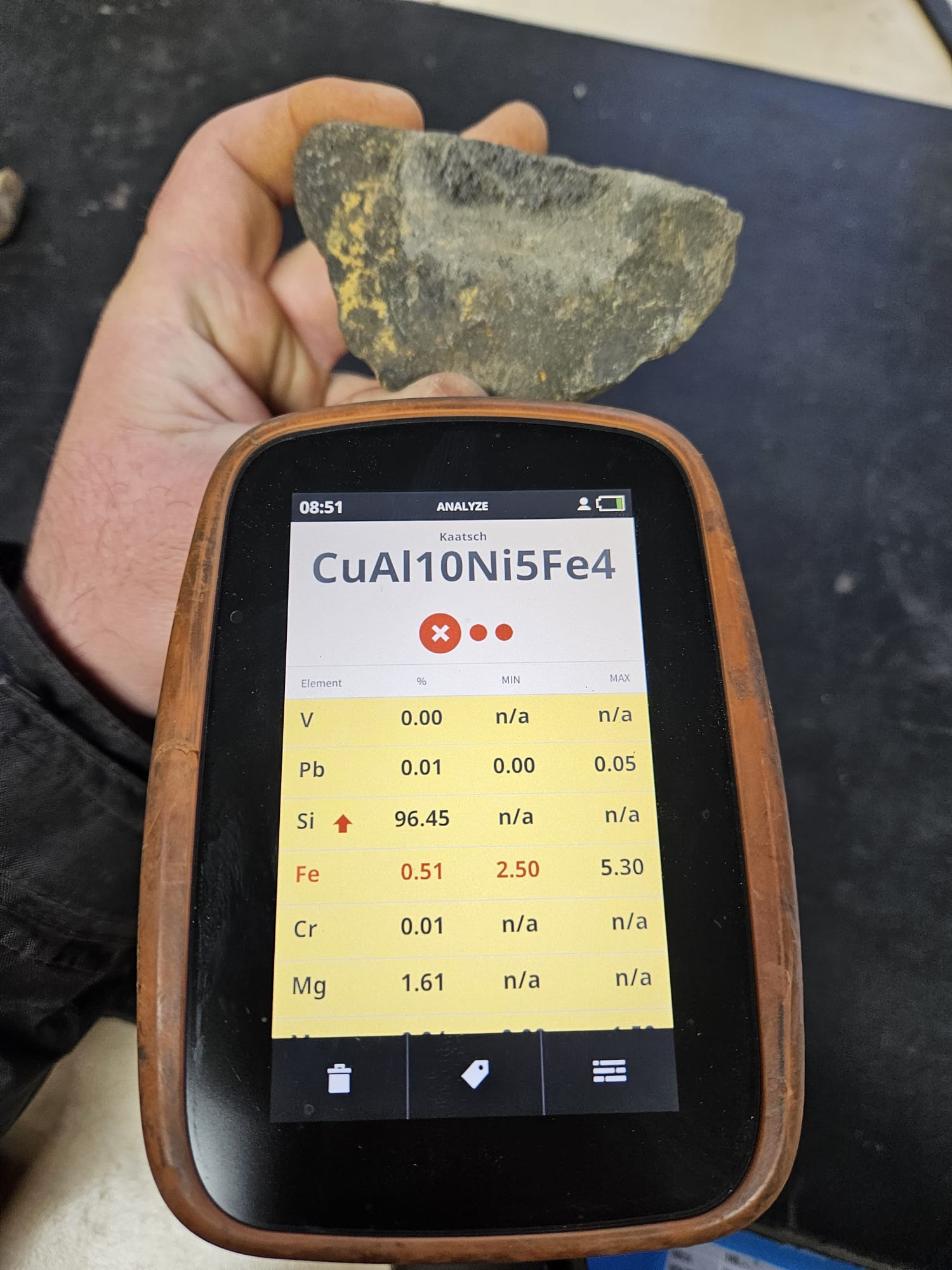 die mehr als 86 %, bzw. 91 % Kobalt sind ein klares Zeichen für eine fehlerhafte Analyse. Das von dir verwendete Gerät wird explizit zur Analyse von Metalllegierungen beworben und dürfte daher für Minerale und Gesteine nicht geeignet sein.