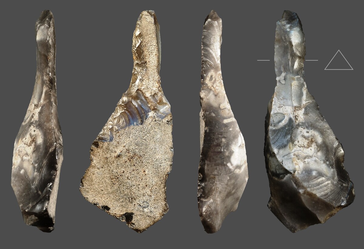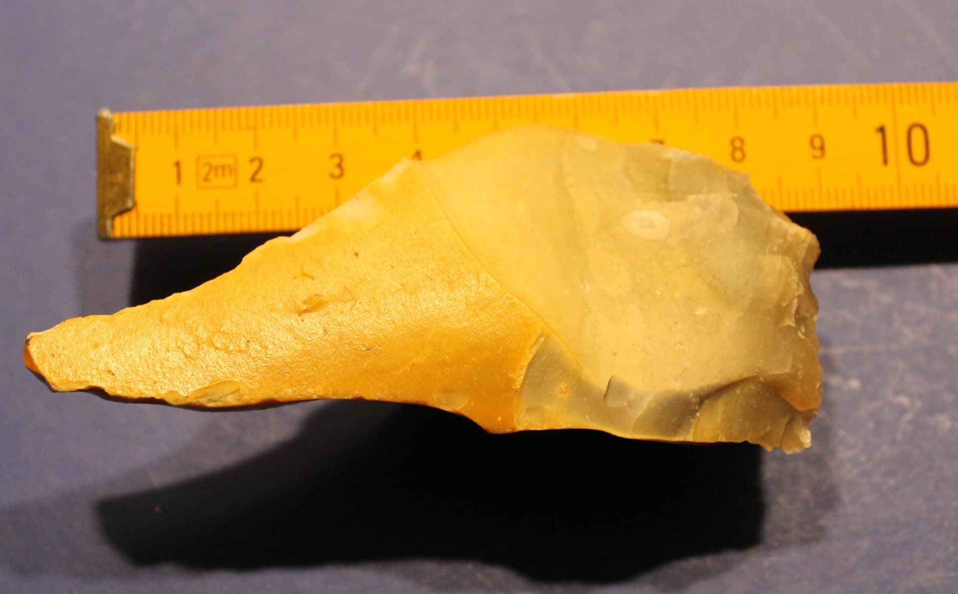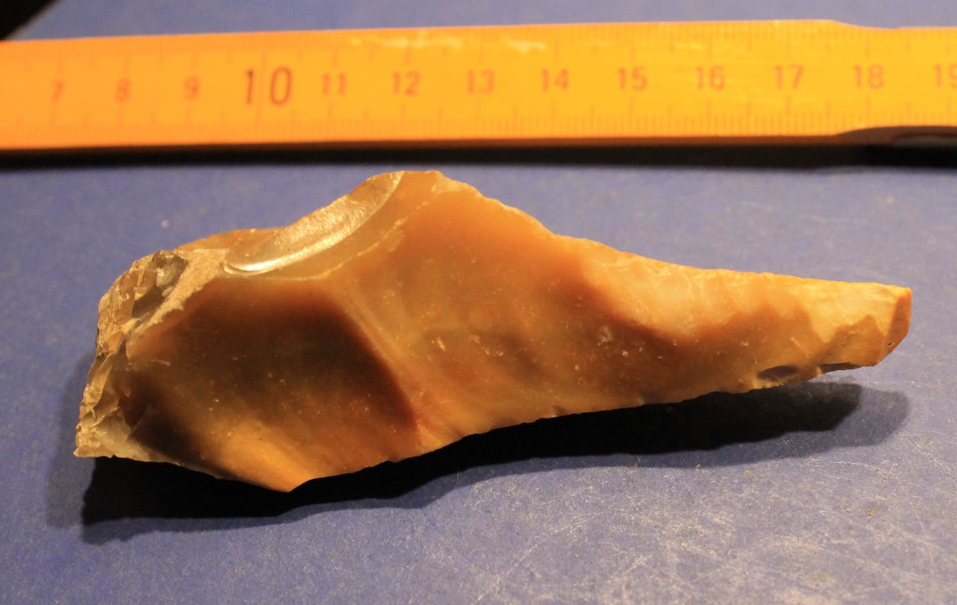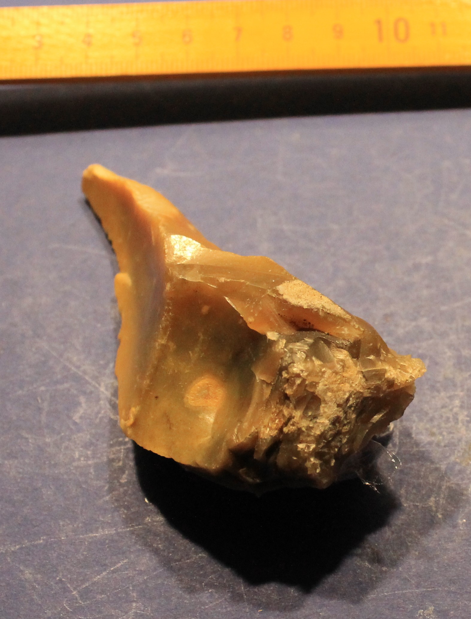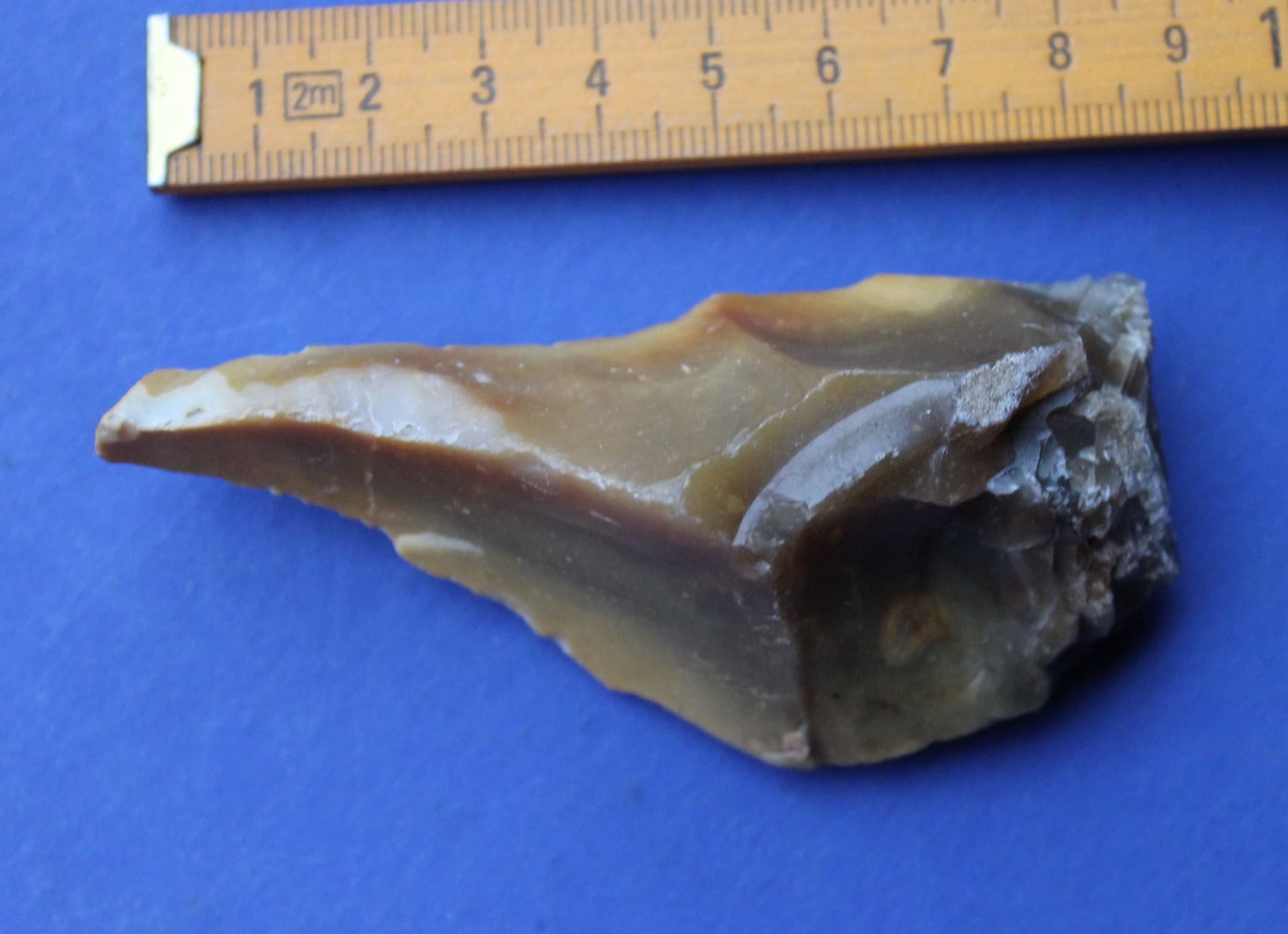 Also z. B. Schlagmerkmale, Zusammenhang mit anderen Artefakten, Material, Dorsalfächen -grate, Wallnerlinien, Bulbus Schlagflächen usw. Es gibt reichlich zu lernen. Abschließend zu diesem Fund möchte ich noch eine Draufsicht (Dorsalseite?) hochladen, ich habe mich nämlich noch nicht völlig von dem Gedanken verabschiedet, dass dieser Fund ein Artefakt ist