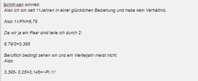 Im Moment geht wieder nichts mit Zitatauszügen und Fotos über die Url einsetzen. Bei Zitaten kann ich danach nicht weiter schreiben oder ich muß den ganzen Beitrag zitieren wie Hugin. Da stimmt doch was mit dem “Logarithmus” oder dem_ “~Pi”_ nicht ???