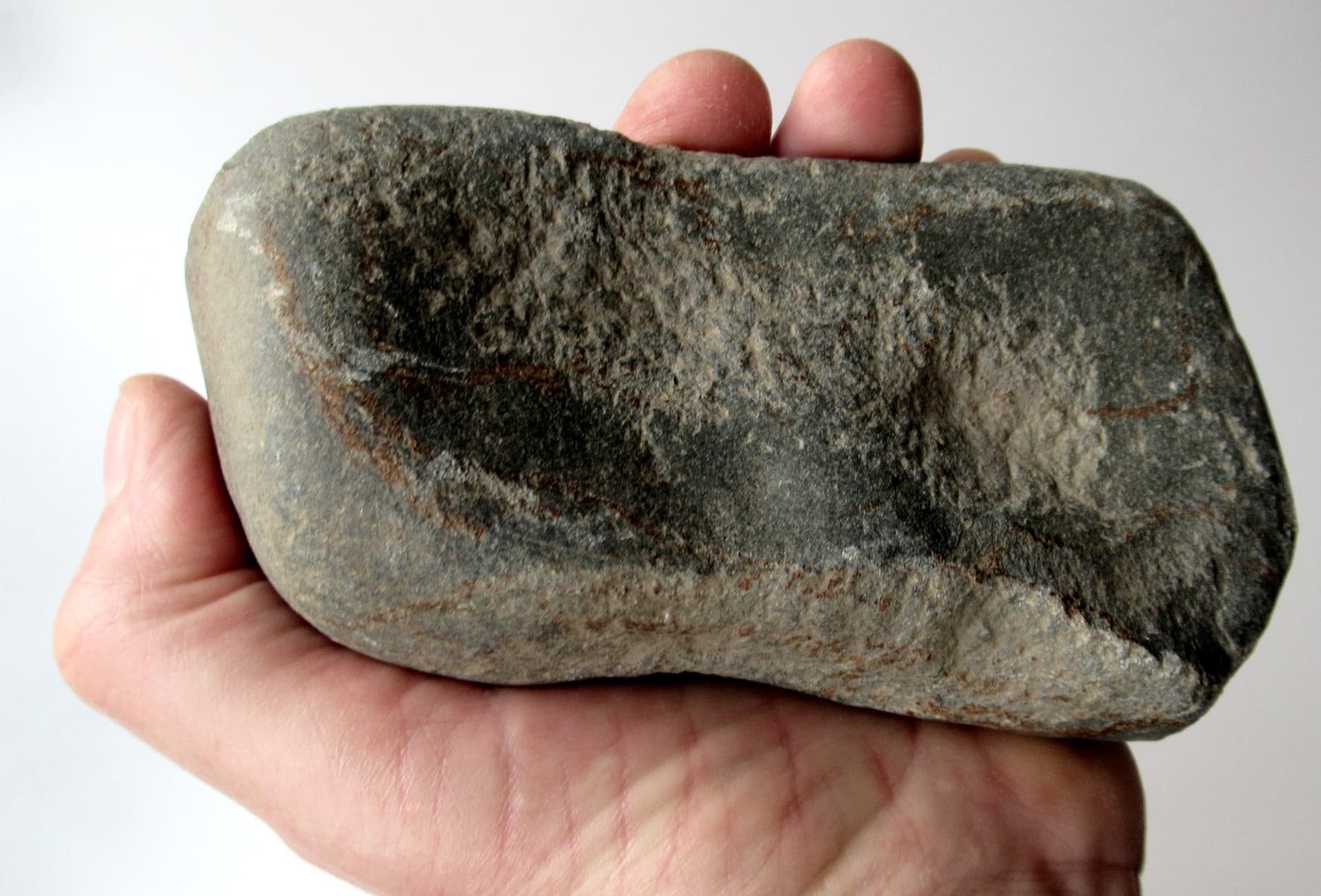 In der Hand liegt der Stein mit 790 g Gewicht sehr gut, er kann aber auch im Boden verkeilt werden.