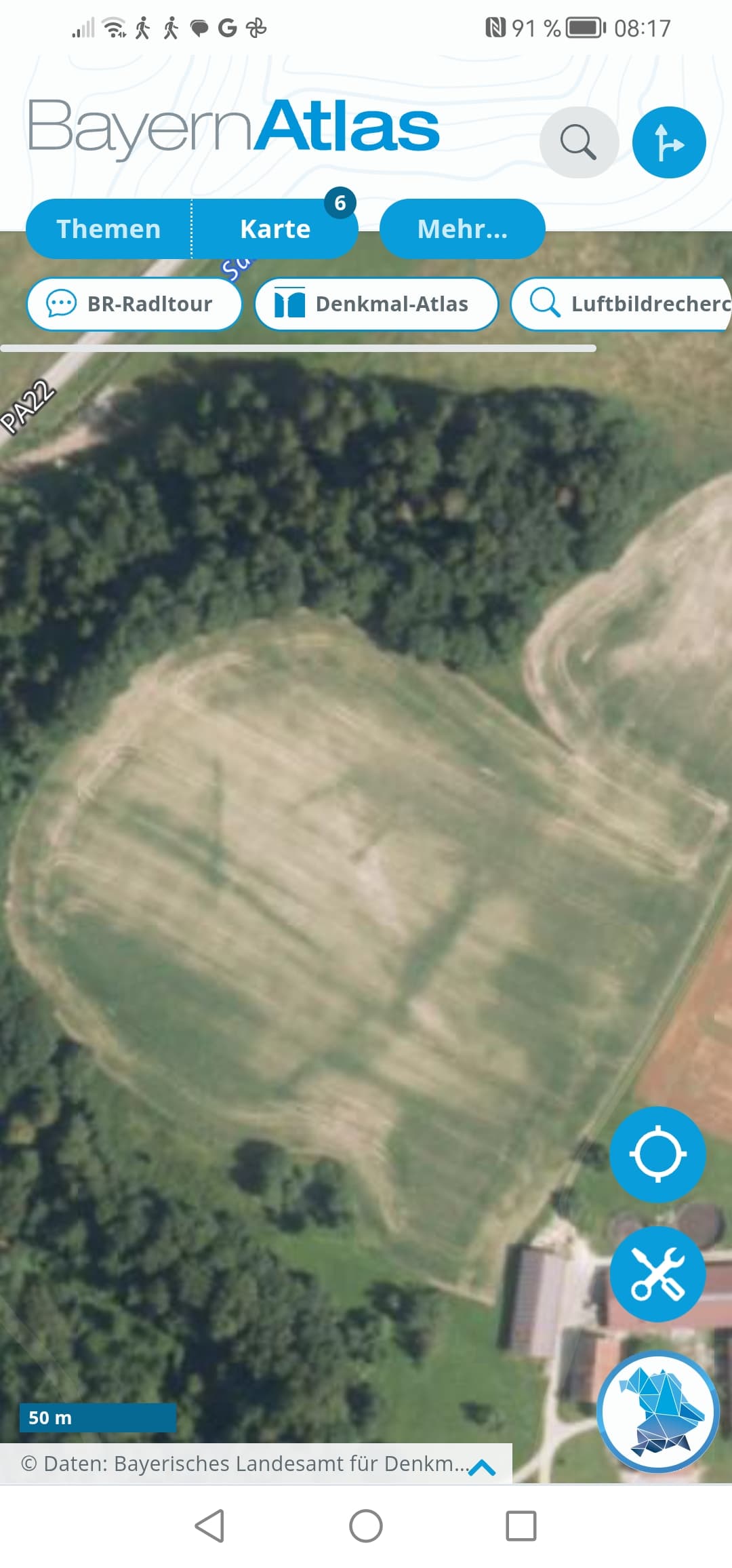 Ich darf jederzeit aufs Feld, die junge Bauersfamilie ist sehr interessiert, glücklicherweise. Der Landwirt meinte auch, er fahre immer über eine Linie, auf der es schubbert, er hat daraus auch schon Ziegel und größere Steine geholt und fragt sich, ob da vielleicht ein Weg verlaufen ist, denn so etwas findet er sonst nicht dort oben. Ich muss mal Karten wälzen, und auch ältere Luftbilder - danke für den Tipp! - vielleicht kann ich ja was erkennen. Das Landesamt hat gefragt, ob ich mir das mal anschauen möchte, weil eben noch niemand bis jetzt dort war und sie gar nicht über den Ort wissen und es keine Funde gibt, nur die Luftbilder.