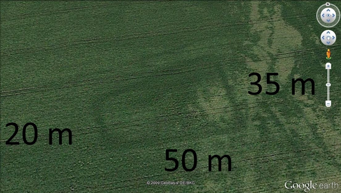 Ich habe neulich nur ca. 2 m entlang des linken Rands abgelaufen, momentan wächst dort eine verkümmerte Zwischenfrucht, die erst wegen der Hitze und dann wegen des sintflutartigen Regens bei uns nciht recht gedeiht, ich kann also drüberlaufen. Evtl. wollten sie demnächst nochmal pflügen und neu ansähen, ich hoffe, ich schaffe das Feld vorher noch, ist grad kein Spaß bei der Hitze, und ist alles grau.