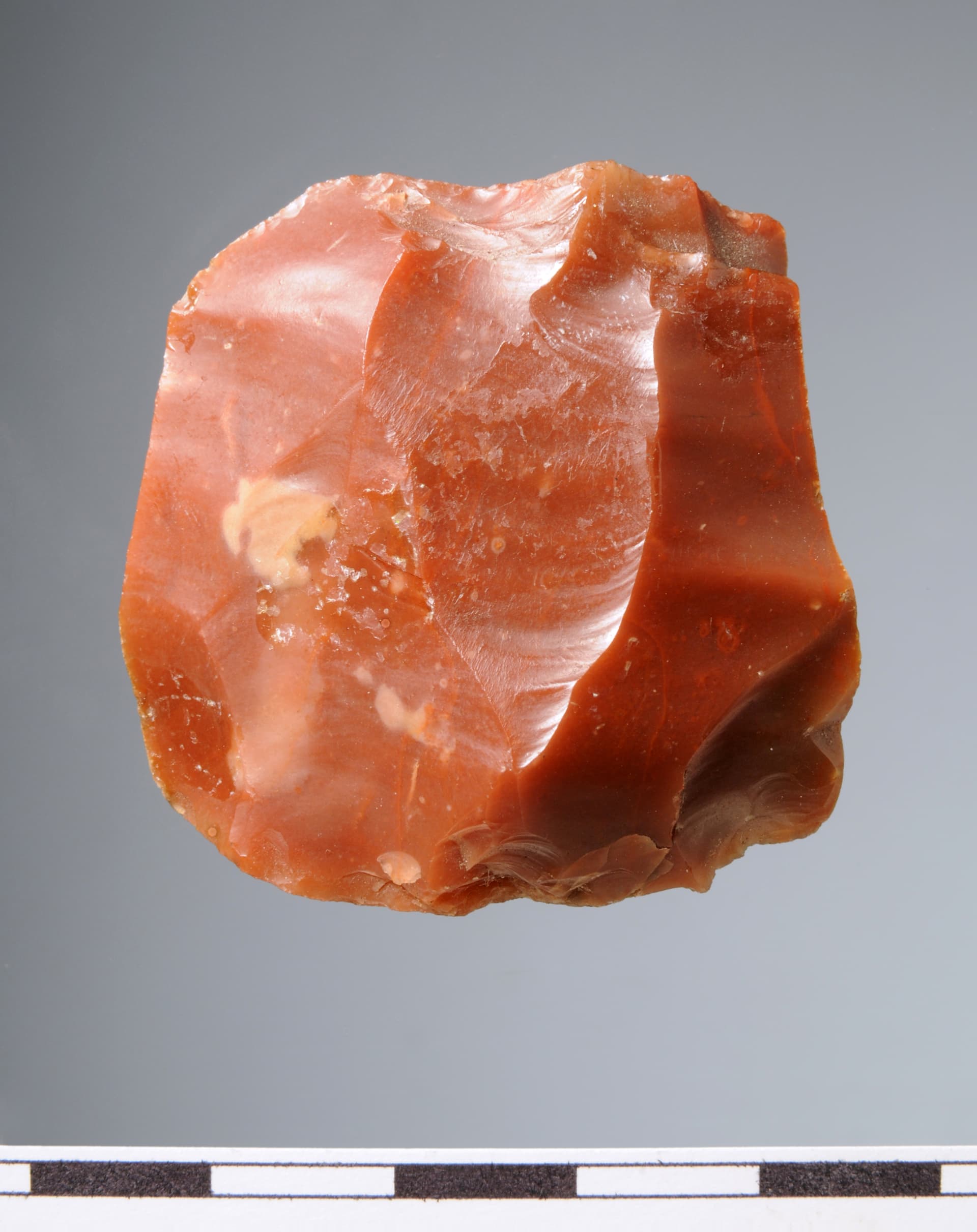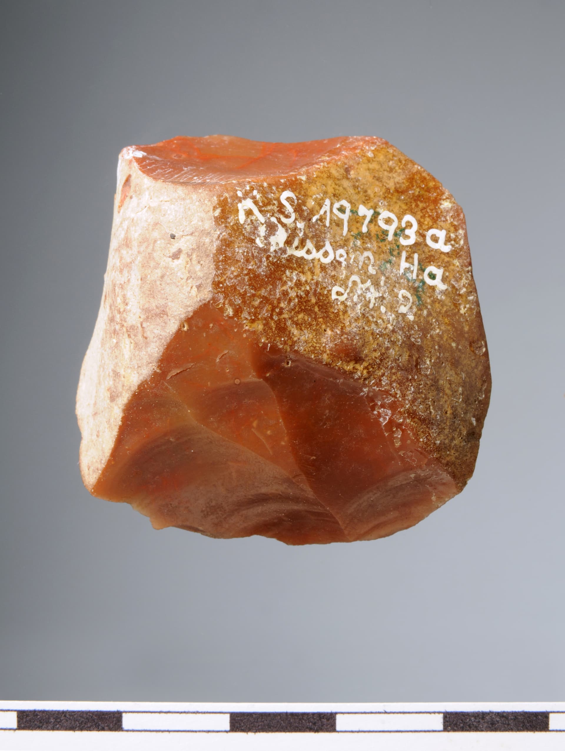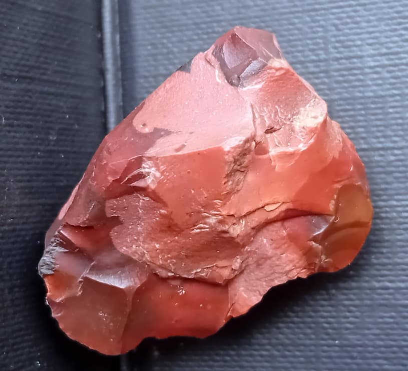 Zu den bemerkenswertesten Fundstücken aus rotem Helgoländer Flint zählen neben dem in Abschnitt 2 im Beitrag # 11 von mir vorgestellten Bohrer und einer Raspel sicherlich das nachfolgende Objekt, welches nur gut 3 cm misst und möglicherweise als Klingenkern anzusprechen ist :
