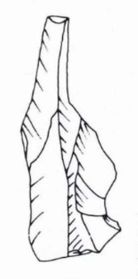Seine besondere Bedeutung erfährt dieses Fragment dadurch, dass Taute bereits 1970 das Fragment einer baugleichen Klinge publizierte, welche im ahrensburgerzeitlichen Lagerplatz in Volkmarshausen III, einem Stadtteil von Hannoversch Münden, freigelegt worden war. (14) Taute nahm an, dass es sich bei der Station Volkmarshausen III um einen Winterplatz der Hamburger Eggstedt-Stellmoor-Gruppe handeln könnte. Da das von Taute publizierte Fundstück inzwischen verloren gegangen zu sein scheint, wird es hier mit freundlicher Genehmigung von Jaap Beukers anhand einer von R. Aalders gefertigten Zeichnung (15) gezeigt: